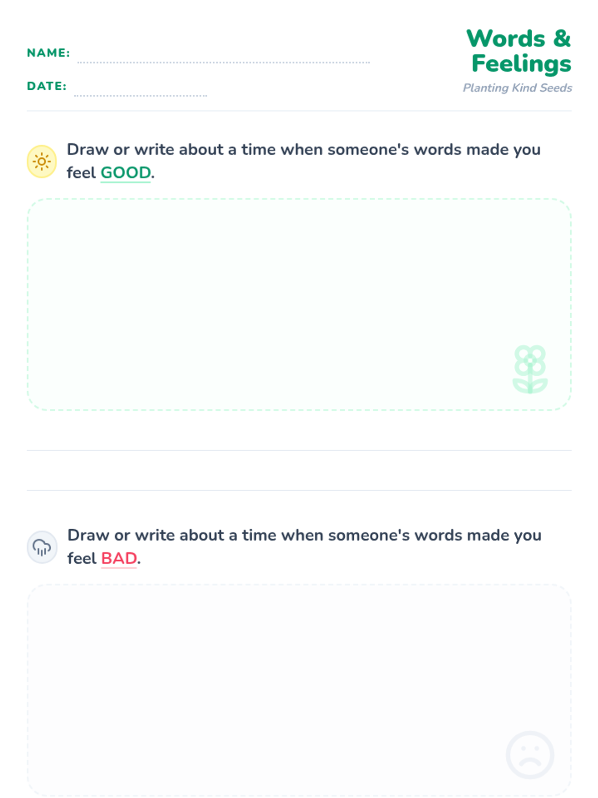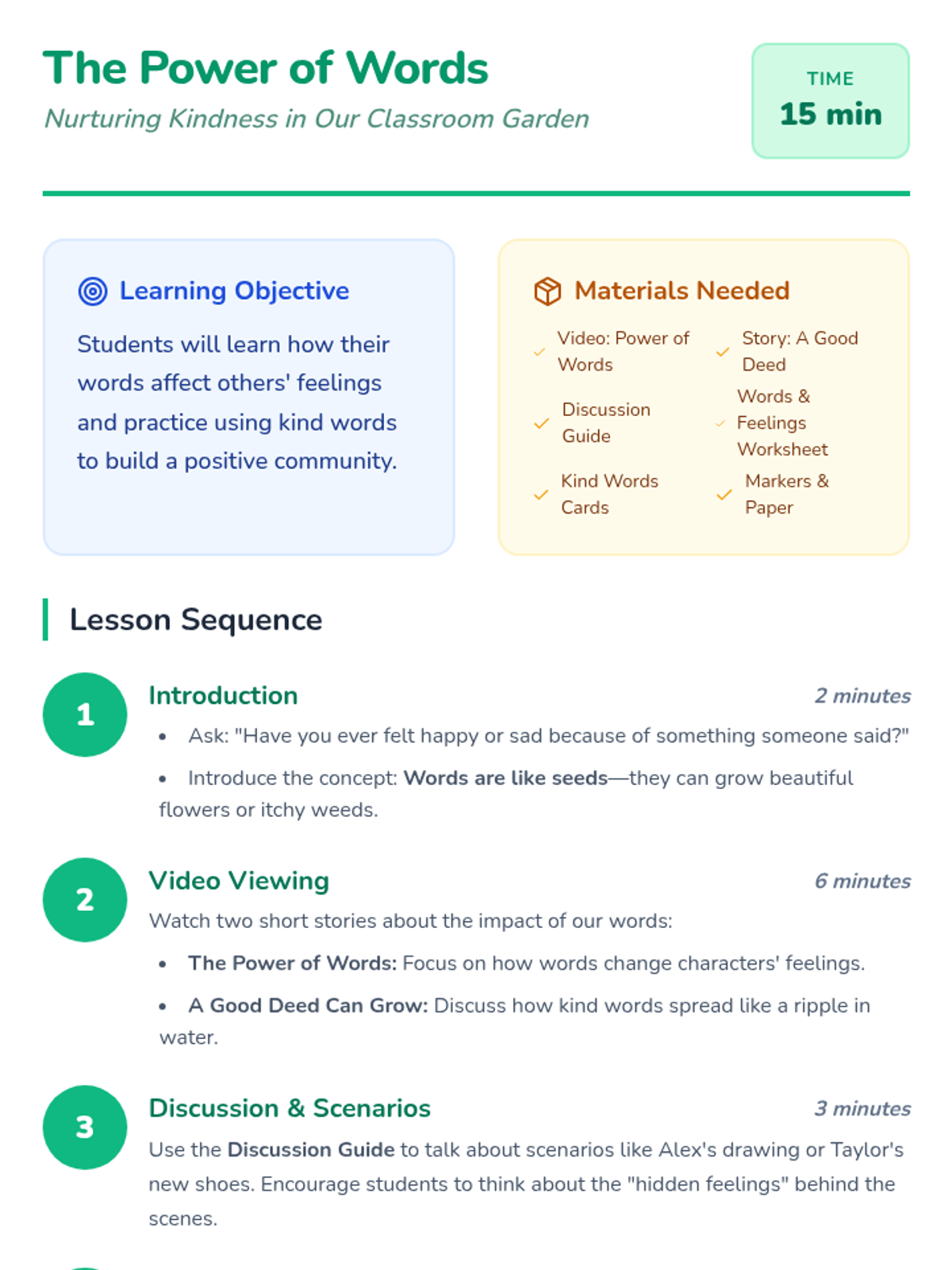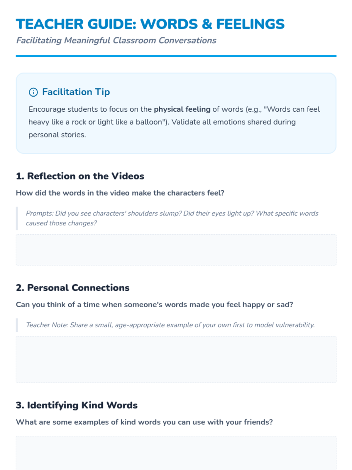Students explore how words impact others through videos, discussion, and hands-on activities, fostering empathy and kindness in the classroom.
