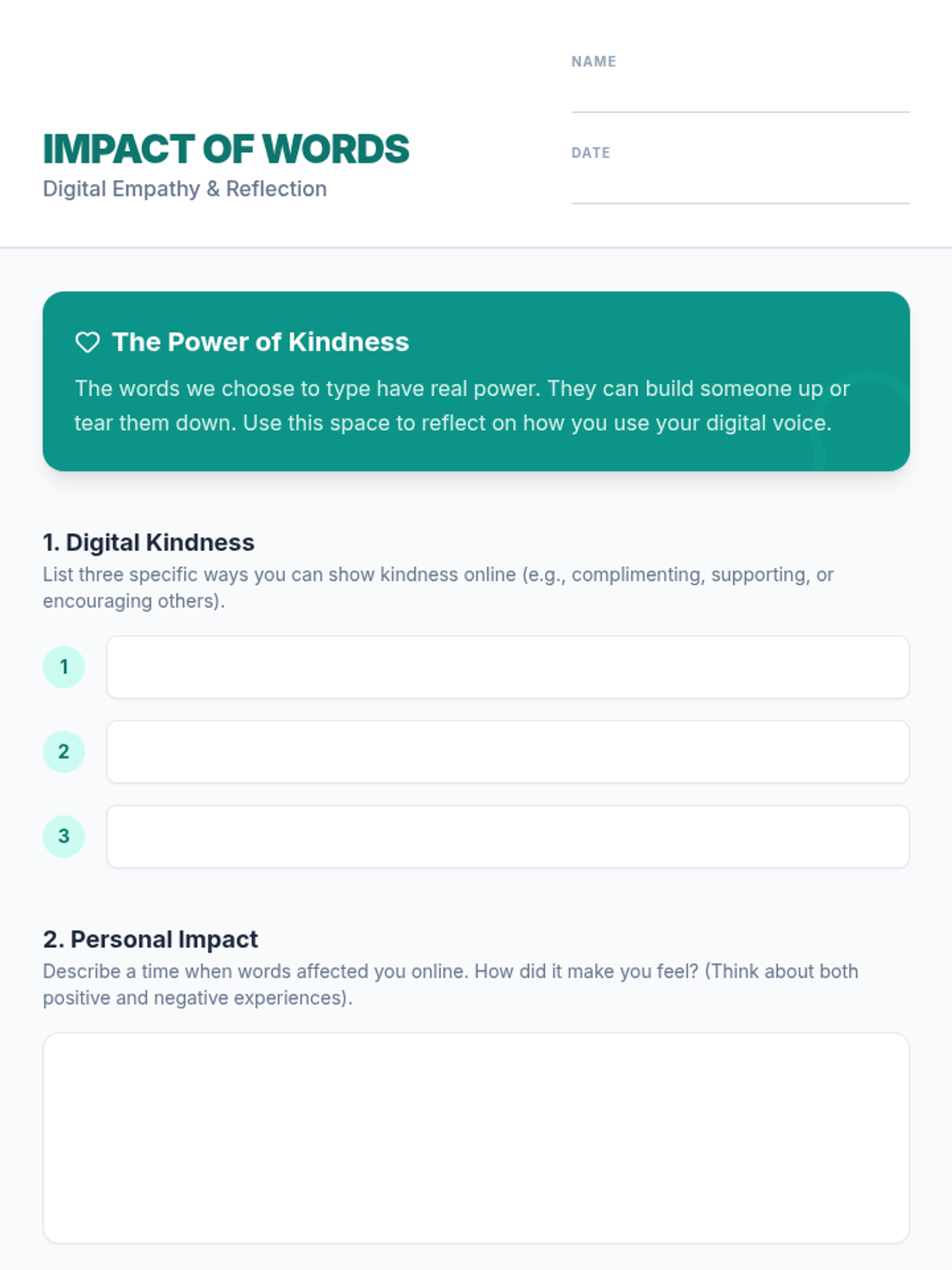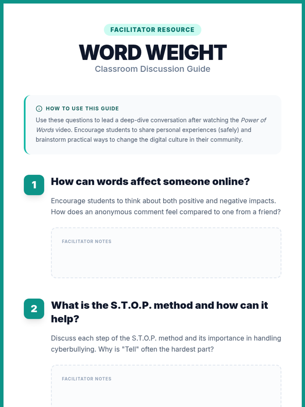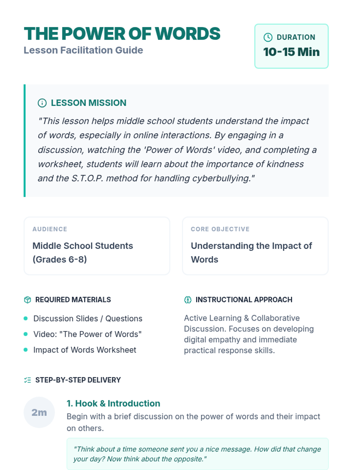 This lesson helps middle school students understand the impact of words in online interactions, focusing on digital empathy, kindness, and the S.T.O.P. method for responding to cyberbullying. Students engage in discussion, watch a short video, and reflect through a guided worksheet.