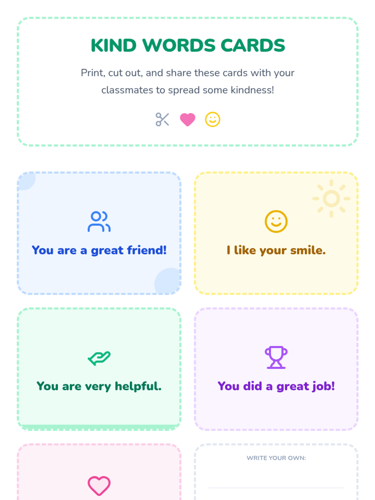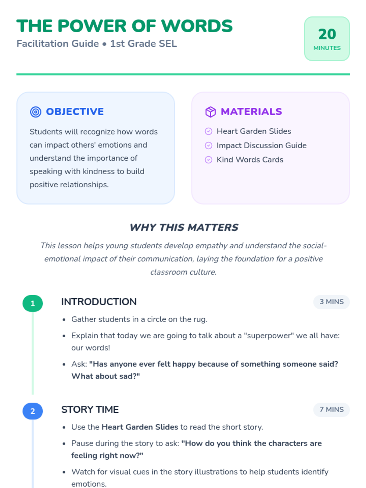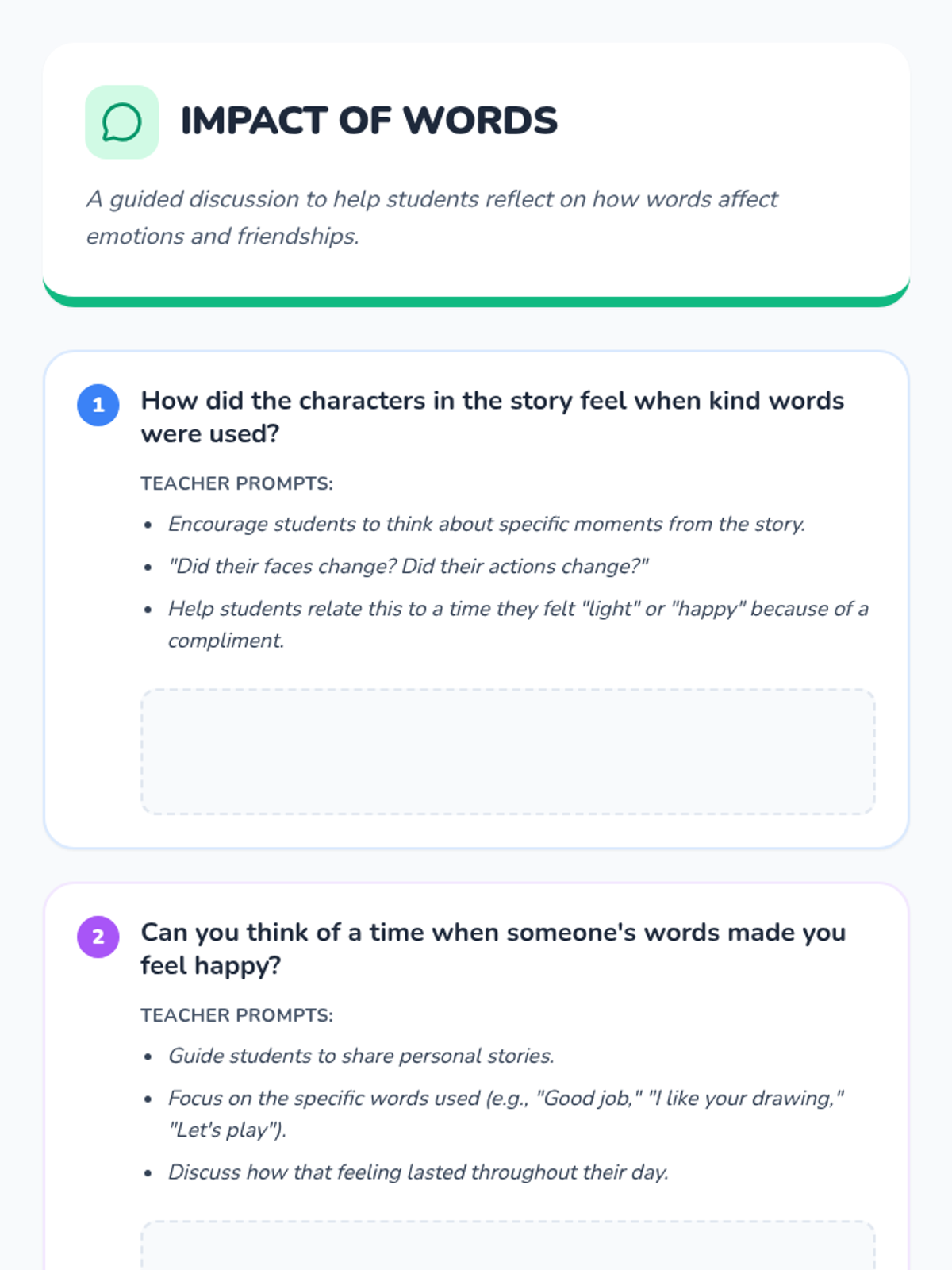 A social-emotional learning lesson for 1st grade that explores the impact of words on feelings and relationships through a story, discussion, and kind word exchange.