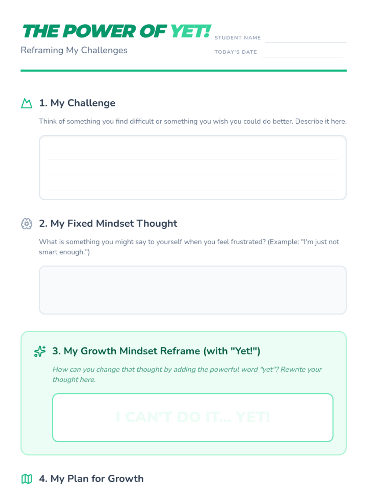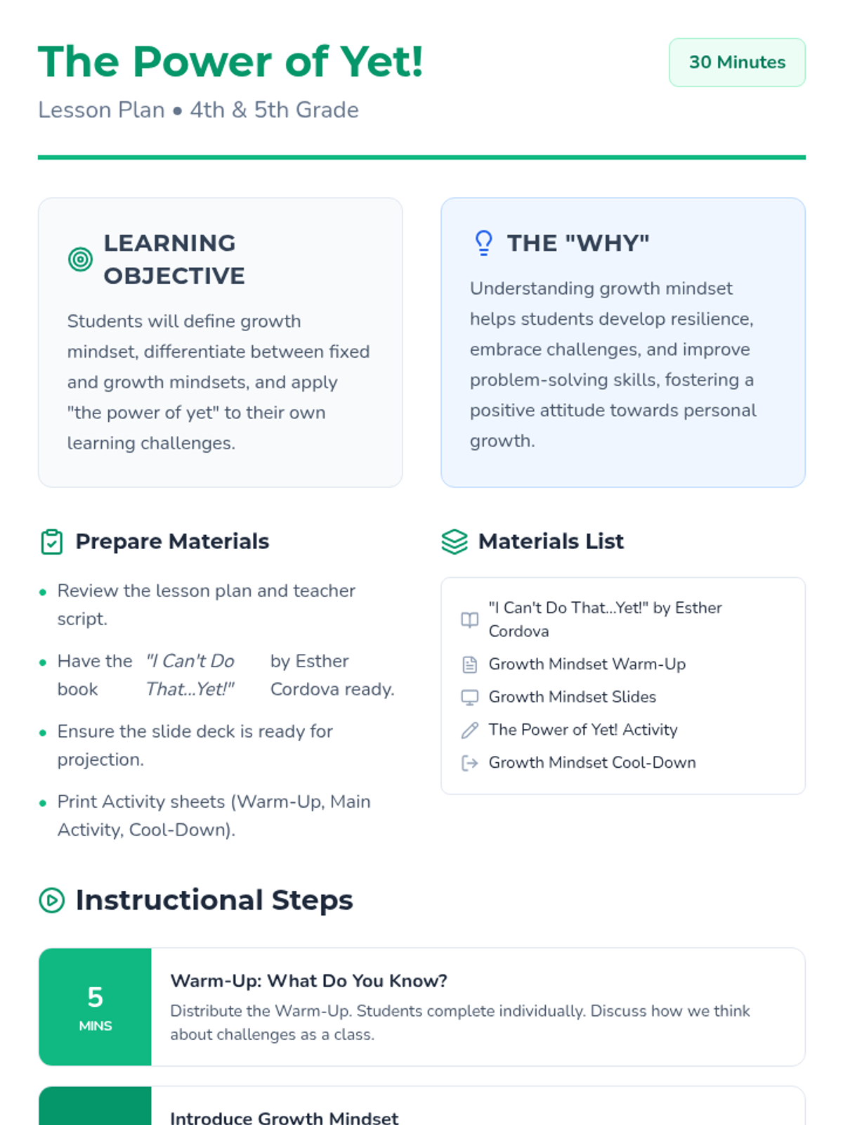 A 30-minute lesson for 4th and 5th graders introducing growth mindset through the book 'I Can't Do That...Yet!'. Students learn to reframe challenges using the word 'yet' and differentiate between fixed and growth mindsets.