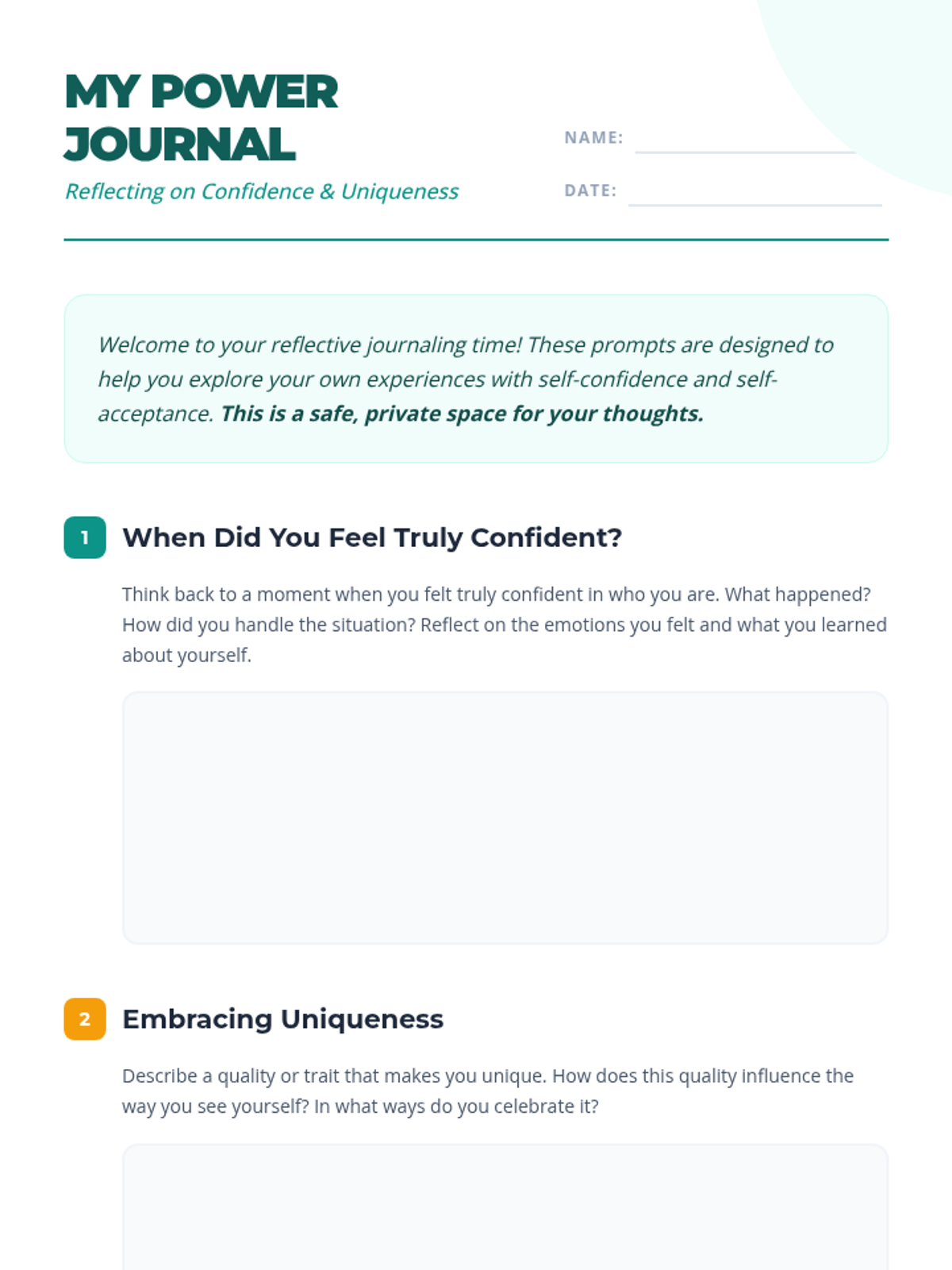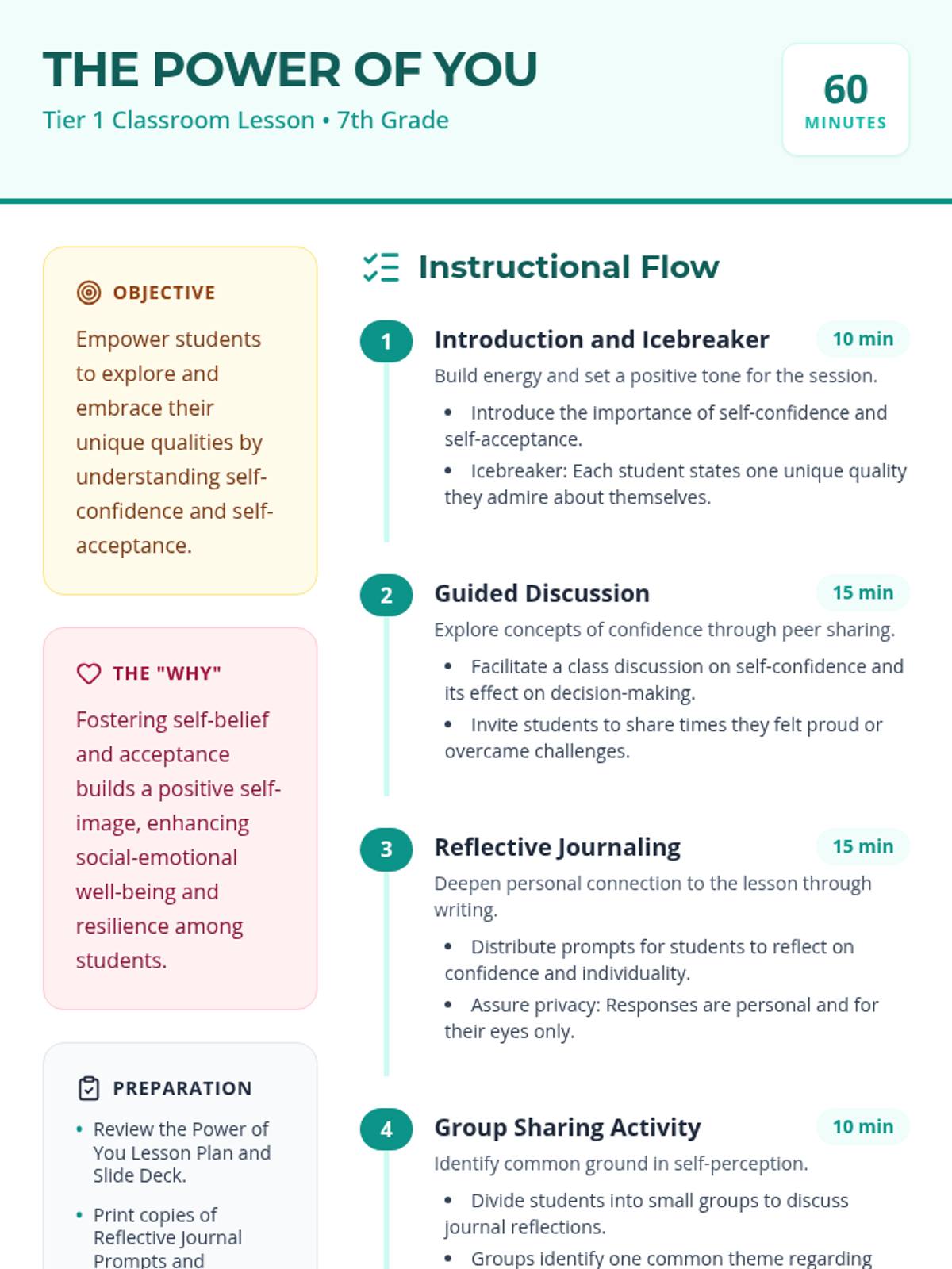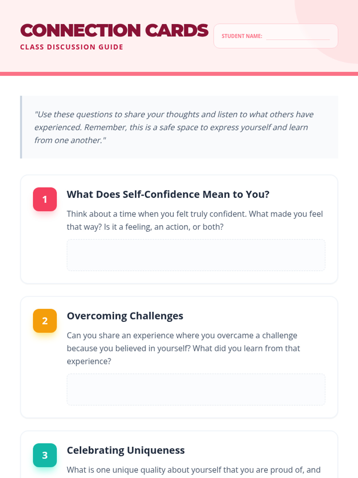 A comprehensive lesson for 7th-grade students focused on building self-confidence and self-acceptance through reflection and discussion.