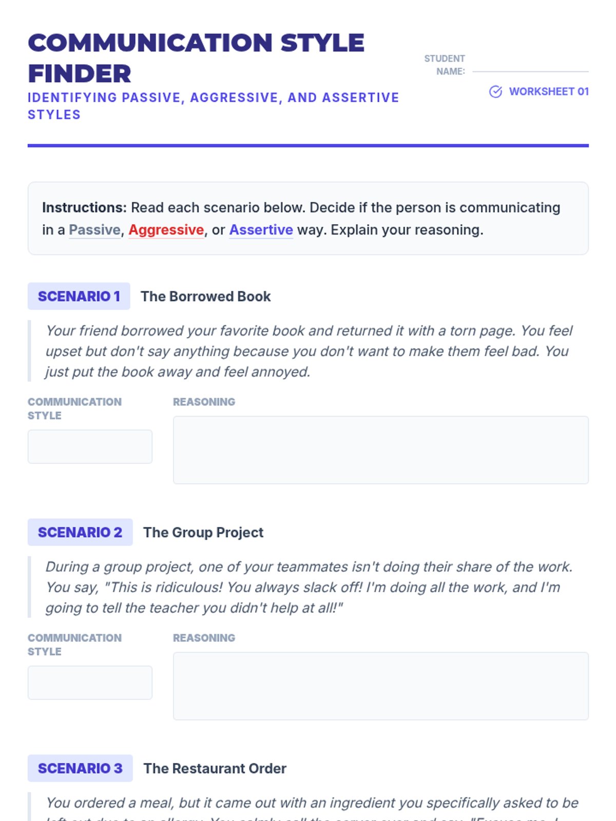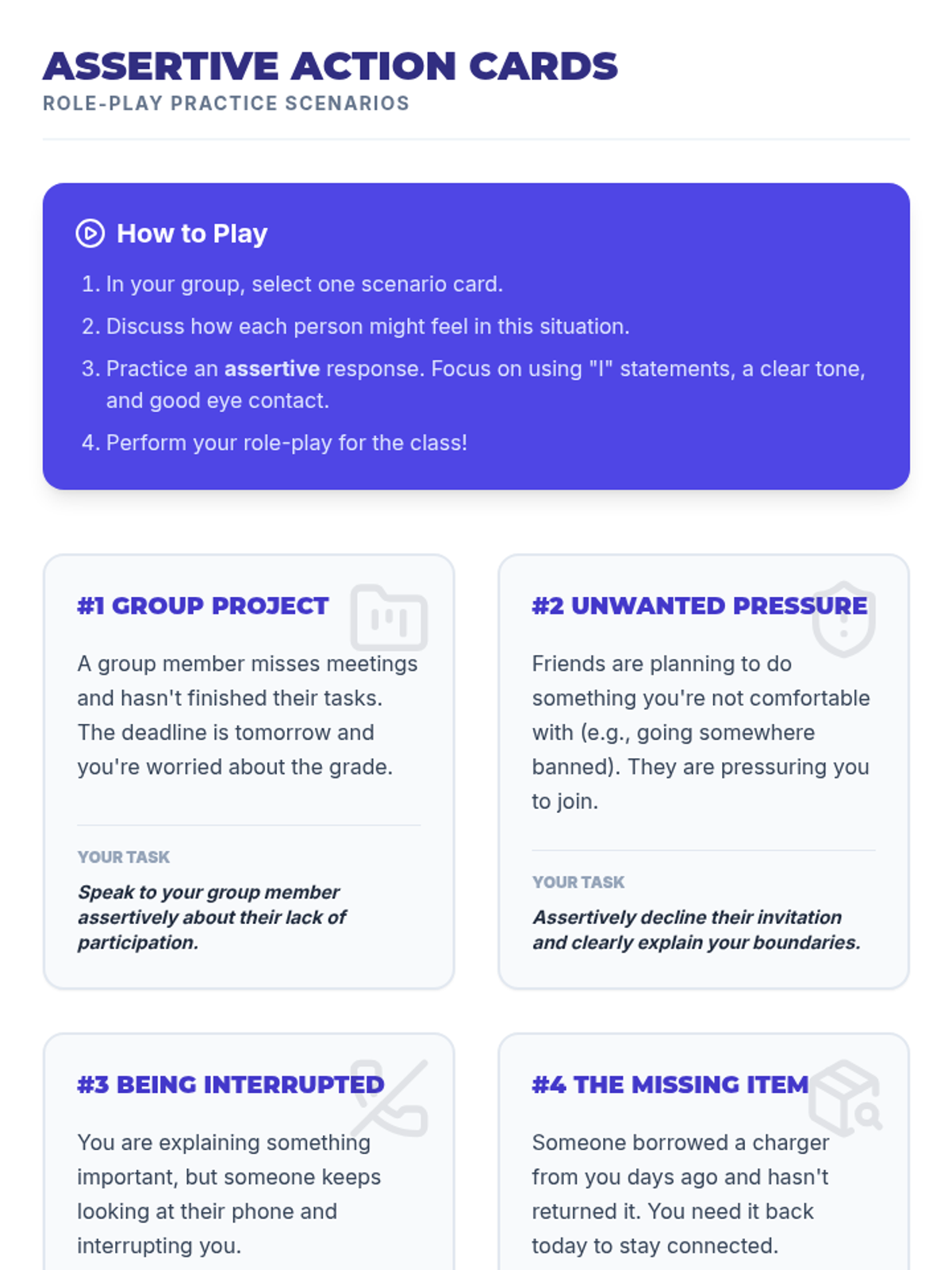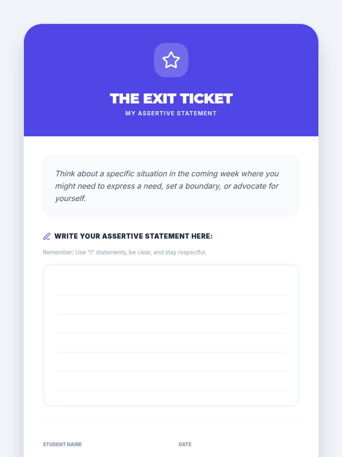 An empowering 60-minute lesson for 8th graders on assertive communication, self-advocacy, and setting boundaries respectfully. Students explore passive, aggressive, and assertive styles through interactive role-play and reflection.