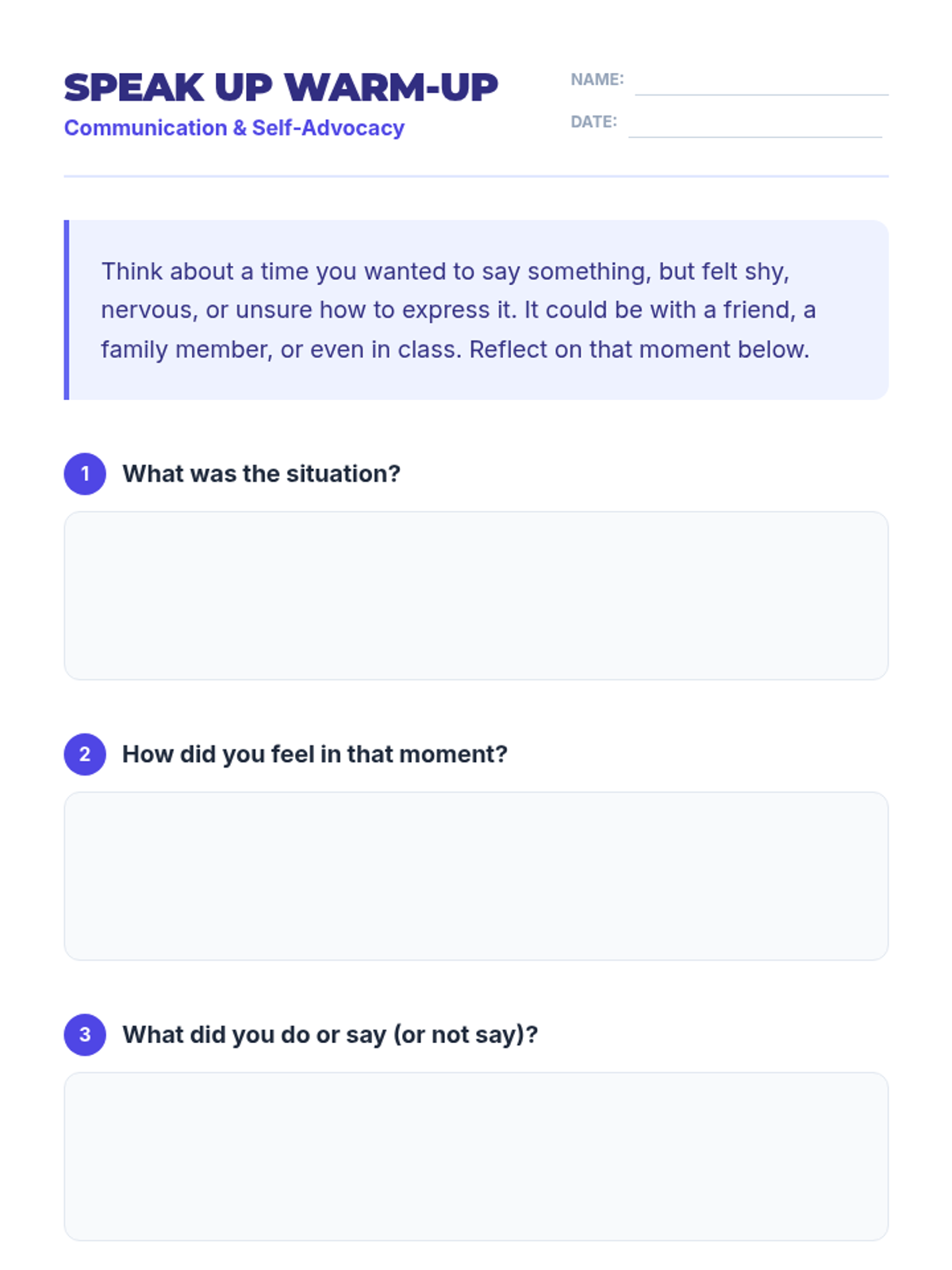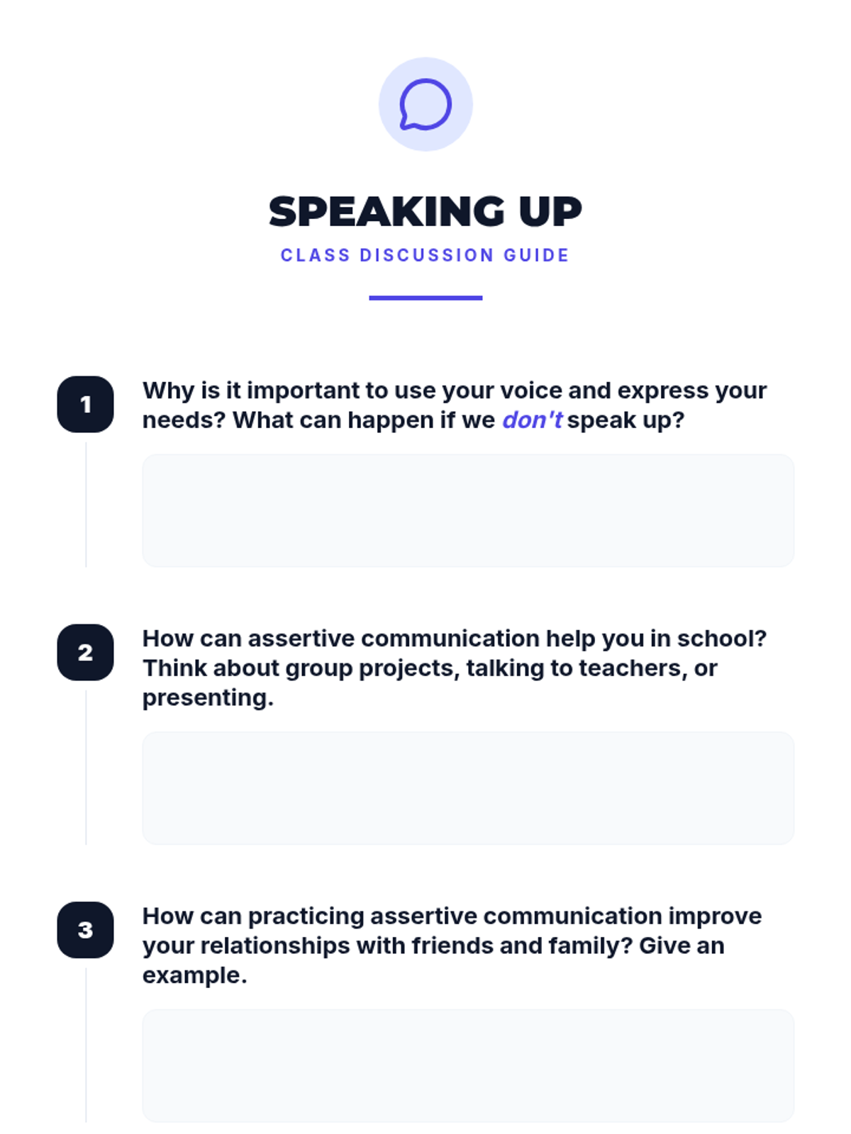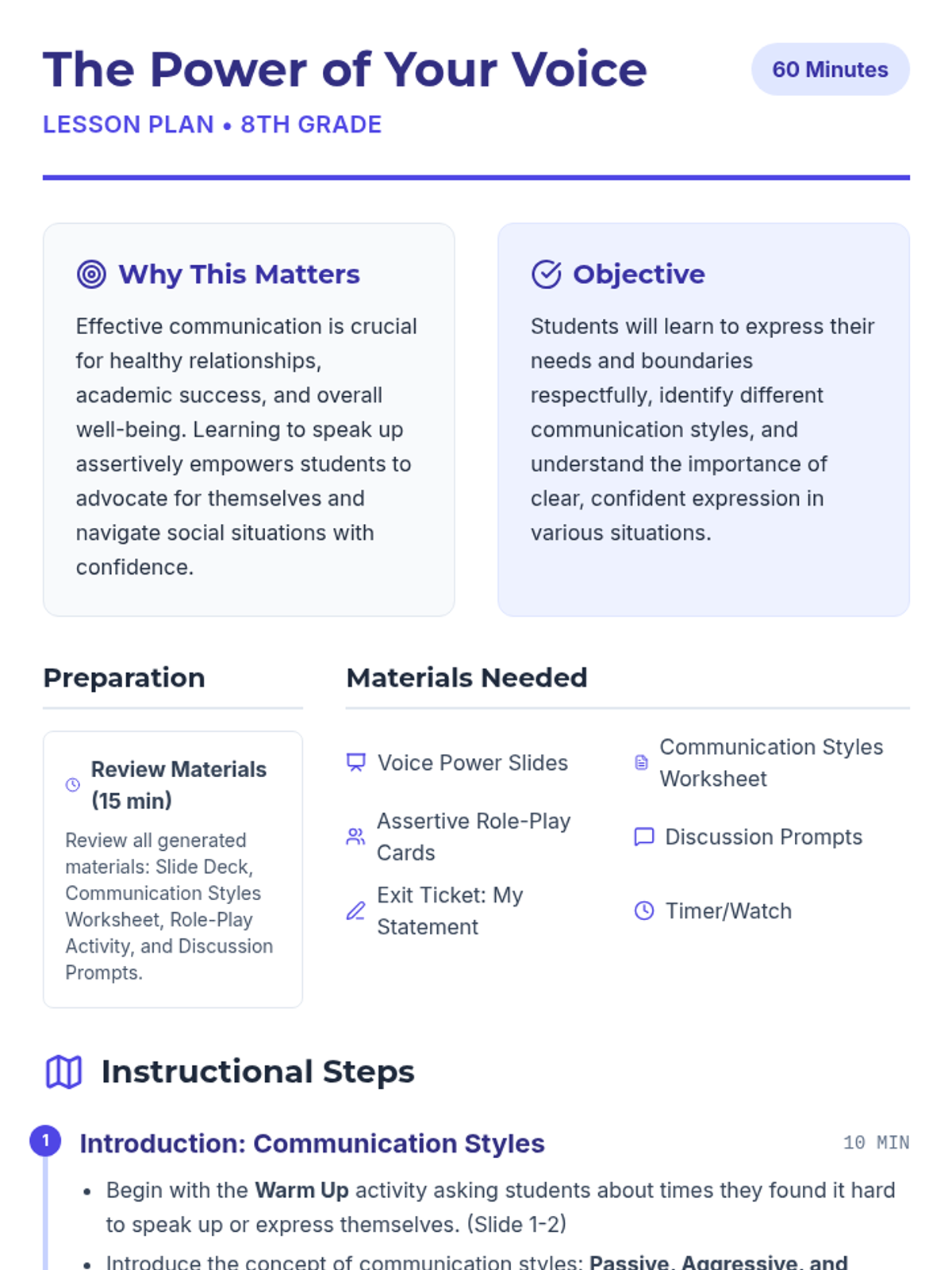 An empowering 60-minute lesson for 8th graders on assertive communication, self-advocacy, and setting boundaries respectfully. Students explore passive, aggressive, and assertive styles through interactive role-play and reflection.