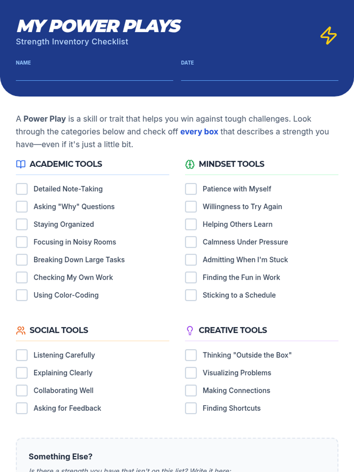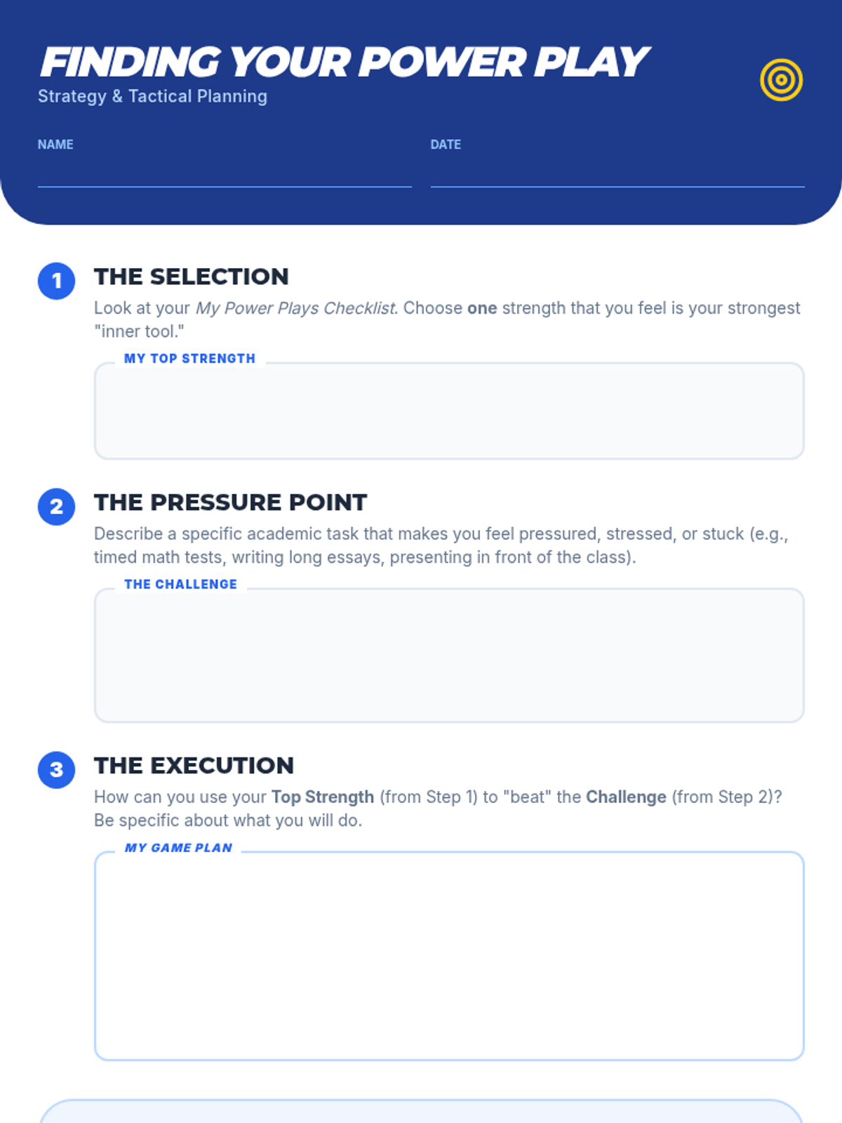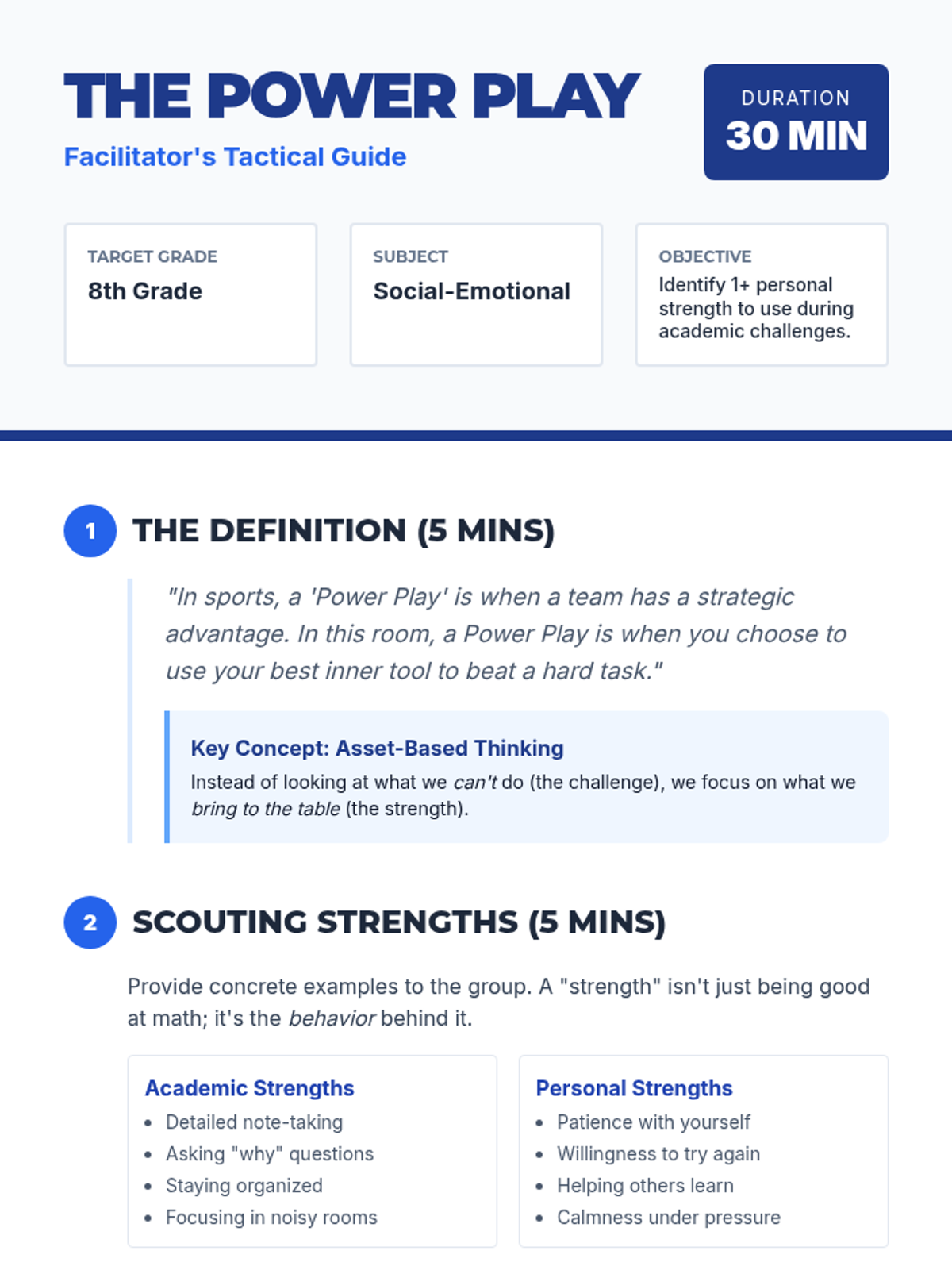 A 30-minute social-emotional learning lesson for 8th graders focused on identifying and utilizing personal strengths to navigate academic challenges. Students transition from defining internal 'power plays' to creating a personal strategy for high-pressure situations.