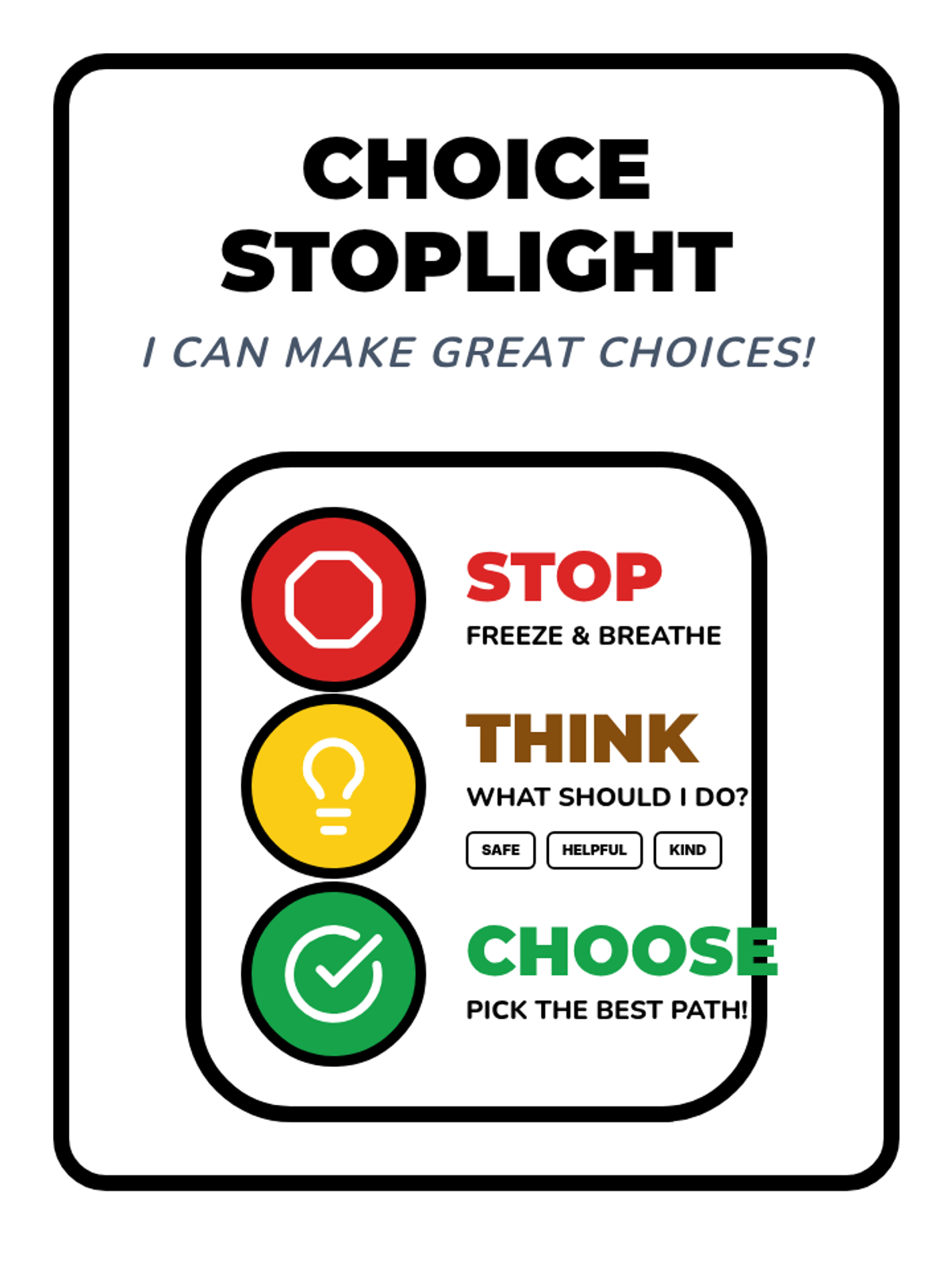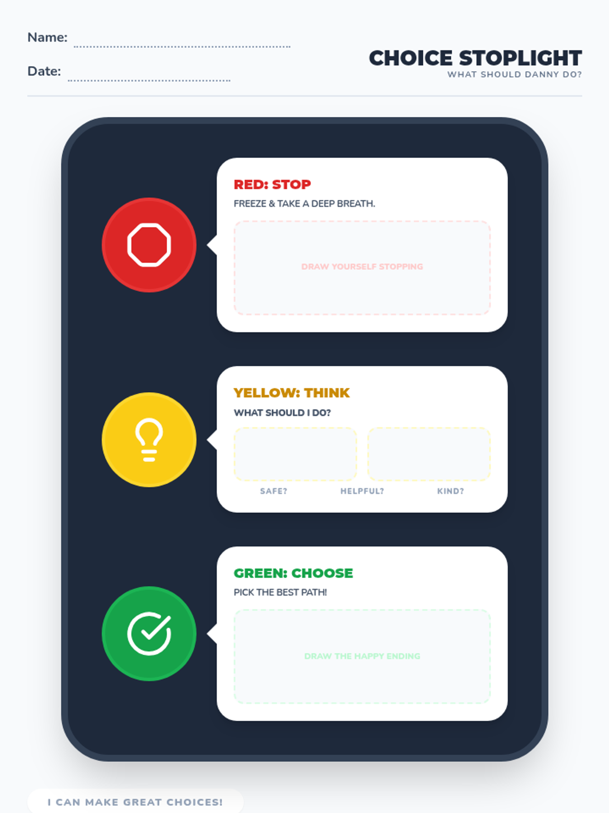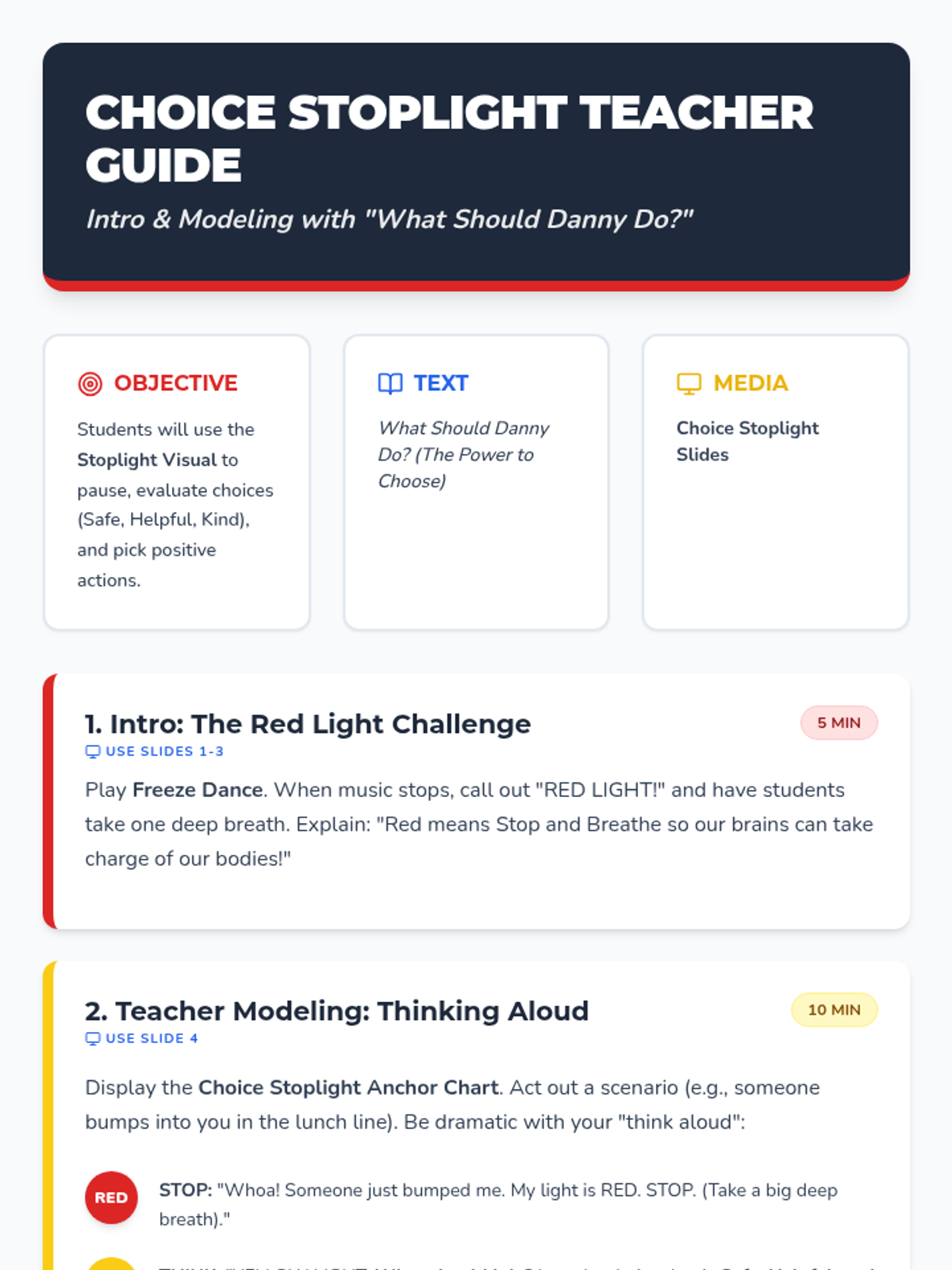 A 1st-grade lesson focused on the 'Stop, Think, Choose' framework using the book 'What Should Danny Do?'. Students learn to identify their 'Power to Choose' and practice pausing before acting in various scenarios.