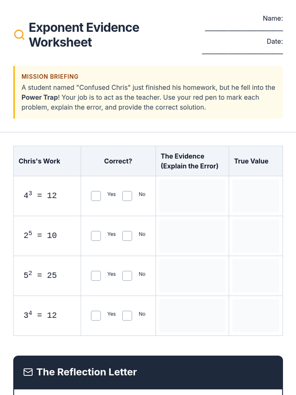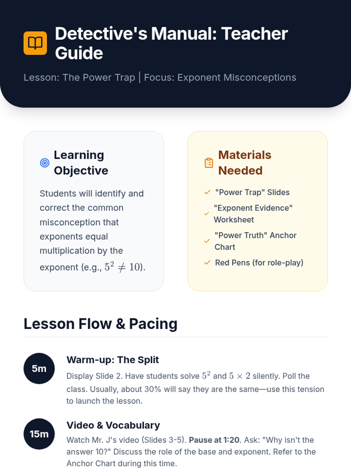 A 6th-grade math lesson focused on debunking the common misconception that exponents represent basic multiplication. Students will analyze video evidence, create a visual anchor chart, and act as 'math detectives' to correct errors in exponential expressions.