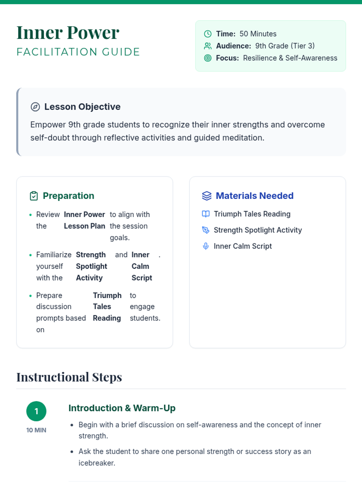 A Tier 3 individual counseling lesson designed for 9th graders to identify personal strengths, build resilience, and overcome self-doubt through visualization and meditation.