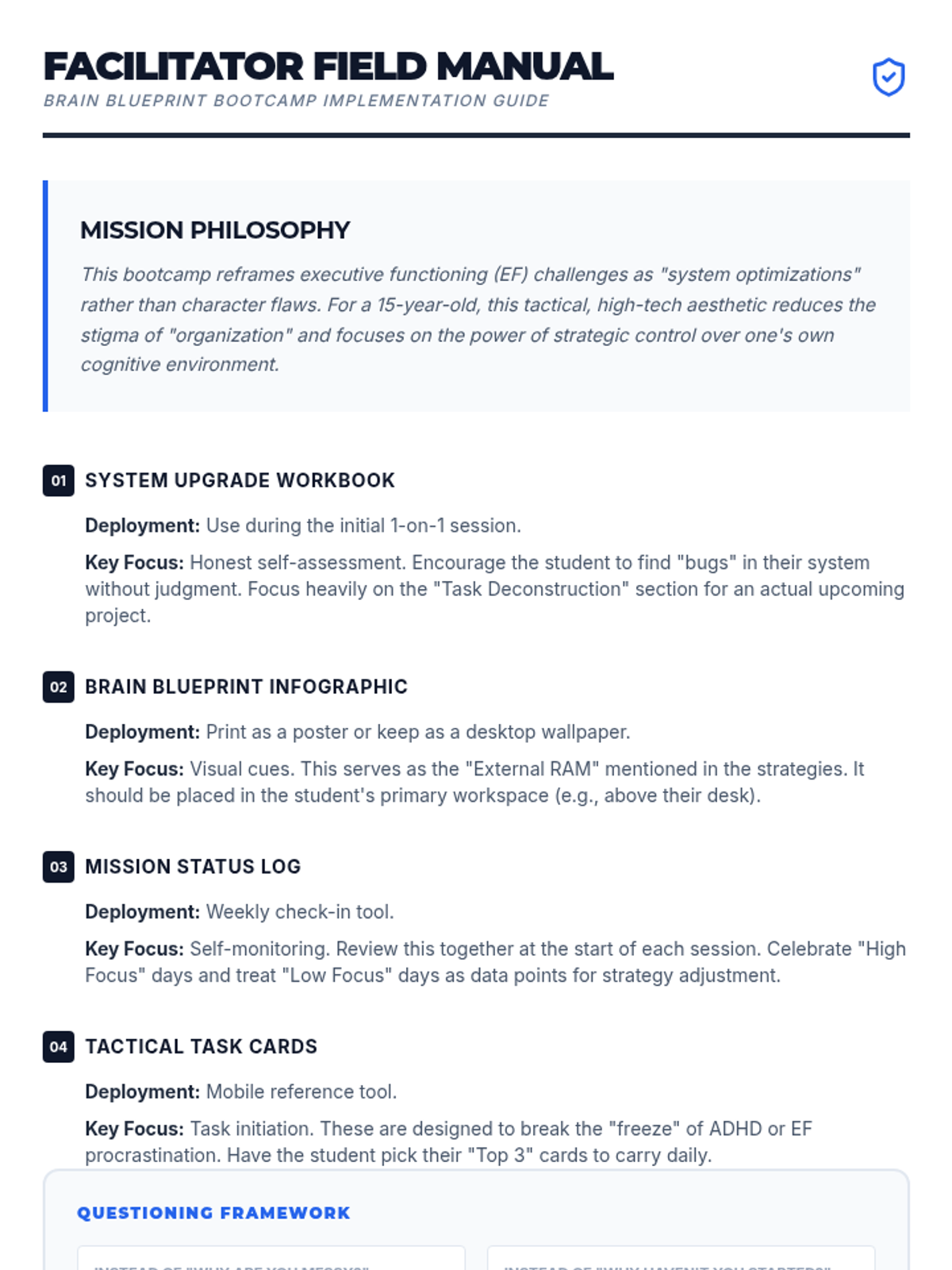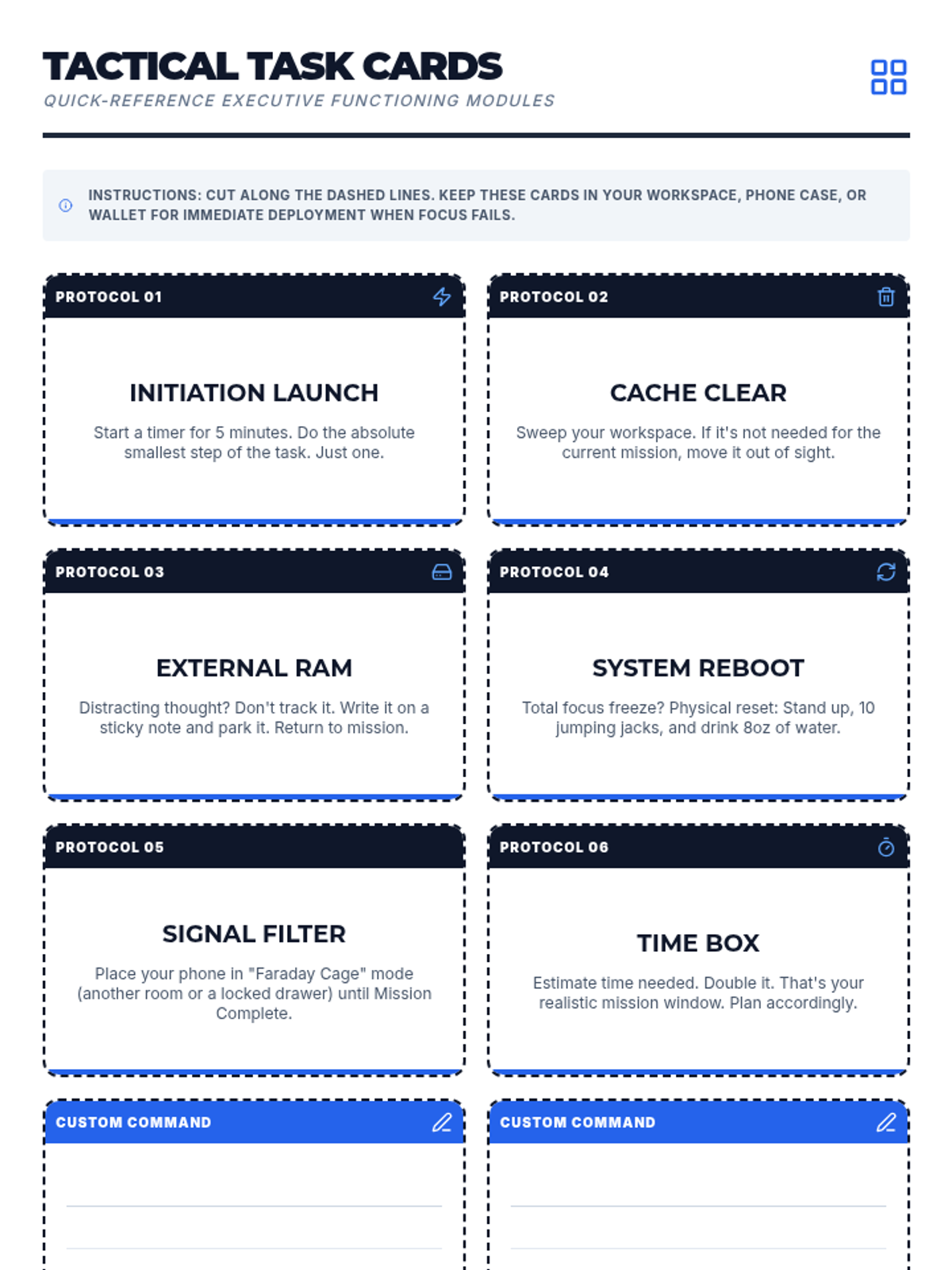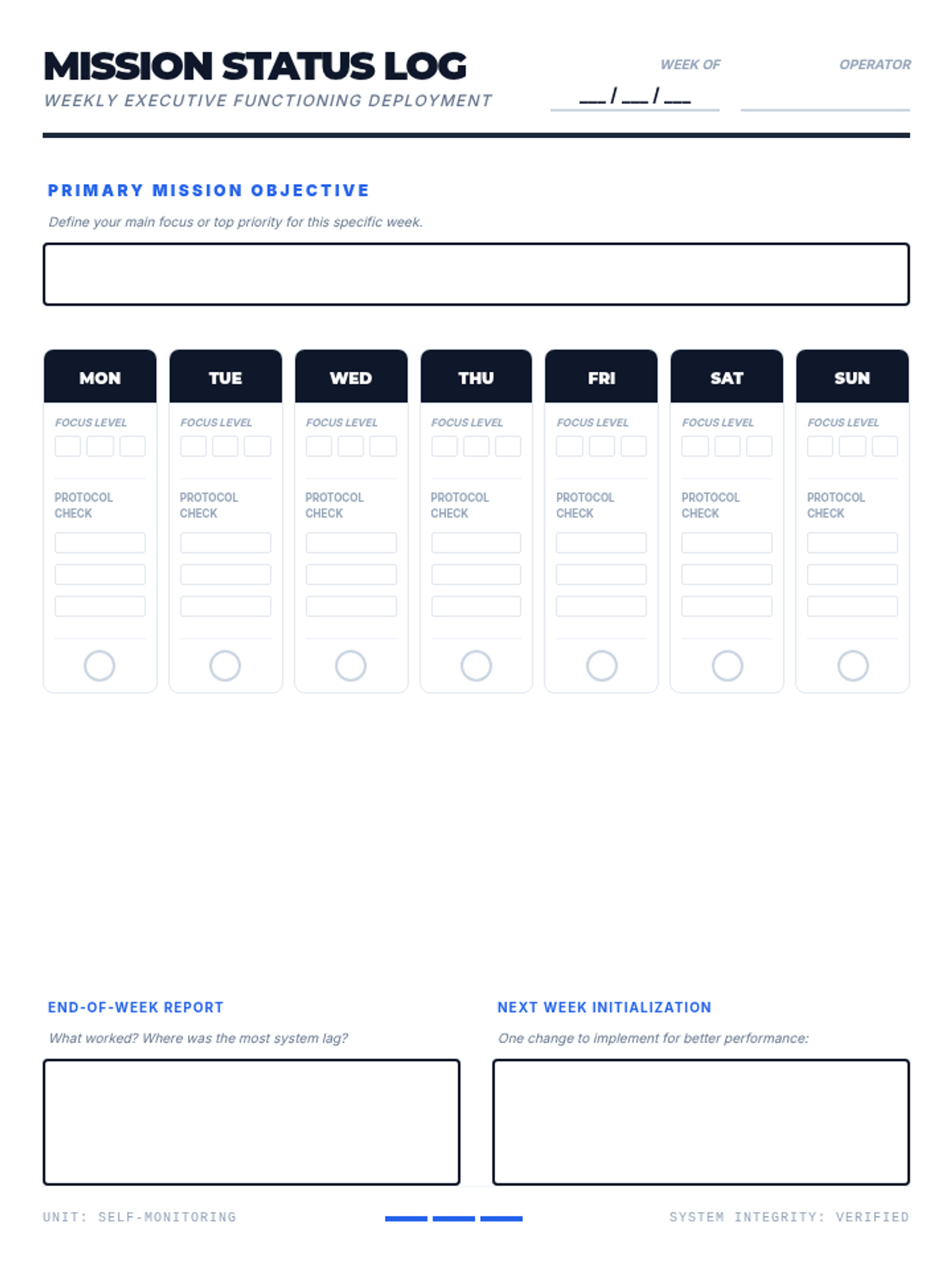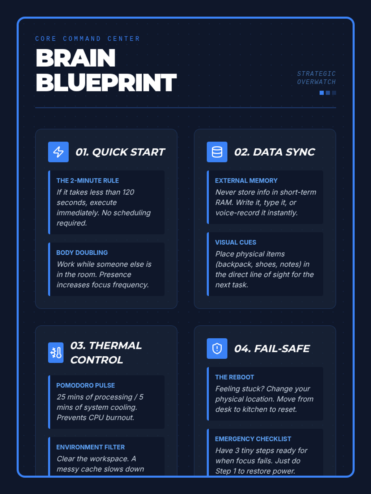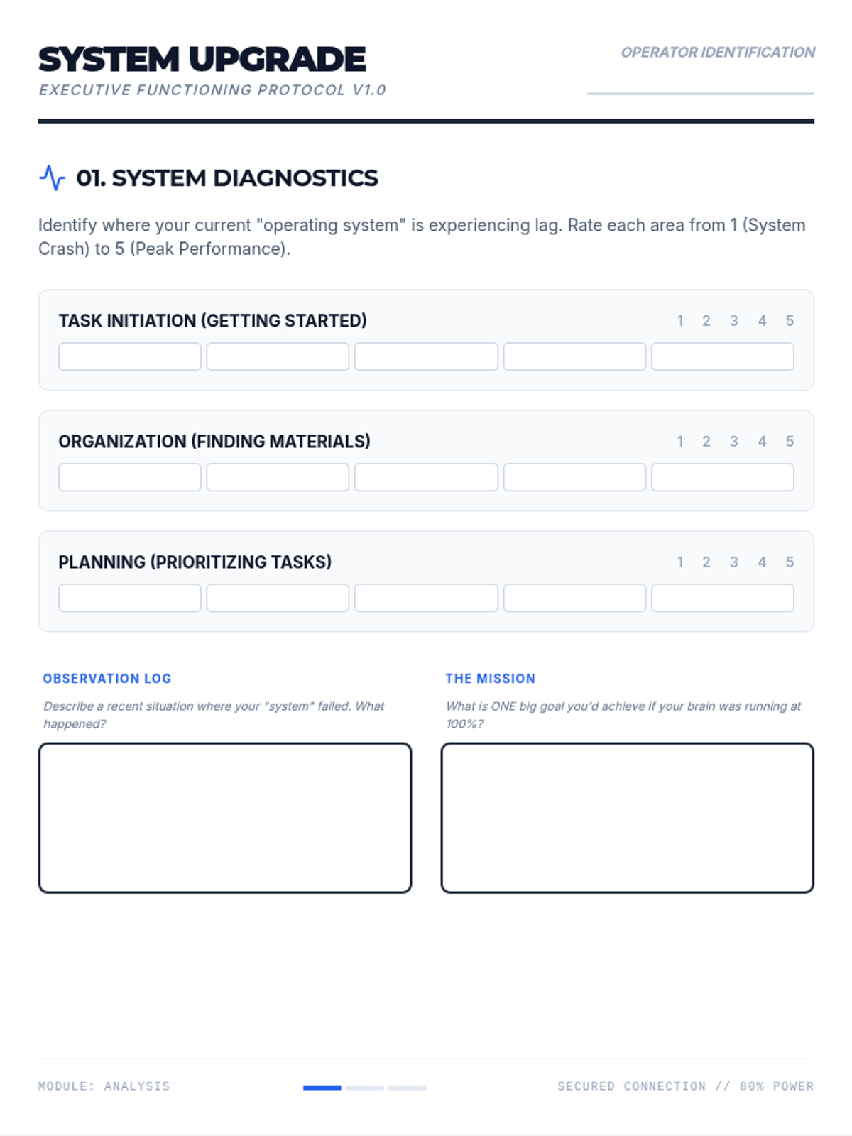 A comprehensive set of tools designed to help teenagers master executive functioning skills, focusing on task management, environmental organization, and self-monitoring using a high-tech, tactical aesthetic.
