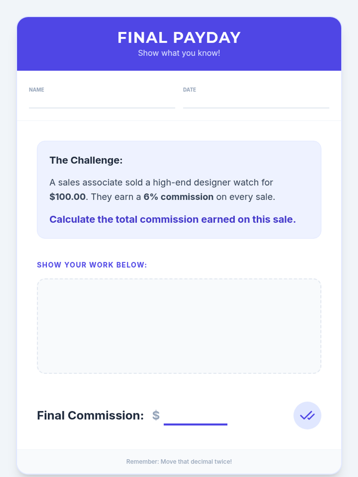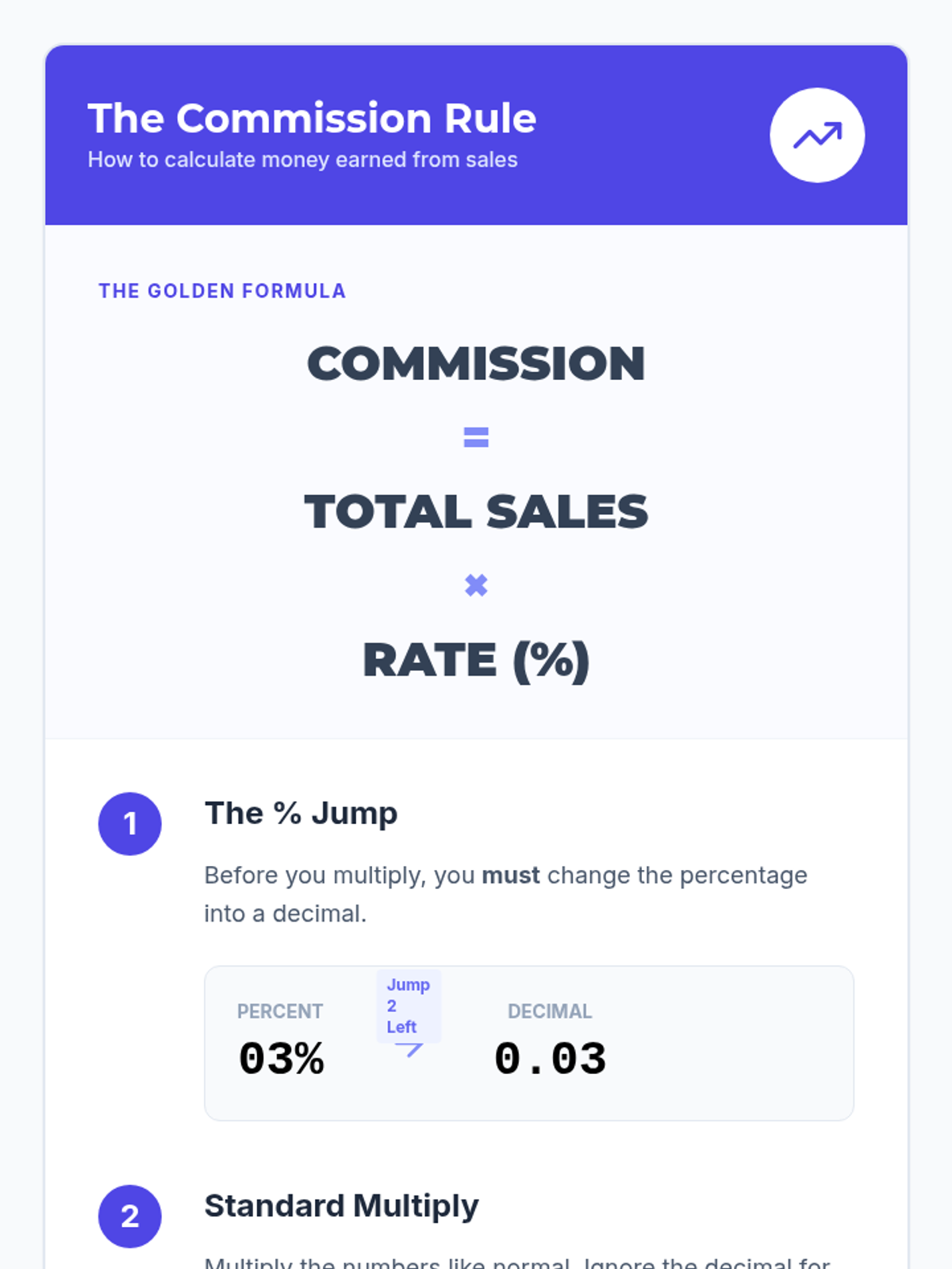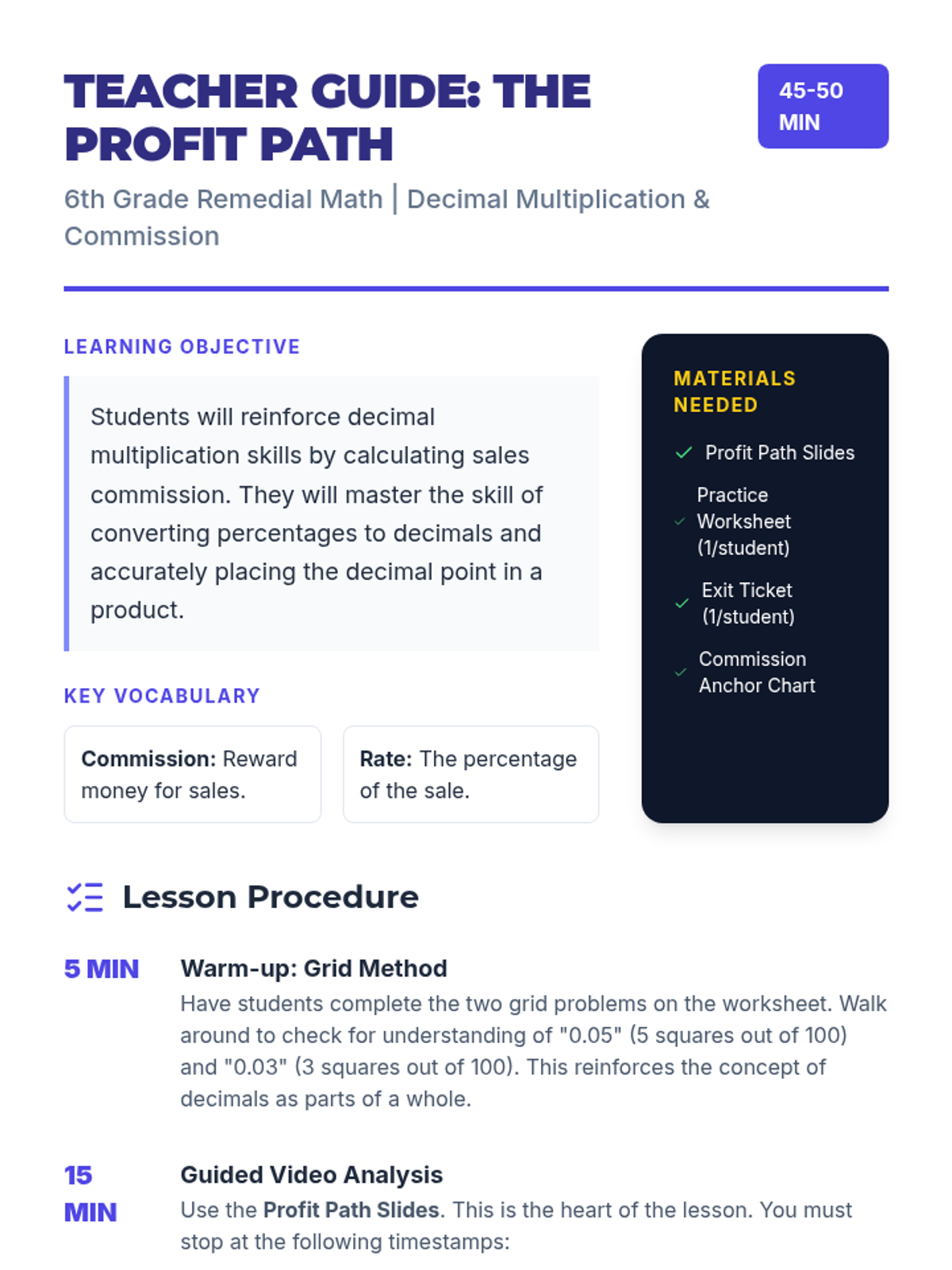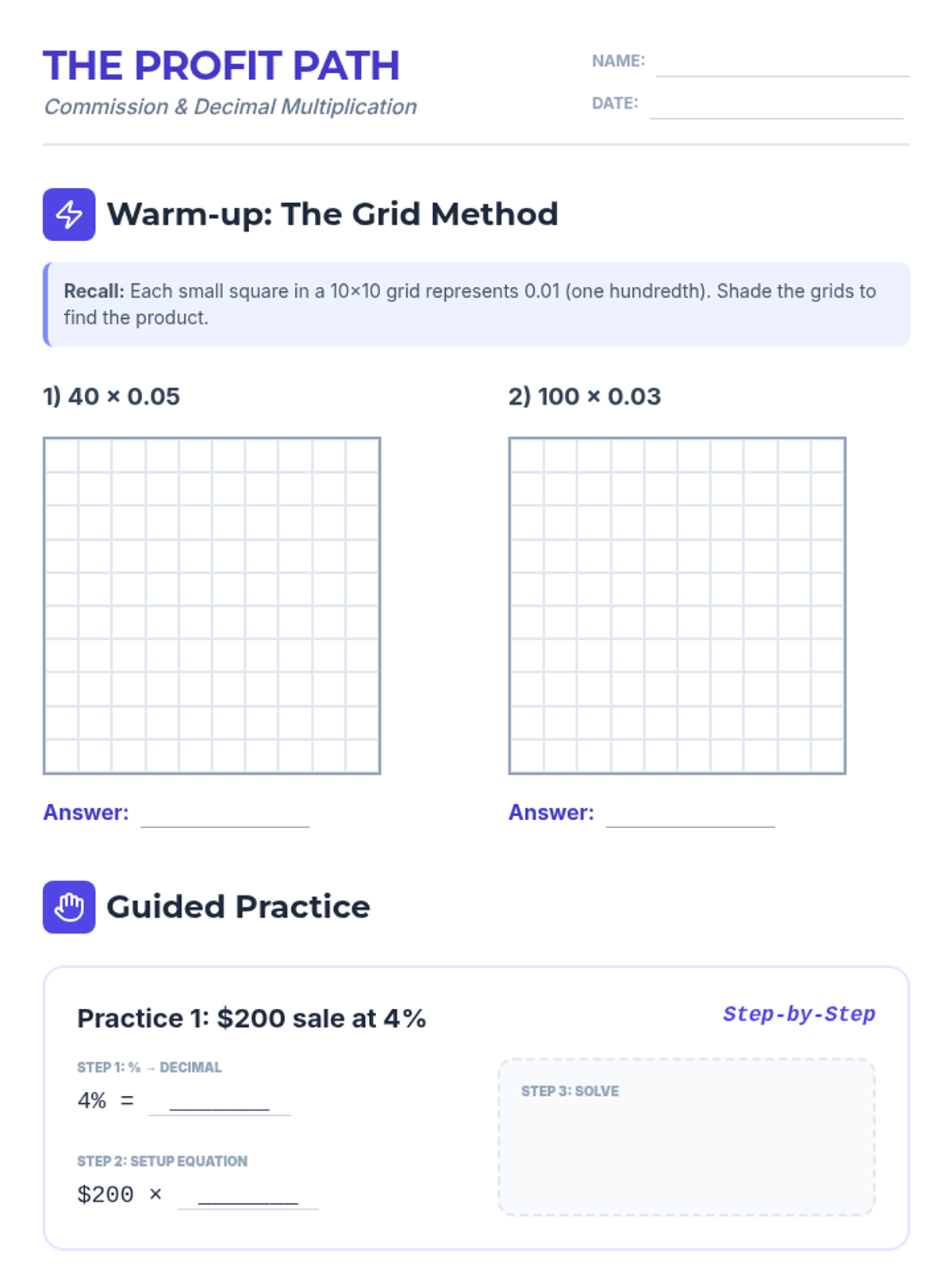 A remedial math lesson for 6th graders focusing on multiplying decimals through the real-world context of sales commission, featuring a guided video analysis and hands-on grid practice.
