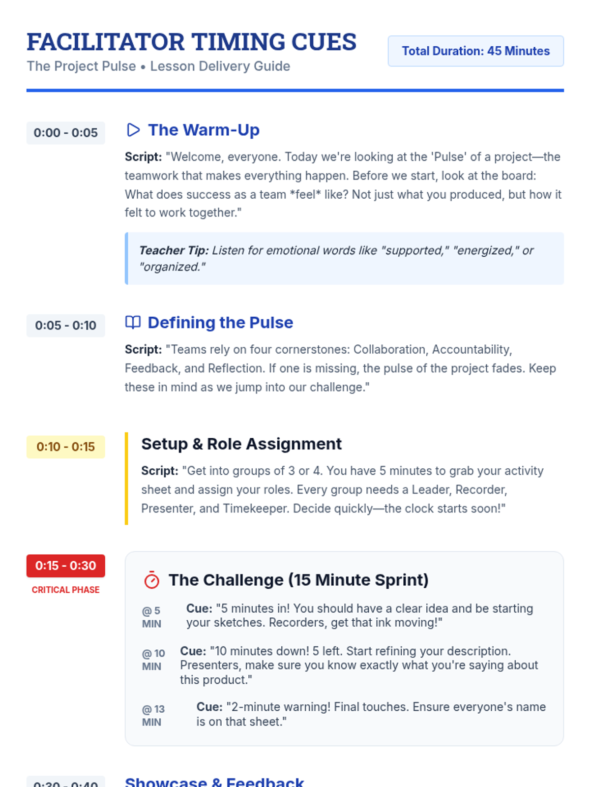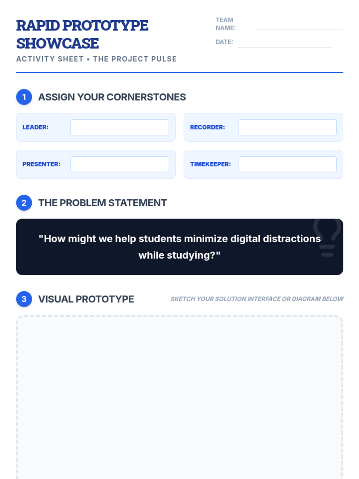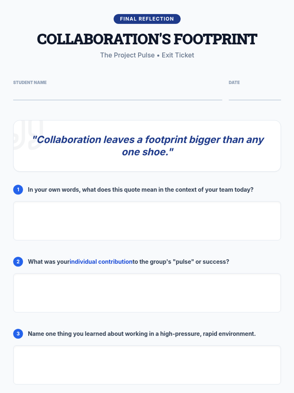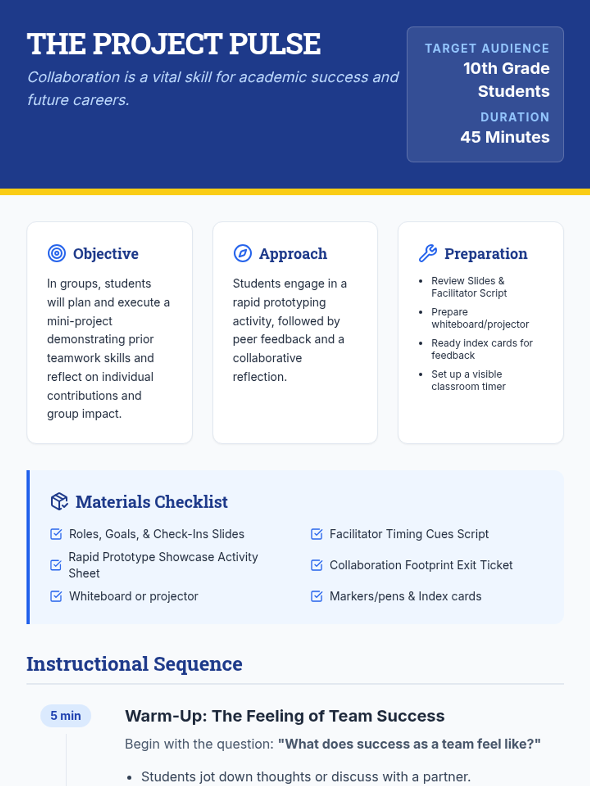 A 45-minute lesson for 10th-grade students focused on teamwork, rapid prototyping, and collaborative reflection. Students plan a mini-project, assign roles, and evaluate their group impact.