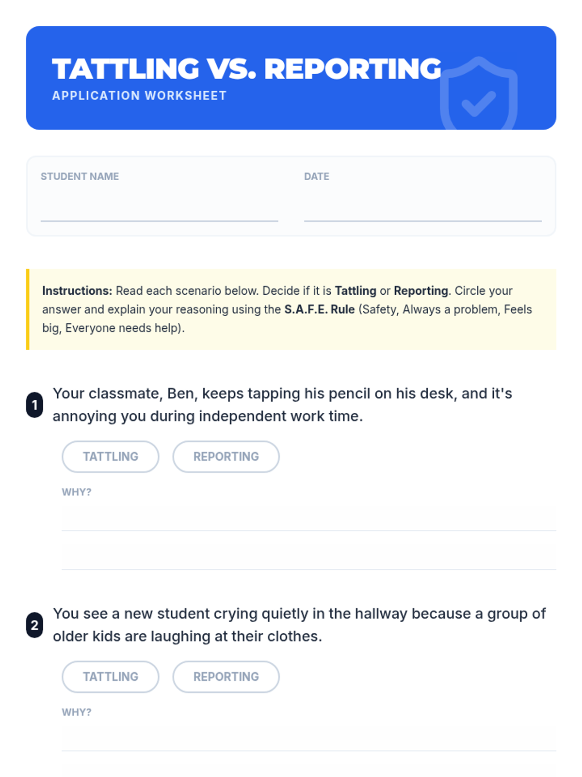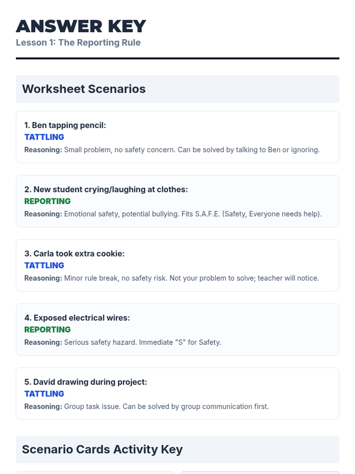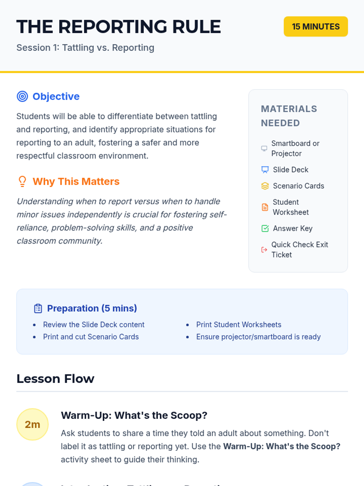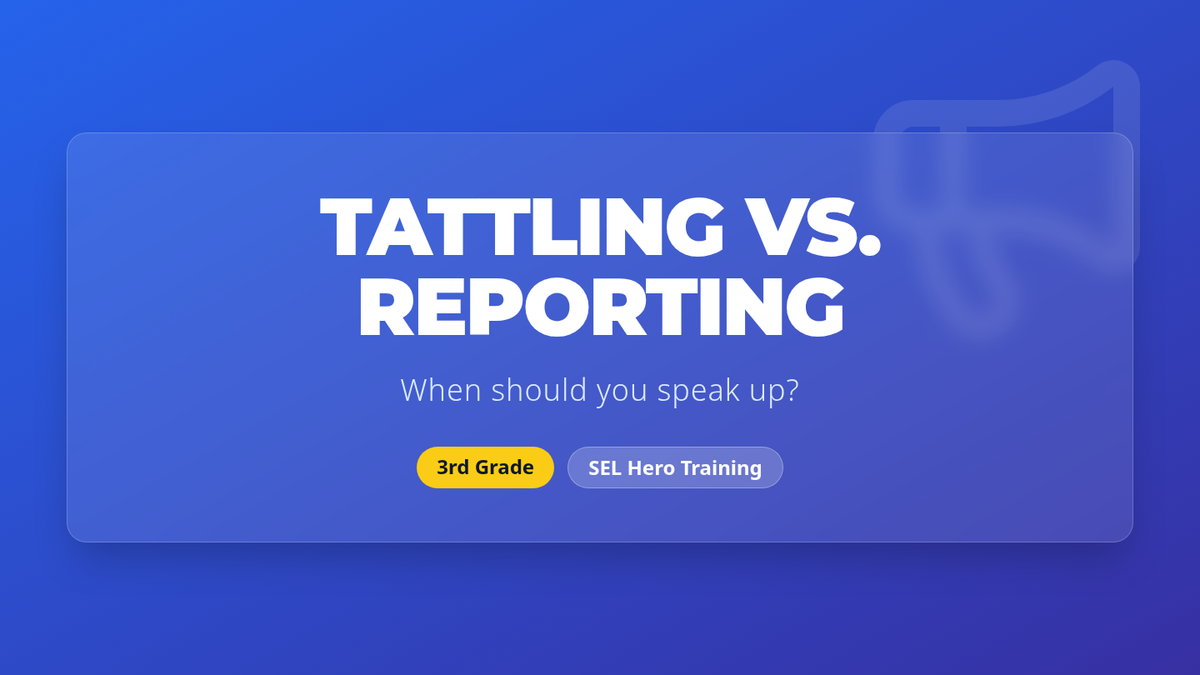 An introduction to the concepts of tattling and reporting. Students learn to distinguish between minor annoyances they can handle themselves and safety concerns that need adult intervention using the S.A.F.E. rule.
