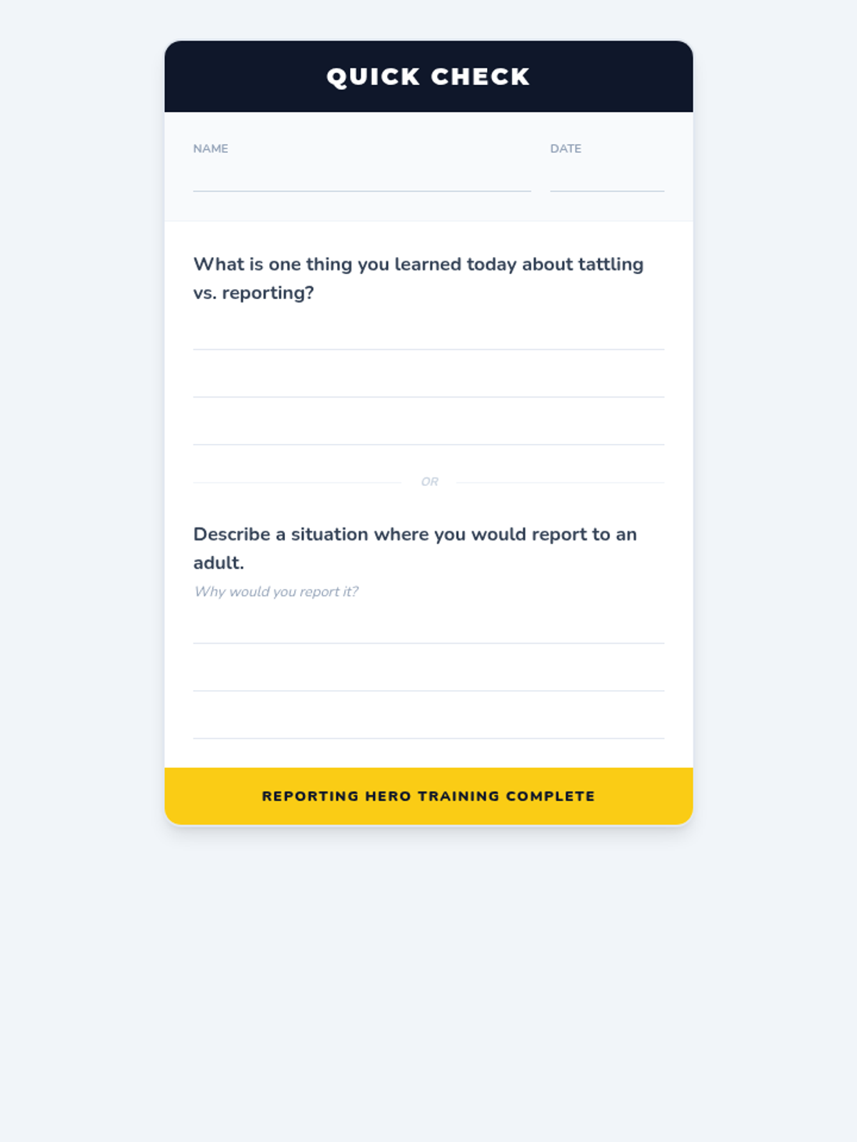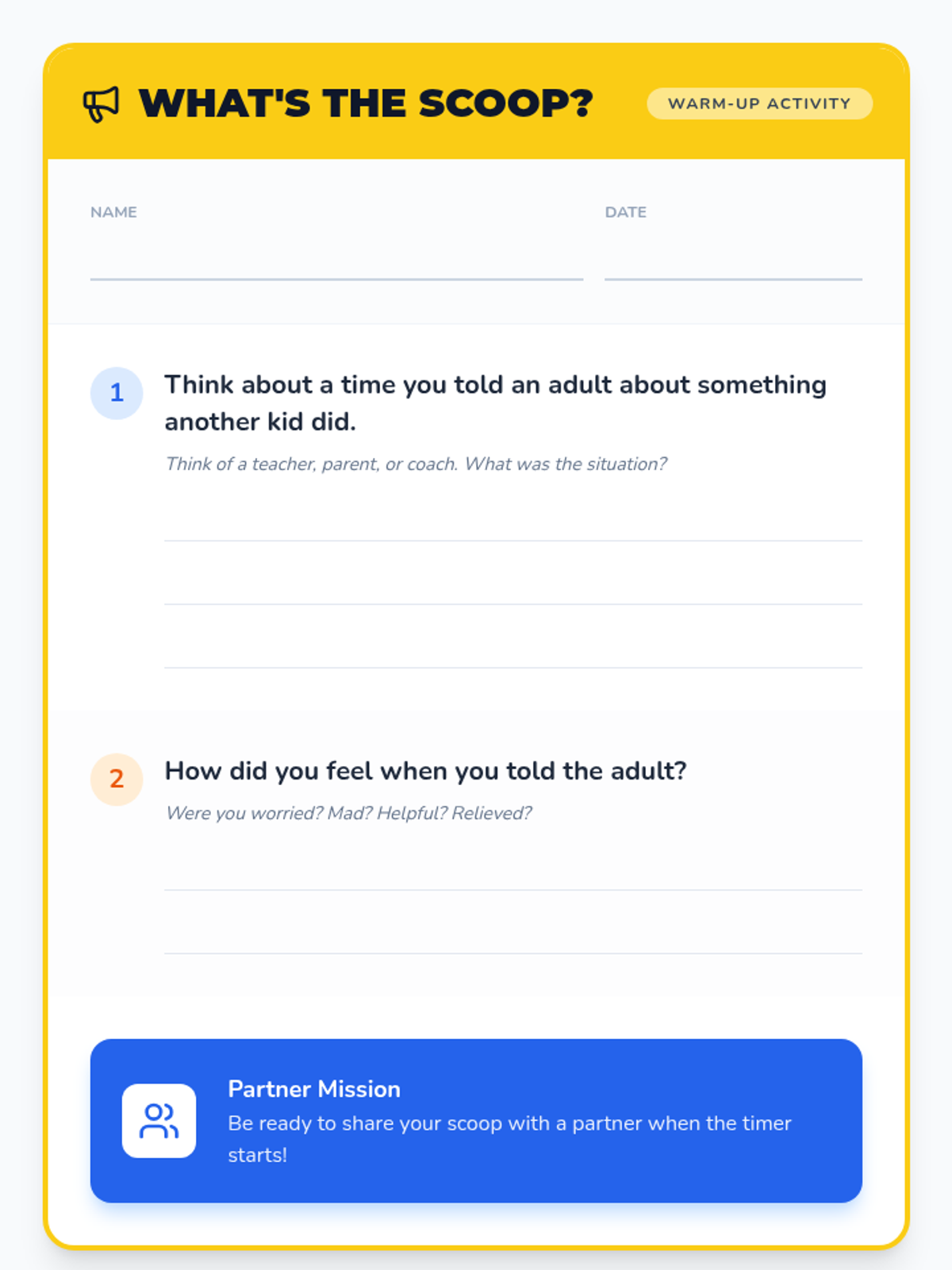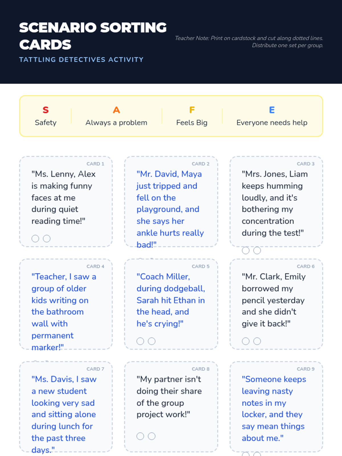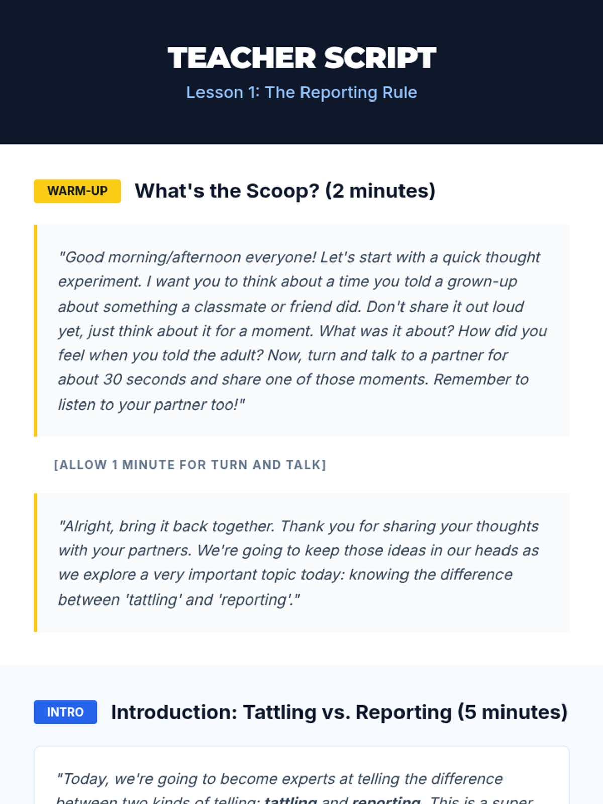 An introduction to the concepts of tattling and reporting. Students learn to distinguish between minor annoyances they can handle themselves and safety concerns that need adult intervention using the S.A.F.E. rule.