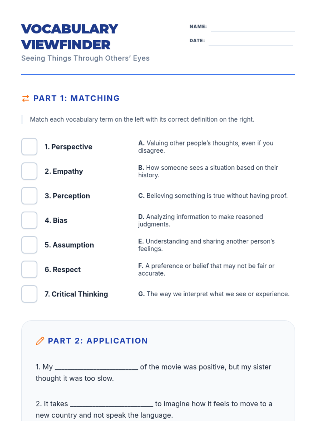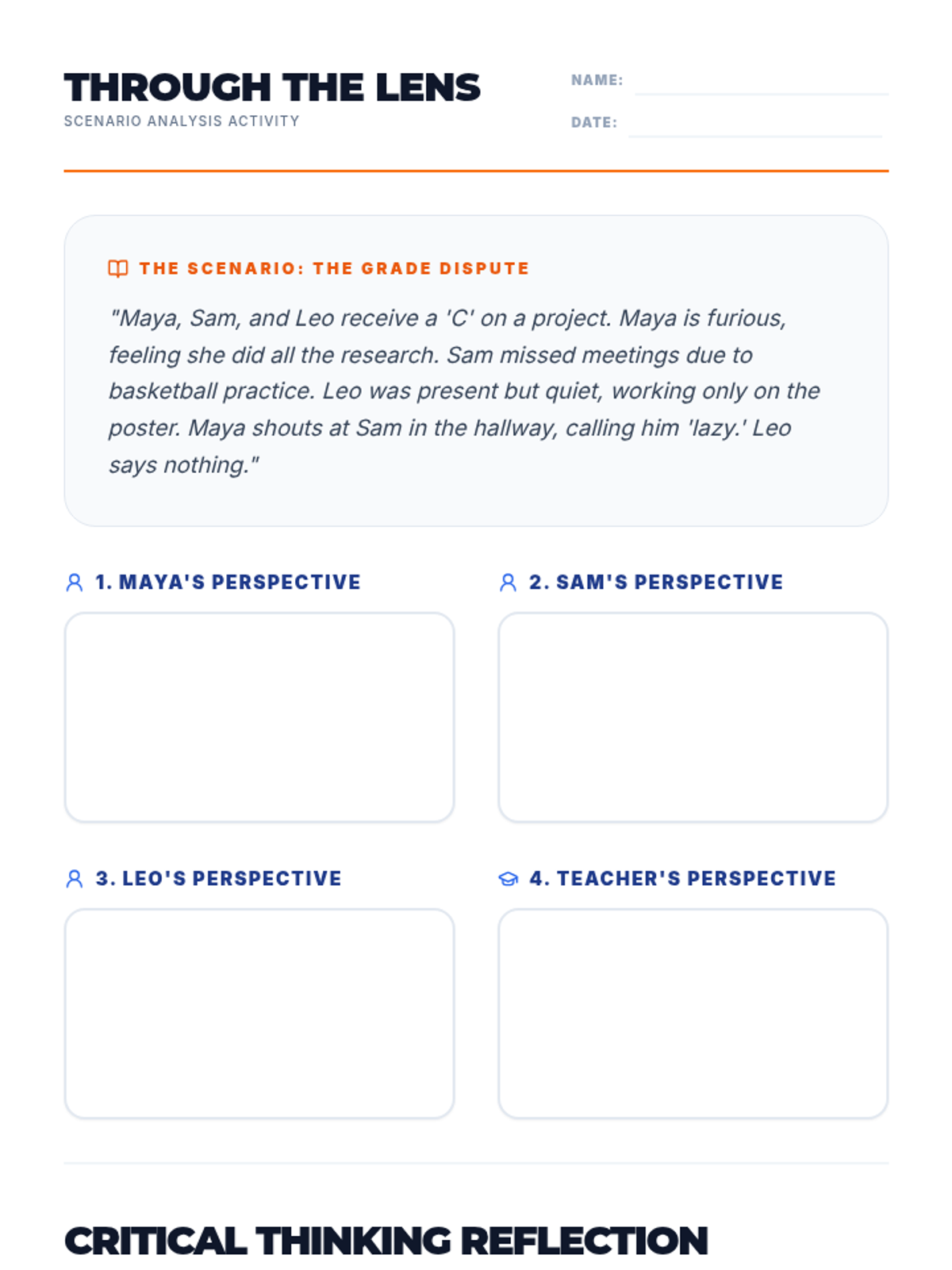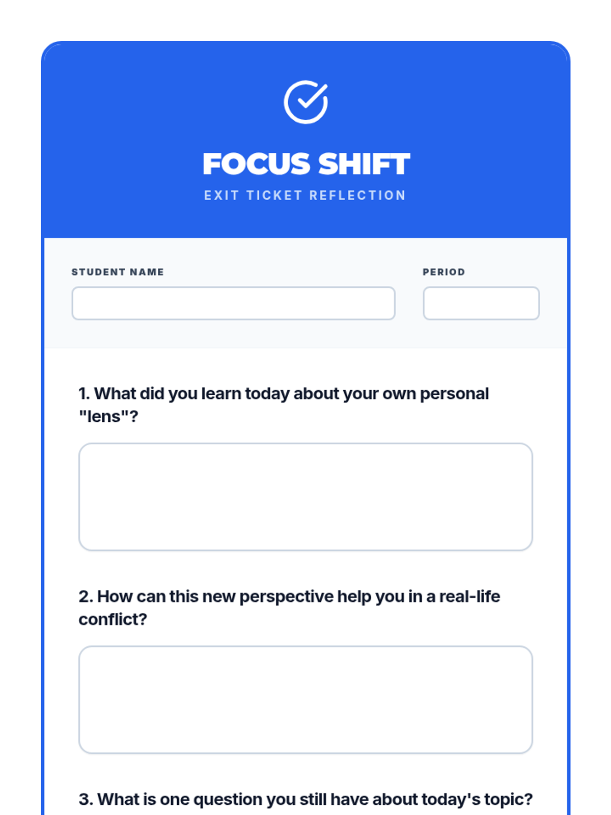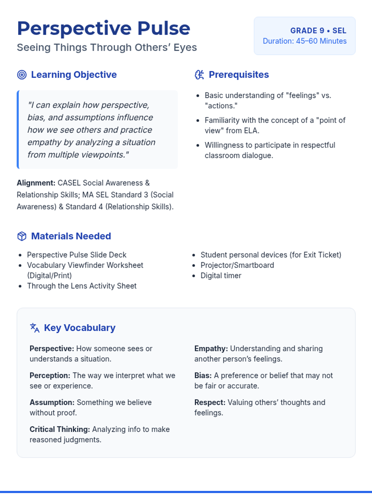 A social-emotional learning lesson for 9th graders focused on perspective-taking, empathy, and identifying bias. Students explore how different 'lenses' shape our reality and practice viewing conflicts from multiple viewpoints.