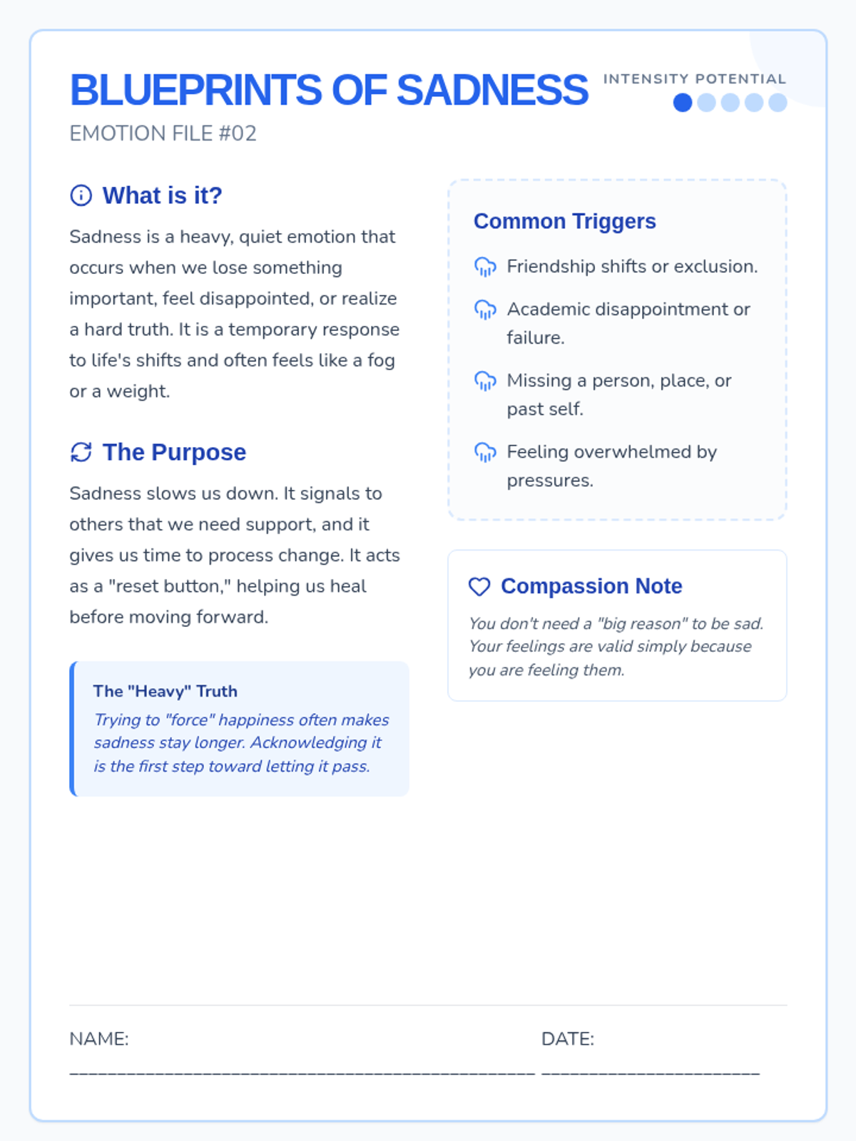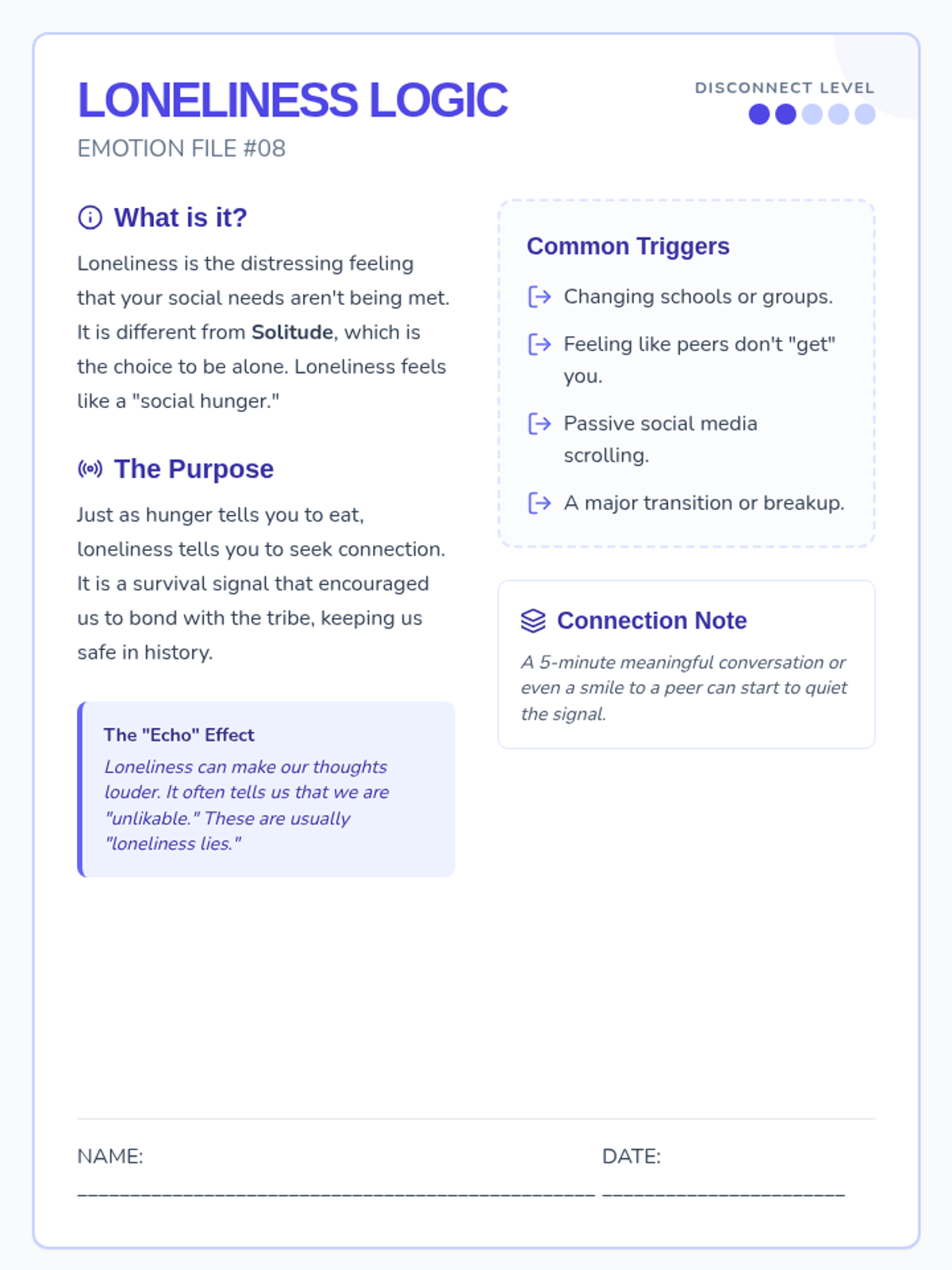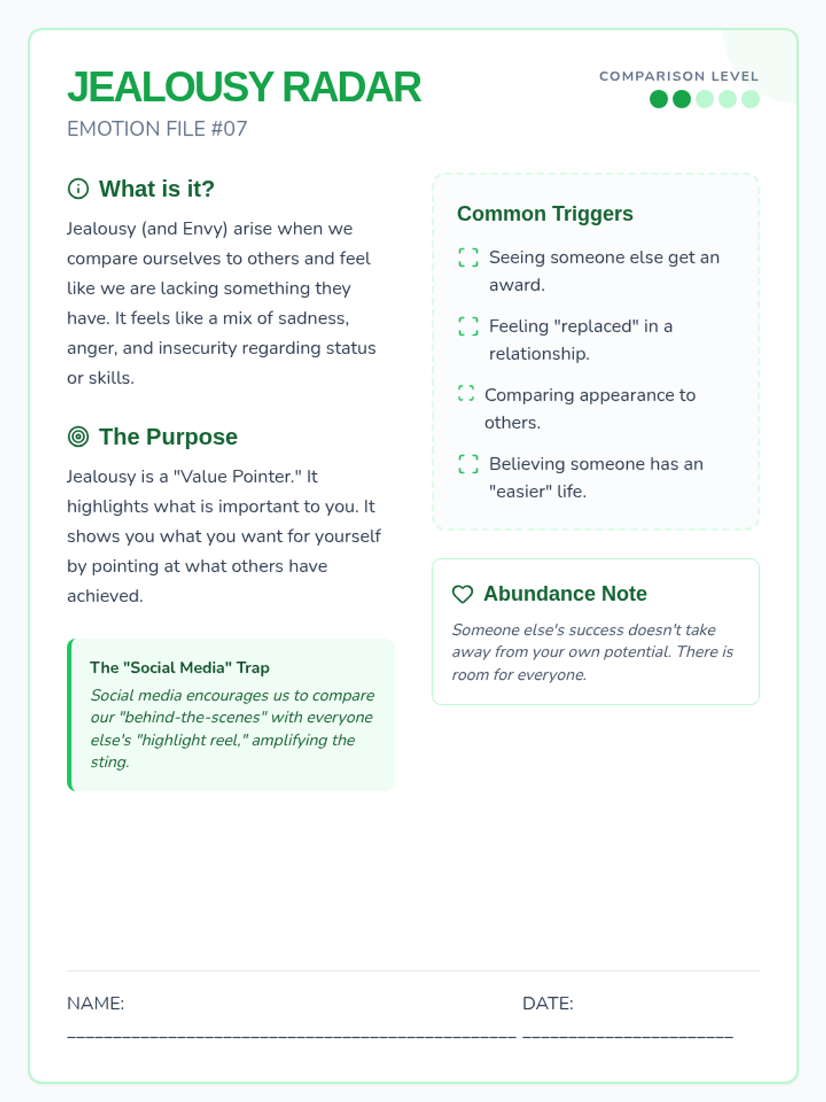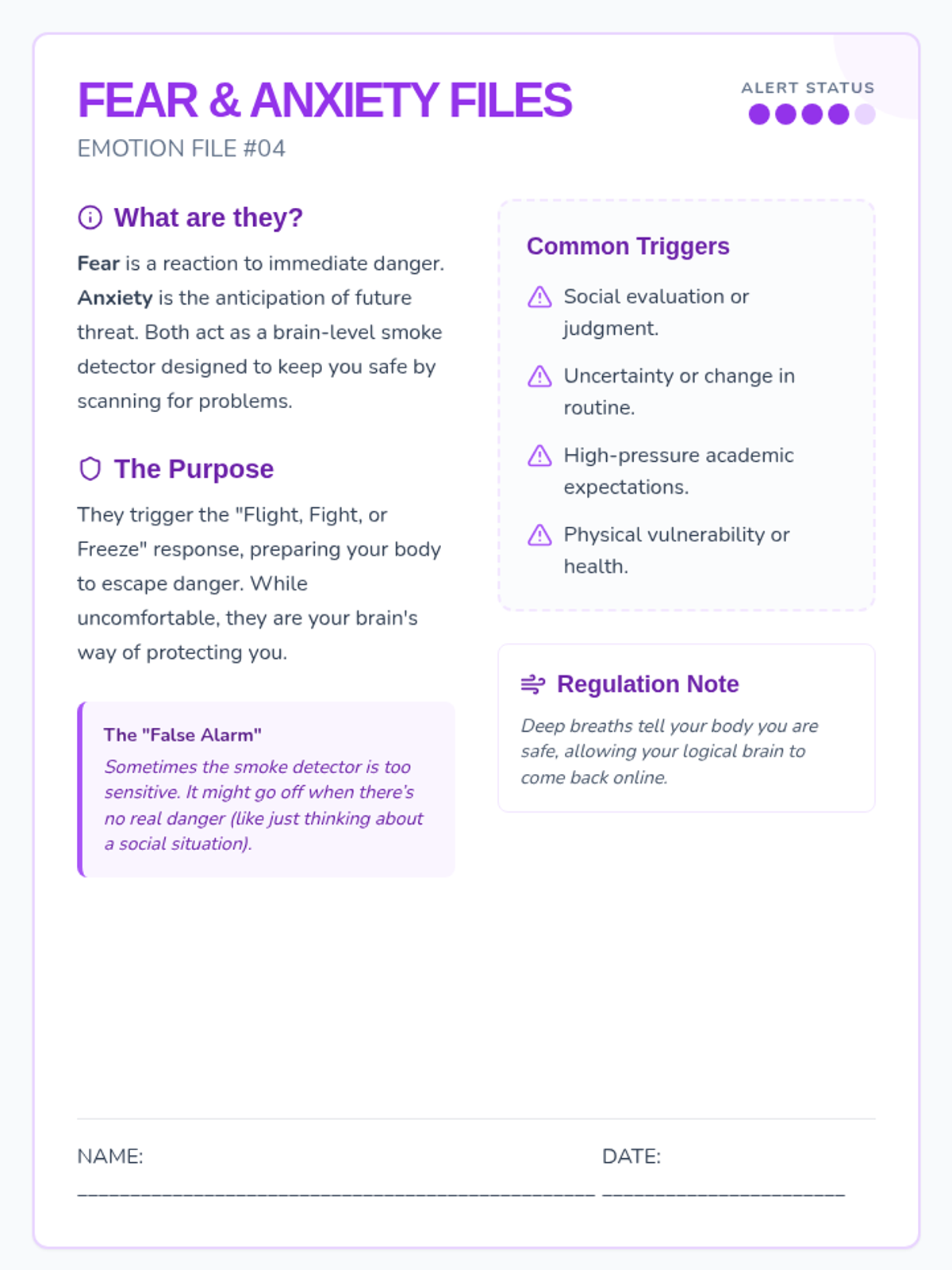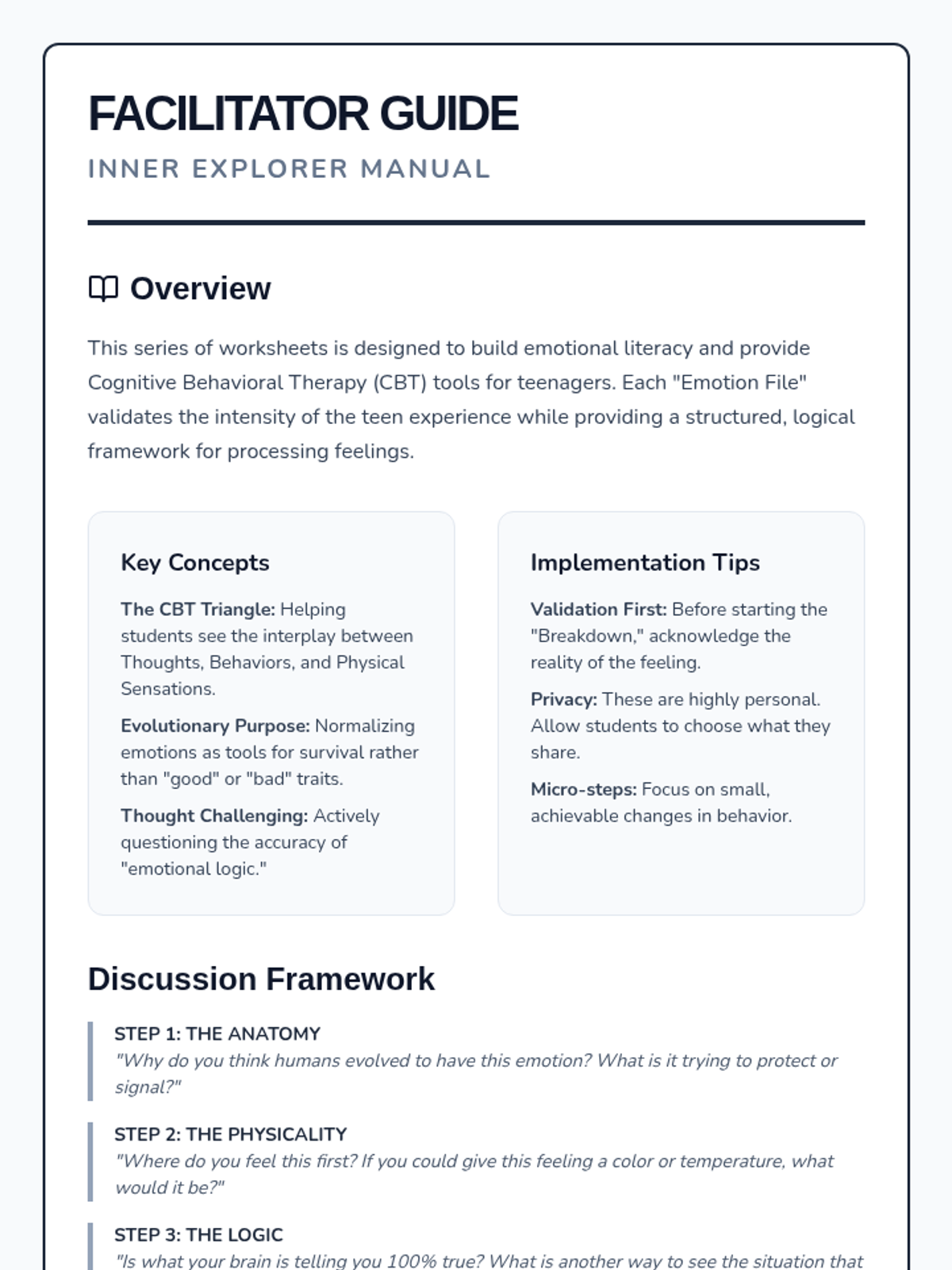 A comprehensive set of emotional literacy and CBT-based worksheets designed for teenagers to explore, understand, and manage complex emotions. Each module includes descriptive content and structured reflection areas for thoughts, behaviors, and physical sensations.