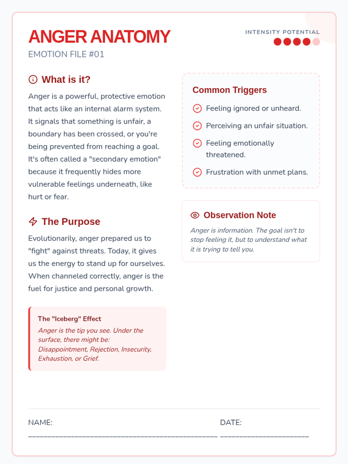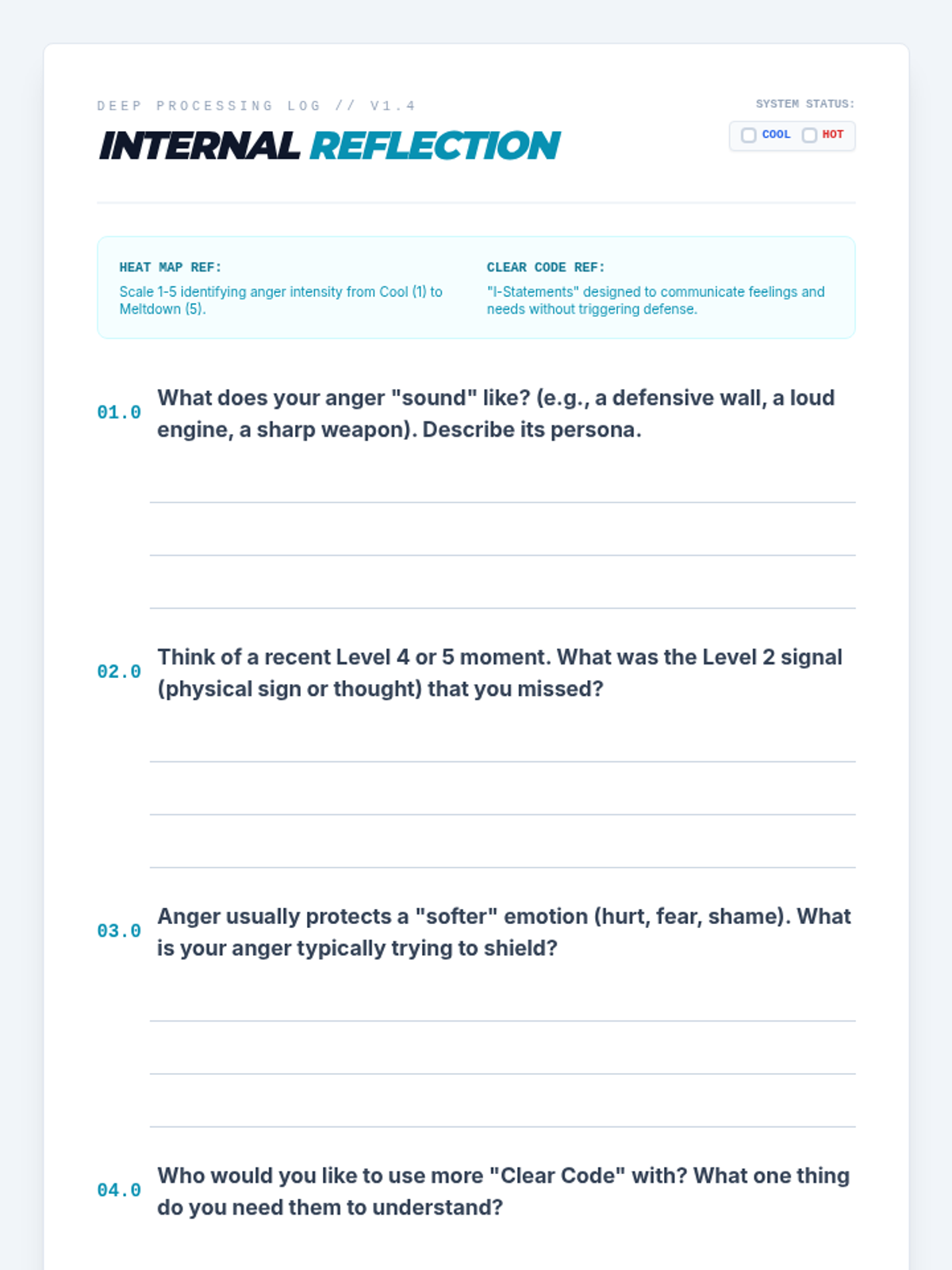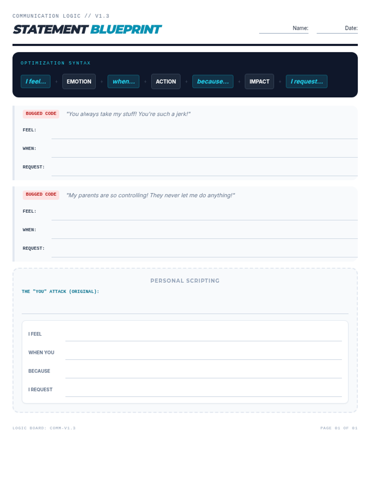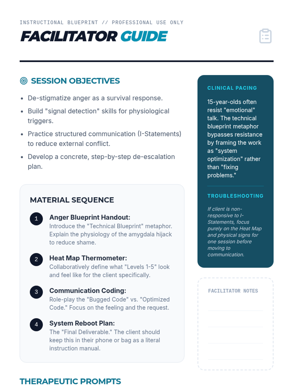 A comprehensive anger management module for teenagers, focusing on identifying emotional triggers, mastering 'I' statements, and implementing de-escalation strategies through a modern technical blueprint aesthetic.