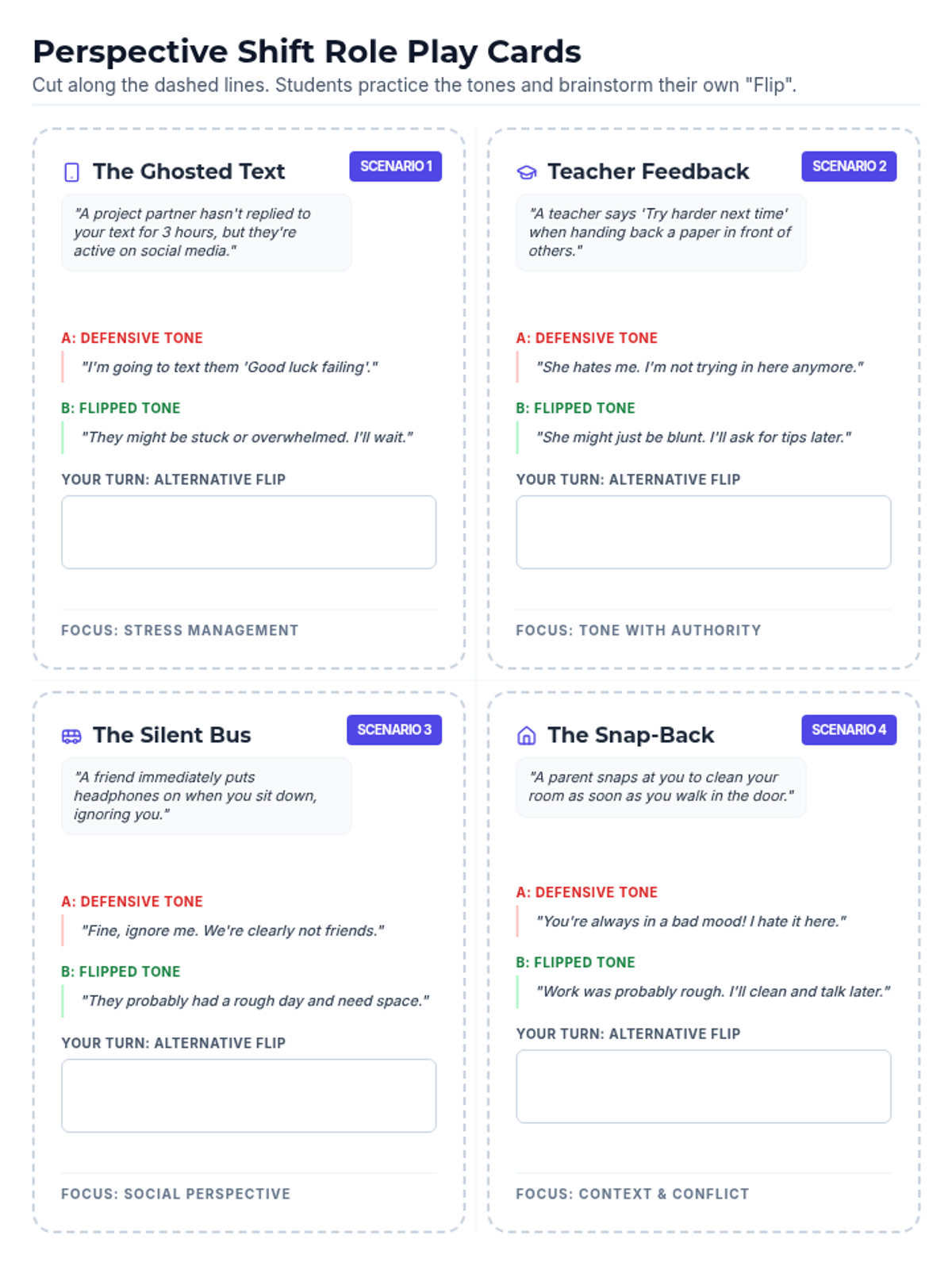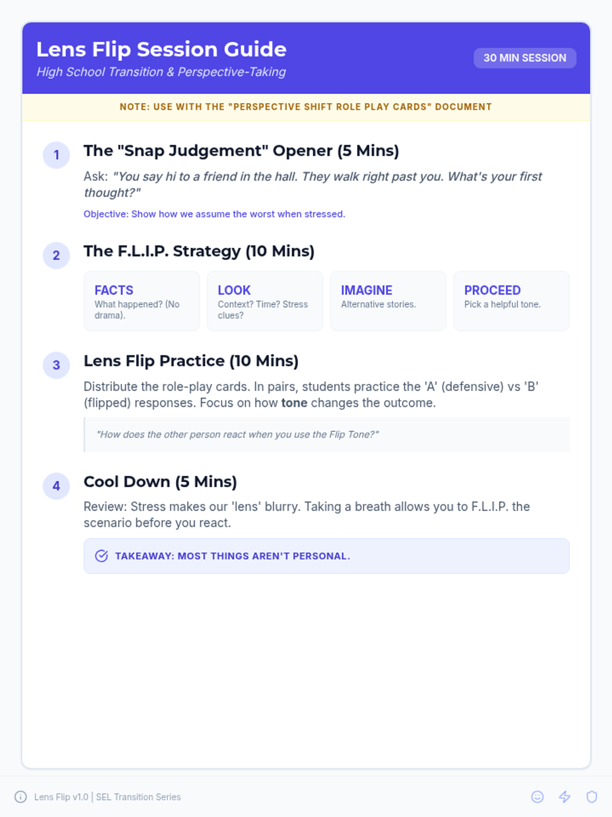 A 30-minute group session focused on perspective-taking skills to help students navigate the social and emotional challenges of transitioning to high school.