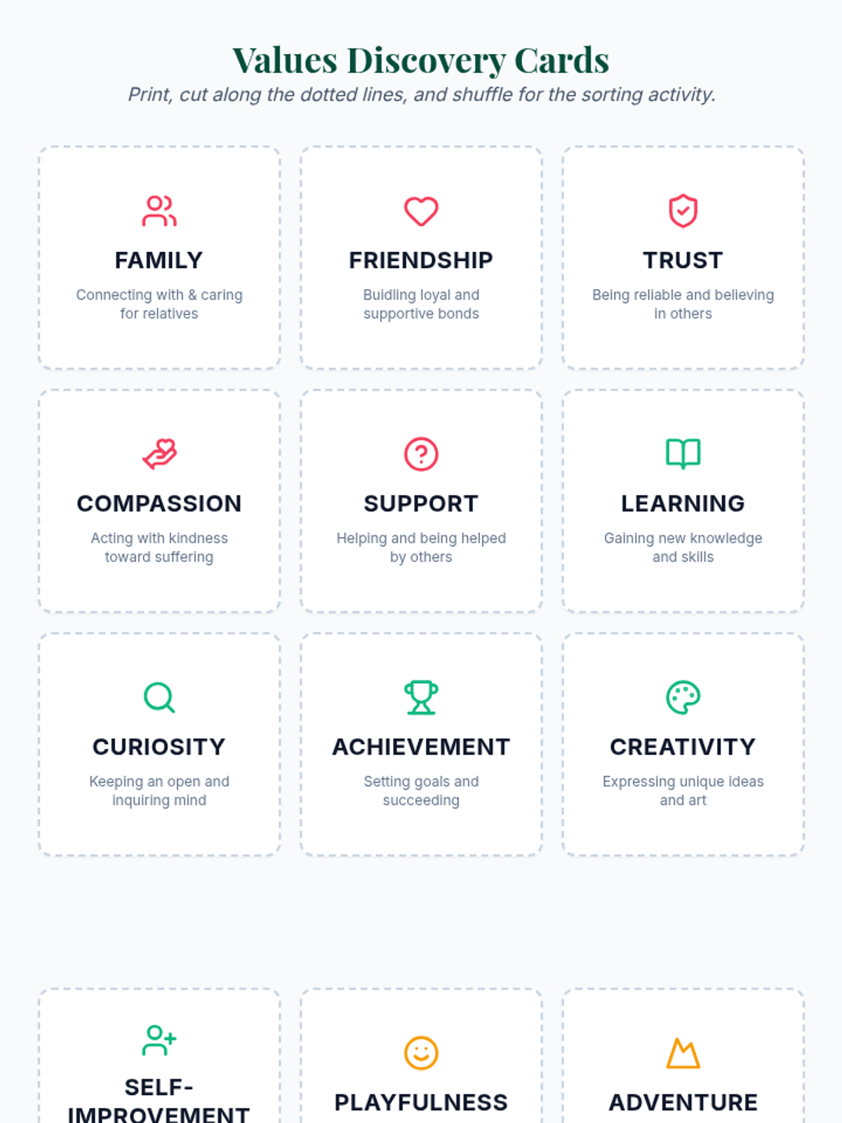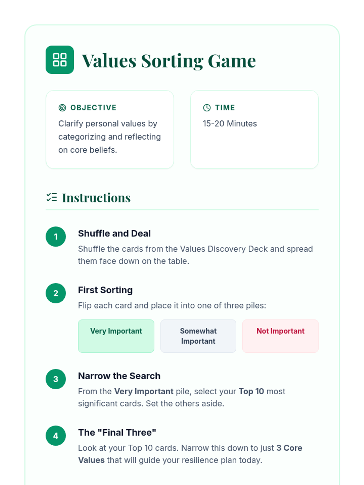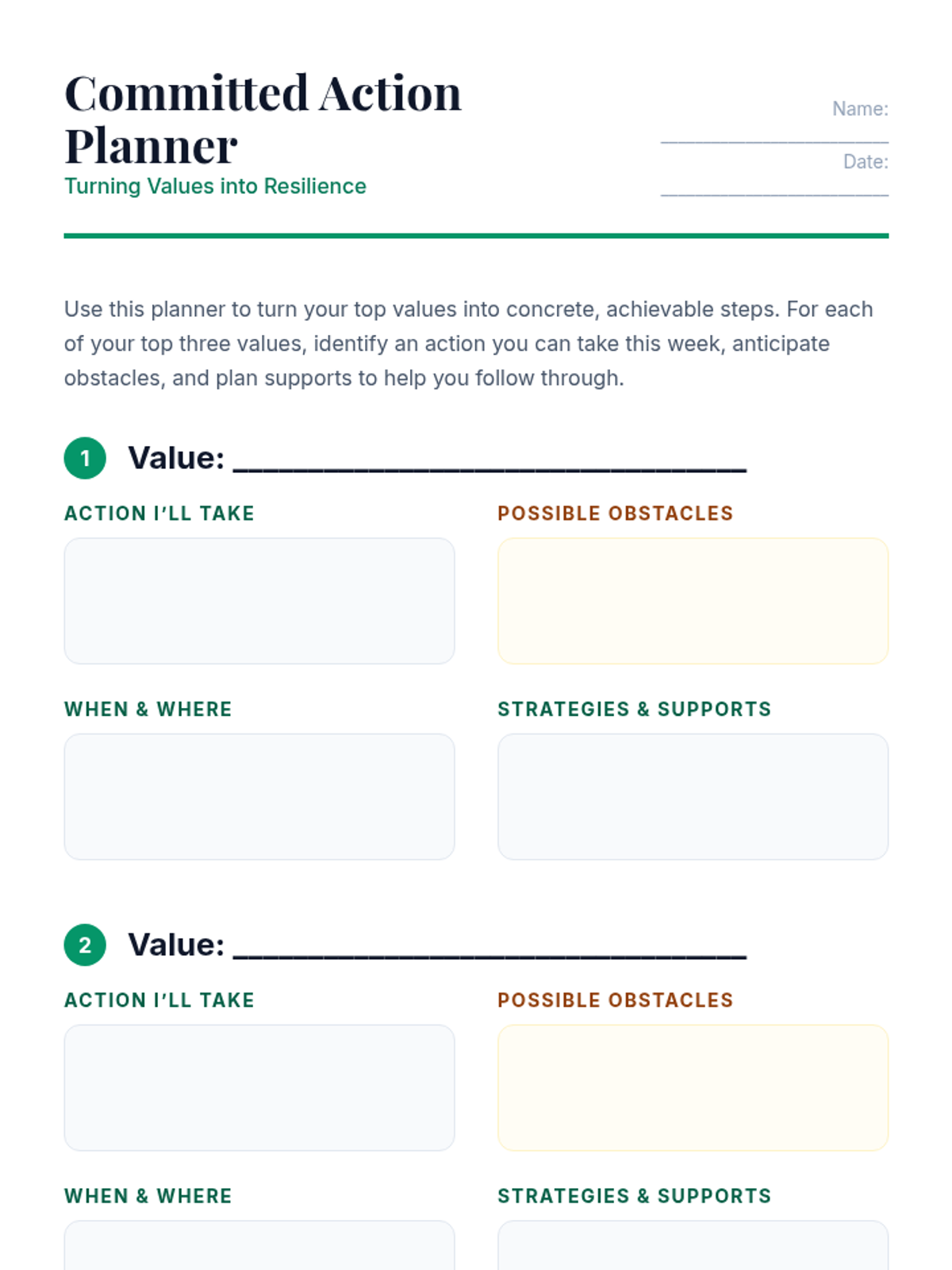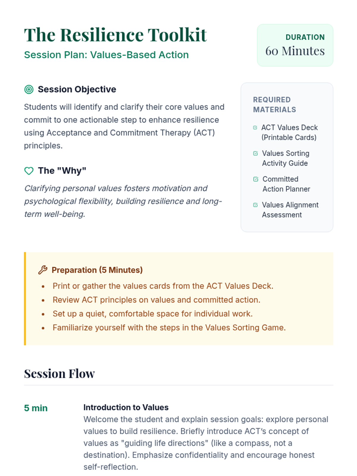 In this individual ACT-based session, 9th-grade students identify personal values and commit to actions that build resilience. This 60-minute session uses engaging activities and self-reflection to foster psychological flexibility and long-term well-being.