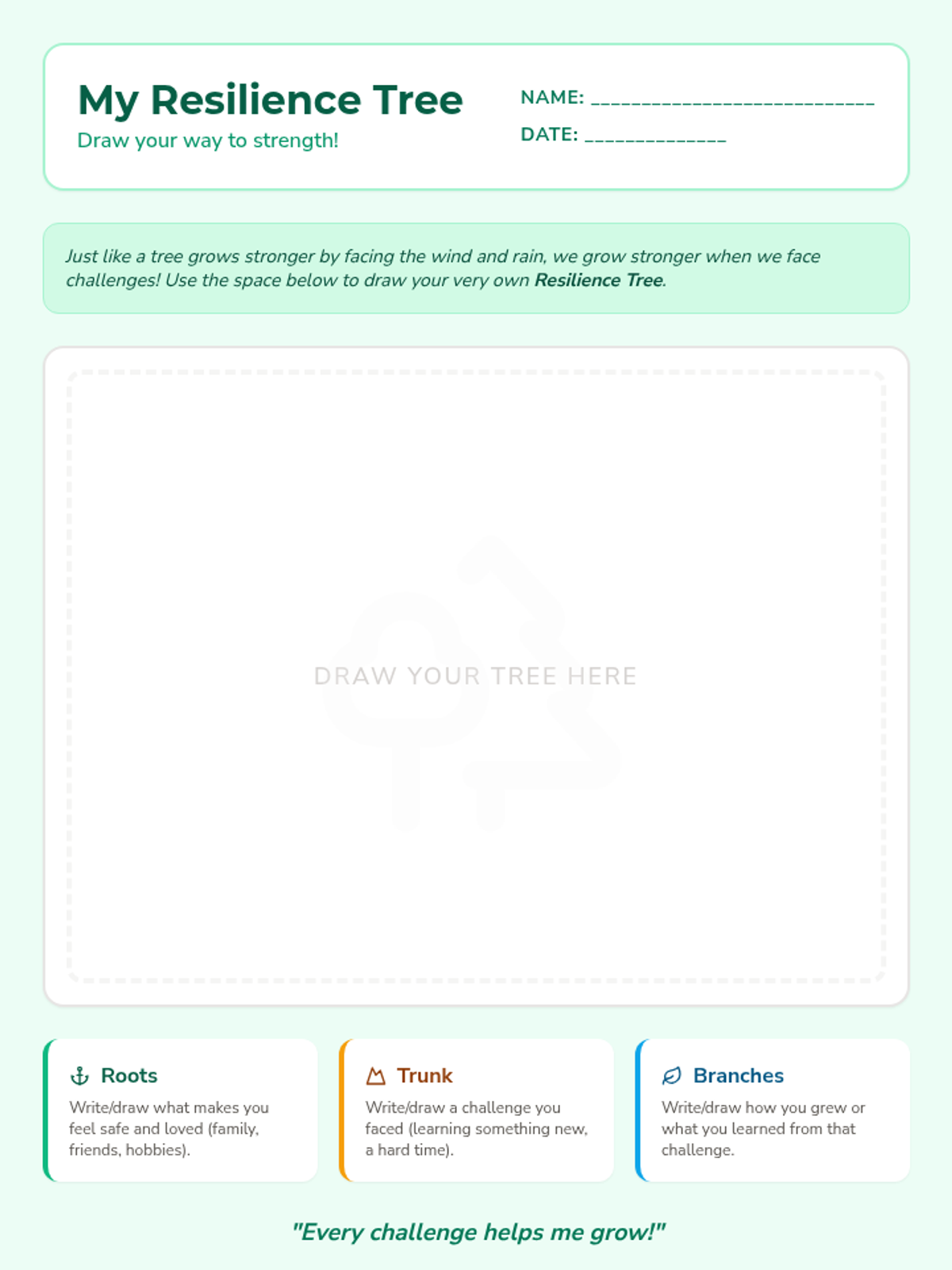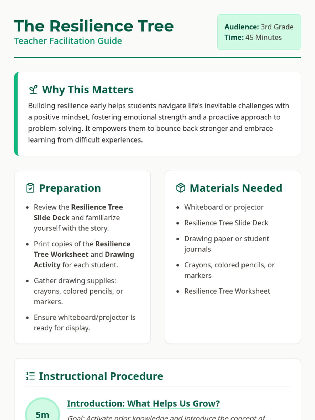 A 45-minute lesson for 3rd graders focused on building resilience through the metaphor of a tree growing stronger in a storm. Students explore coping strategies and reflect on personal growth from challenges.