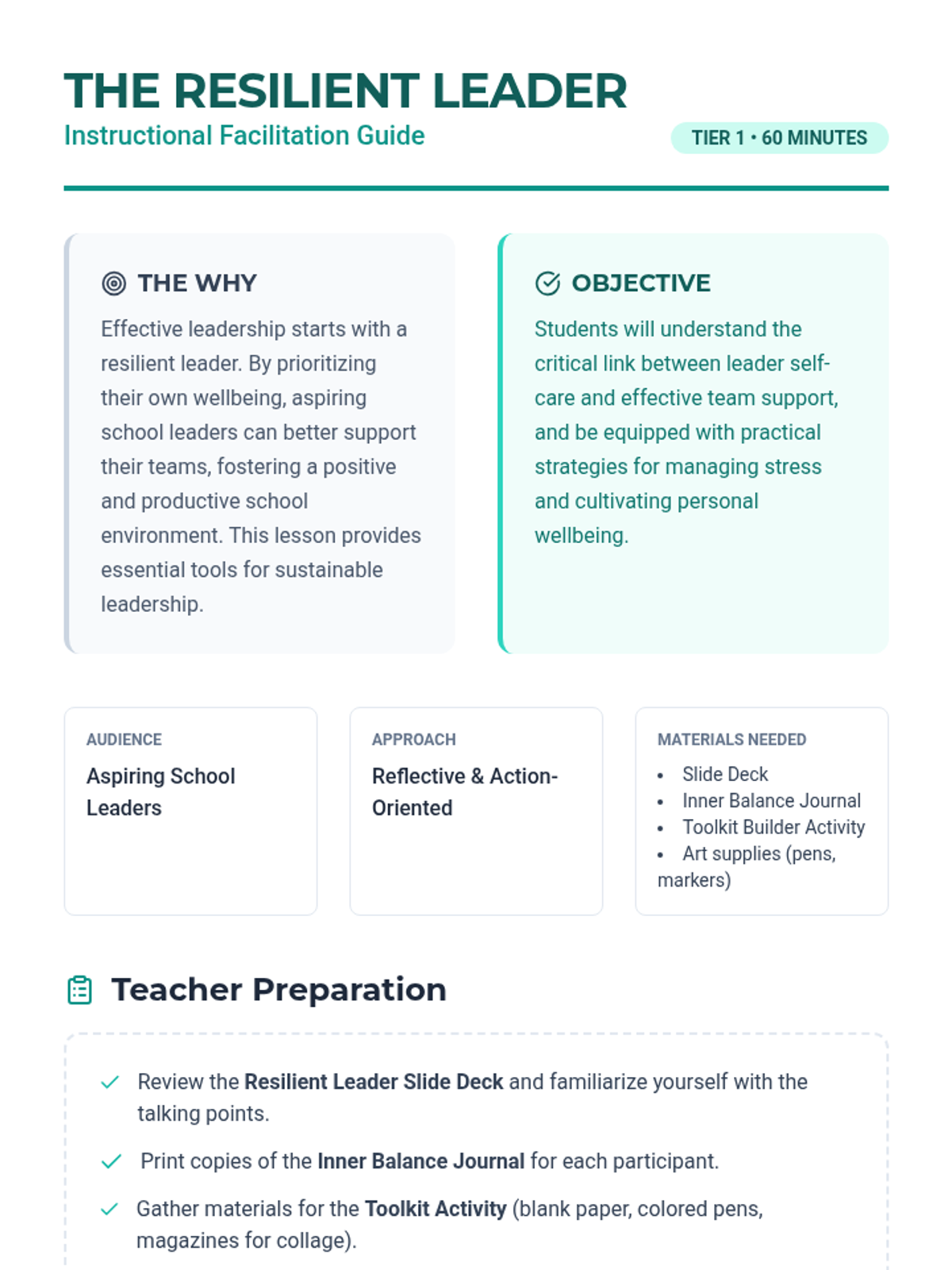 This lesson equips aspiring school leaders with practical strategies for managing stress and cultivating personal wellbeing, highlighting the link between self-care and effective leadership. Students engage in reflective journaling and create a personalized resilience toolkit to sustain their long-term effectiveness.