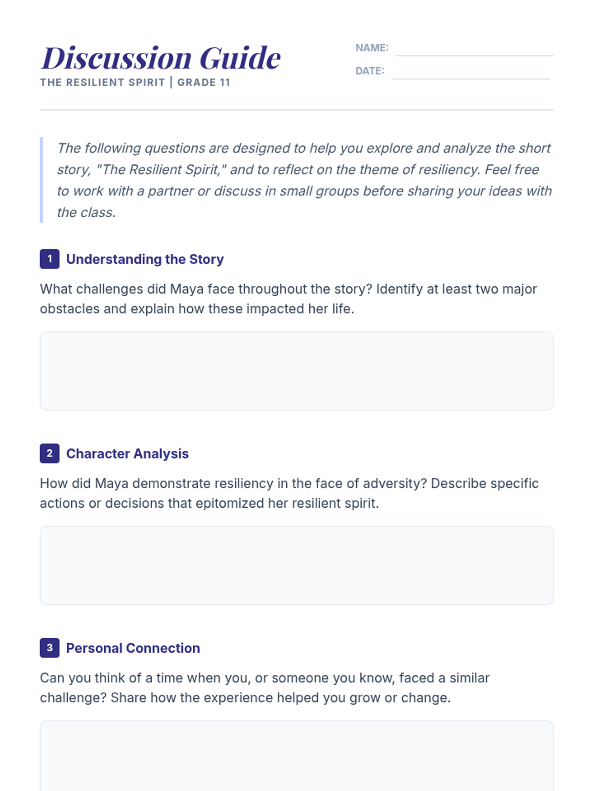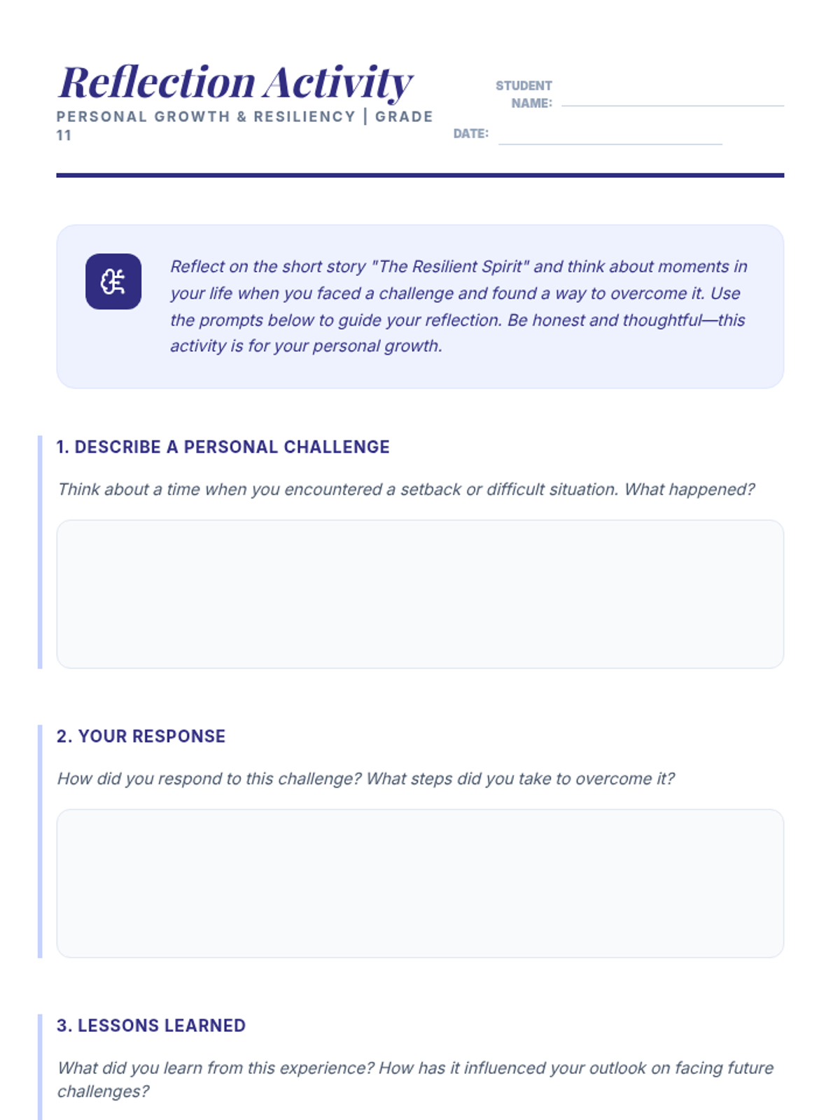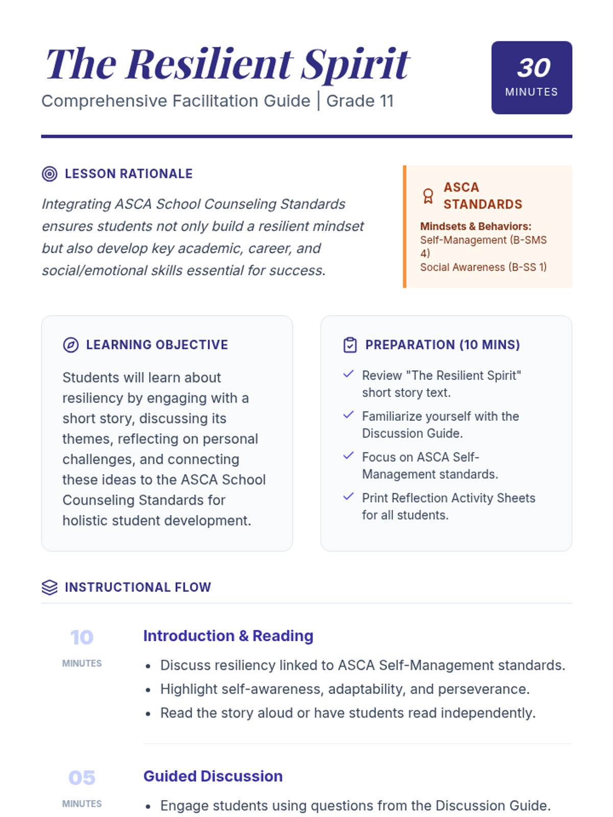 An 11th-grade lesson exploring resiliency through a short story and reflection, aligned with ASCA School Counseling Standards. Students analyze a protagonist's journey and connect it to their own personal growth and self-management skills.