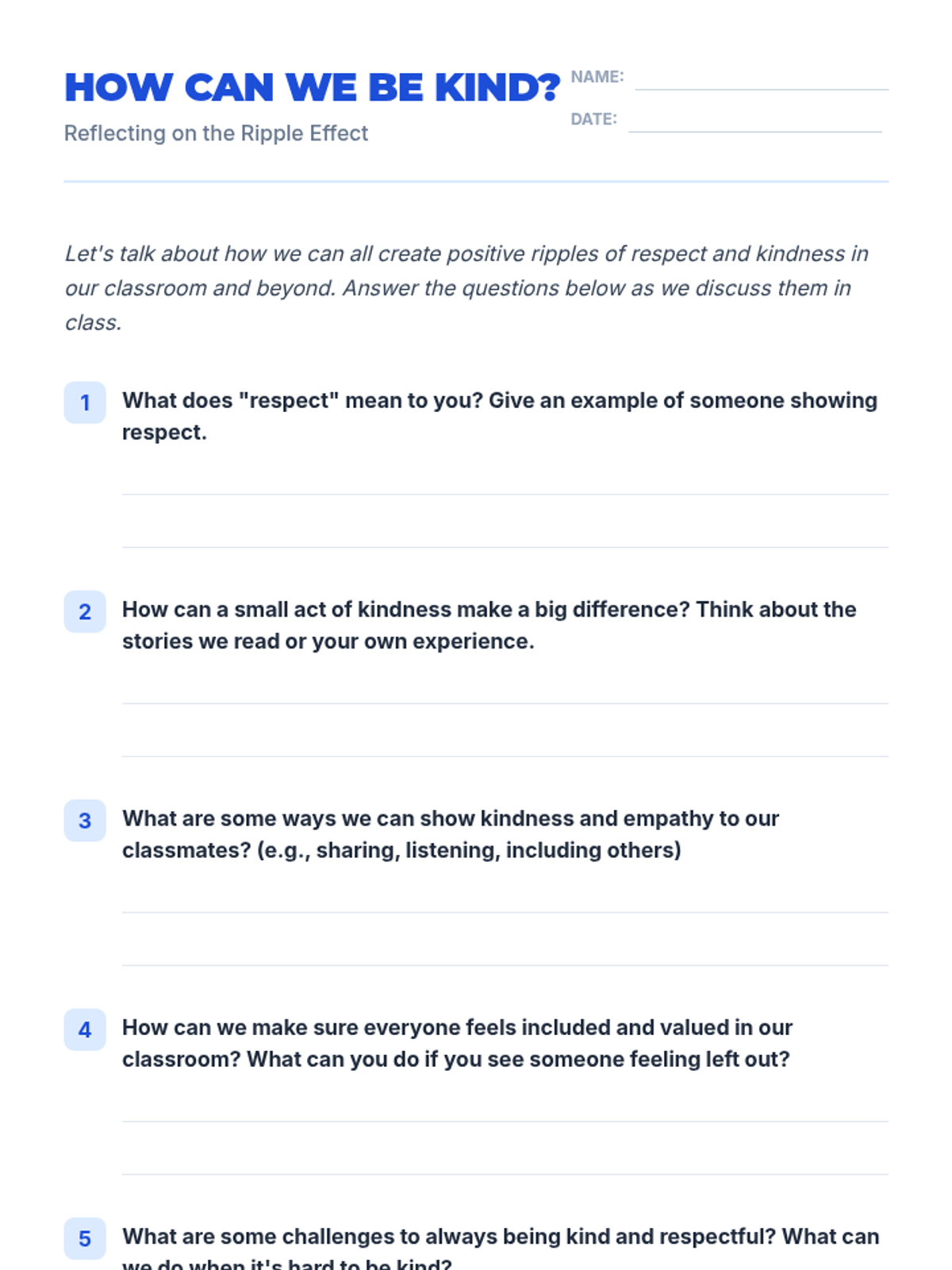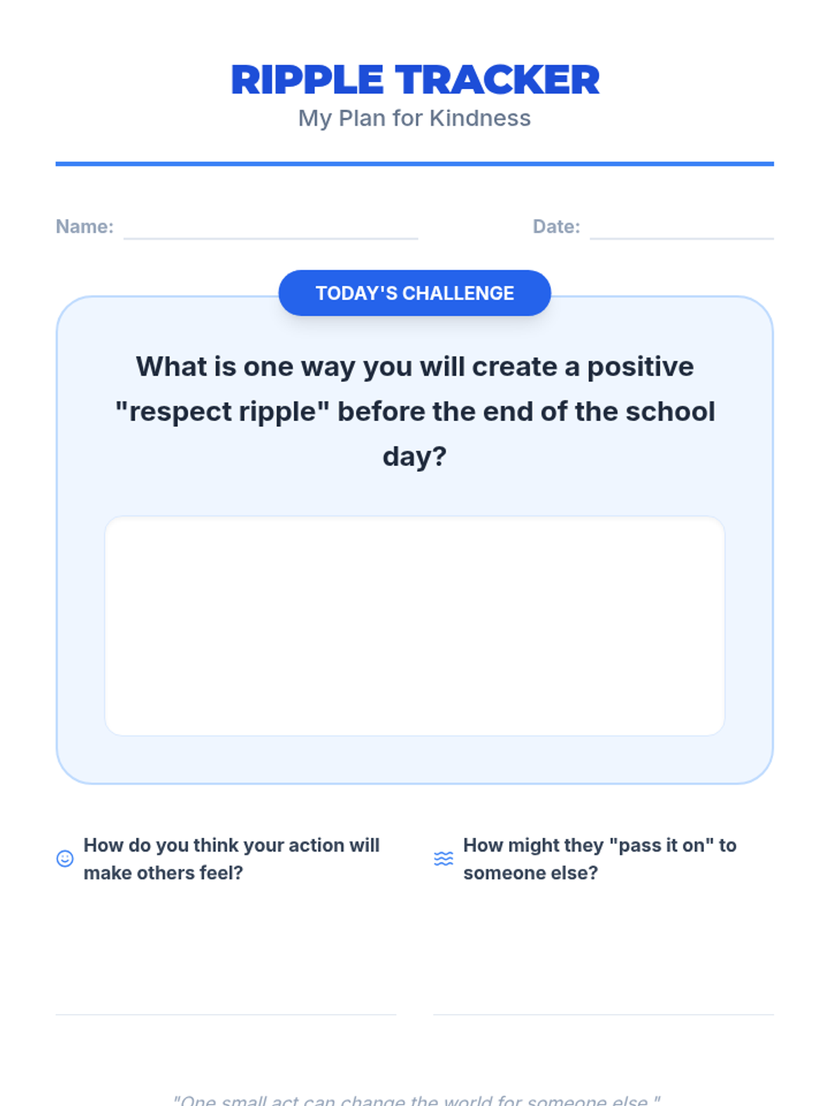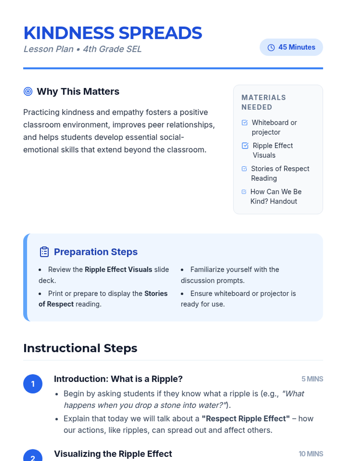 A 45-minute social-emotional learning lesson for 4th graders exploring how small acts of kindness and respect create a 'ripple effect' that positively impacts the entire classroom community.