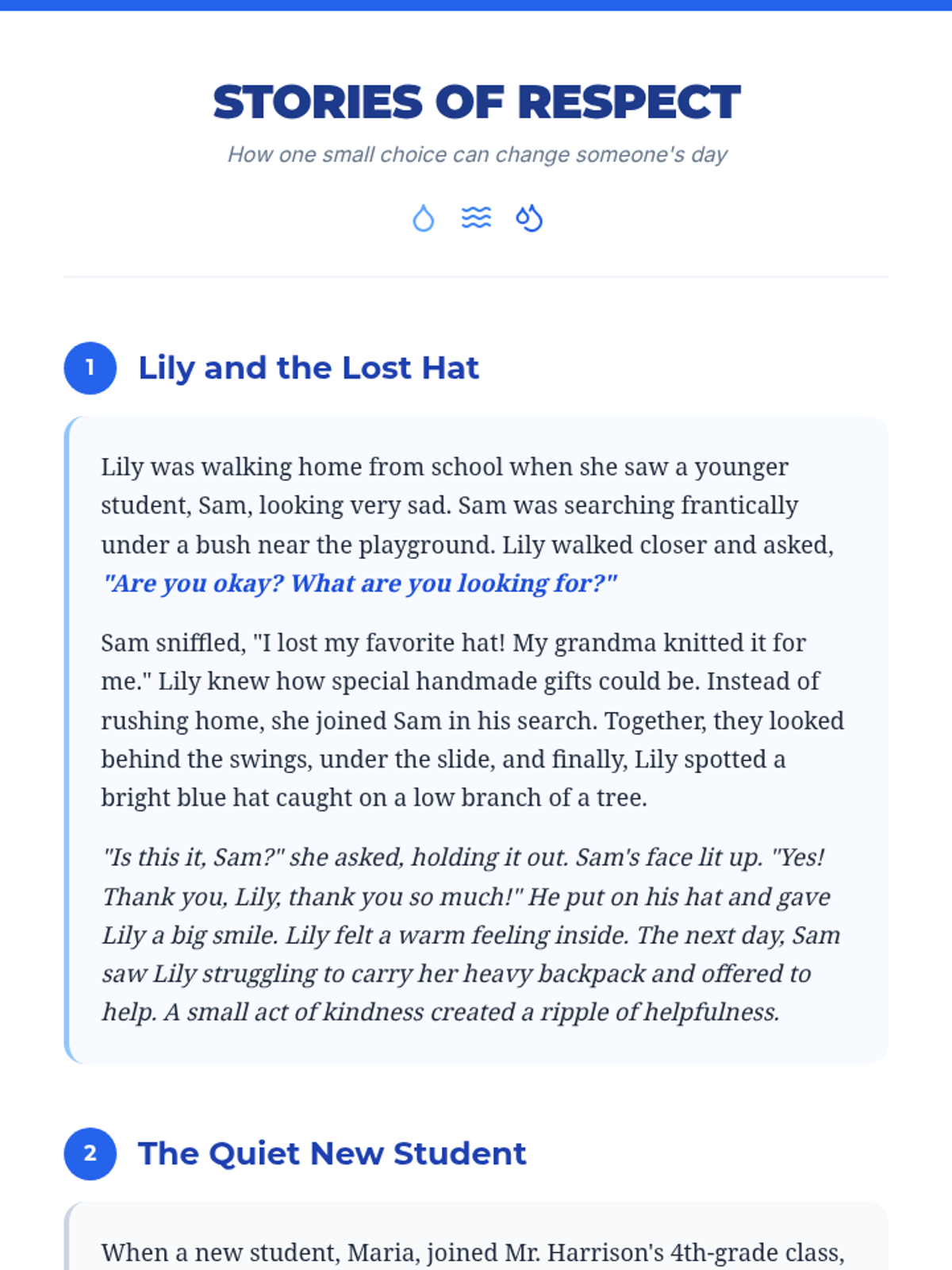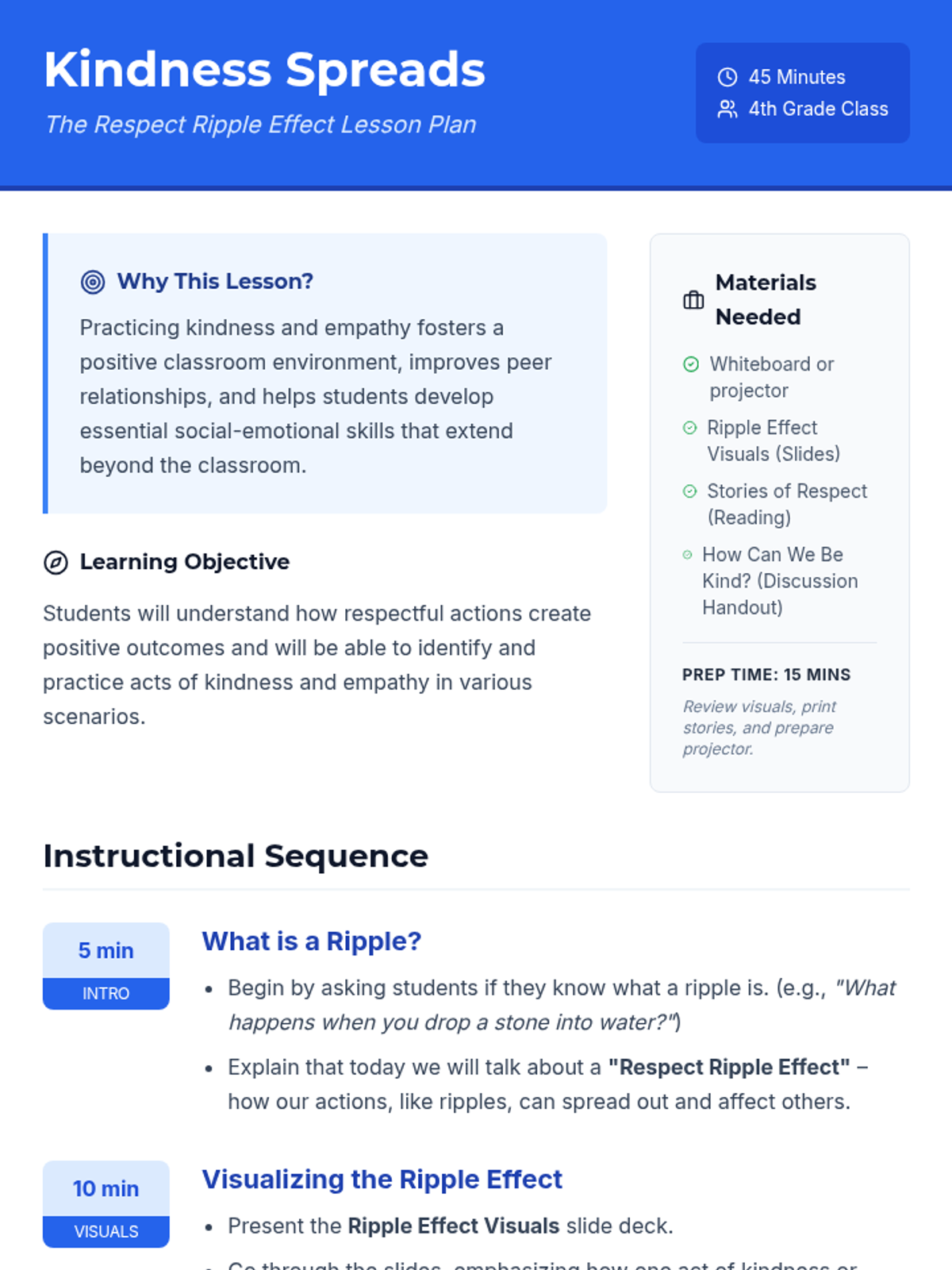 A 45-minute social-emotional learning lesson for 4th graders that uses the 'ripple effect' metaphor to teach how small acts of respect and kindness impact the whole community.