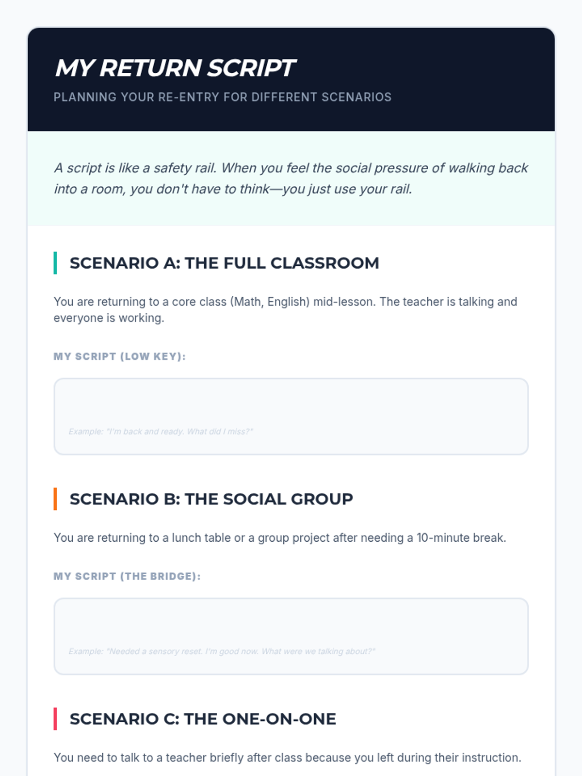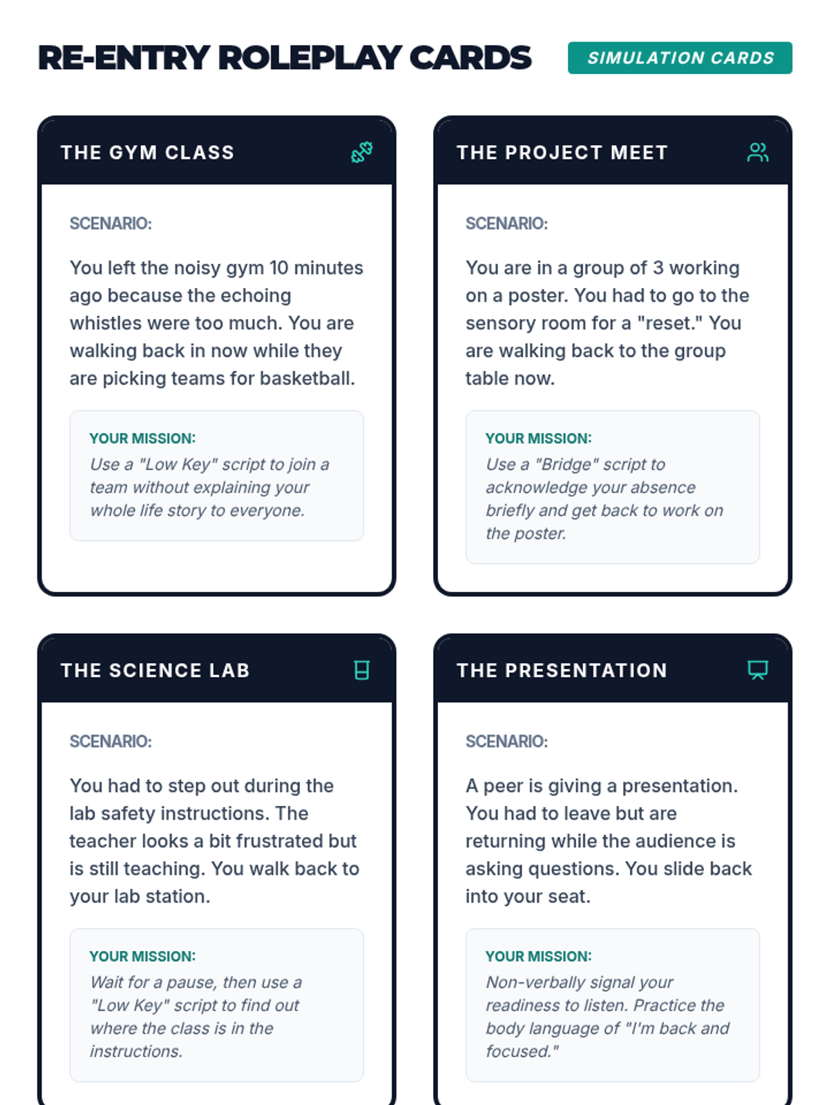Students develop and practice scripts for re-entering social or classroom environments after a period of dysregulation.