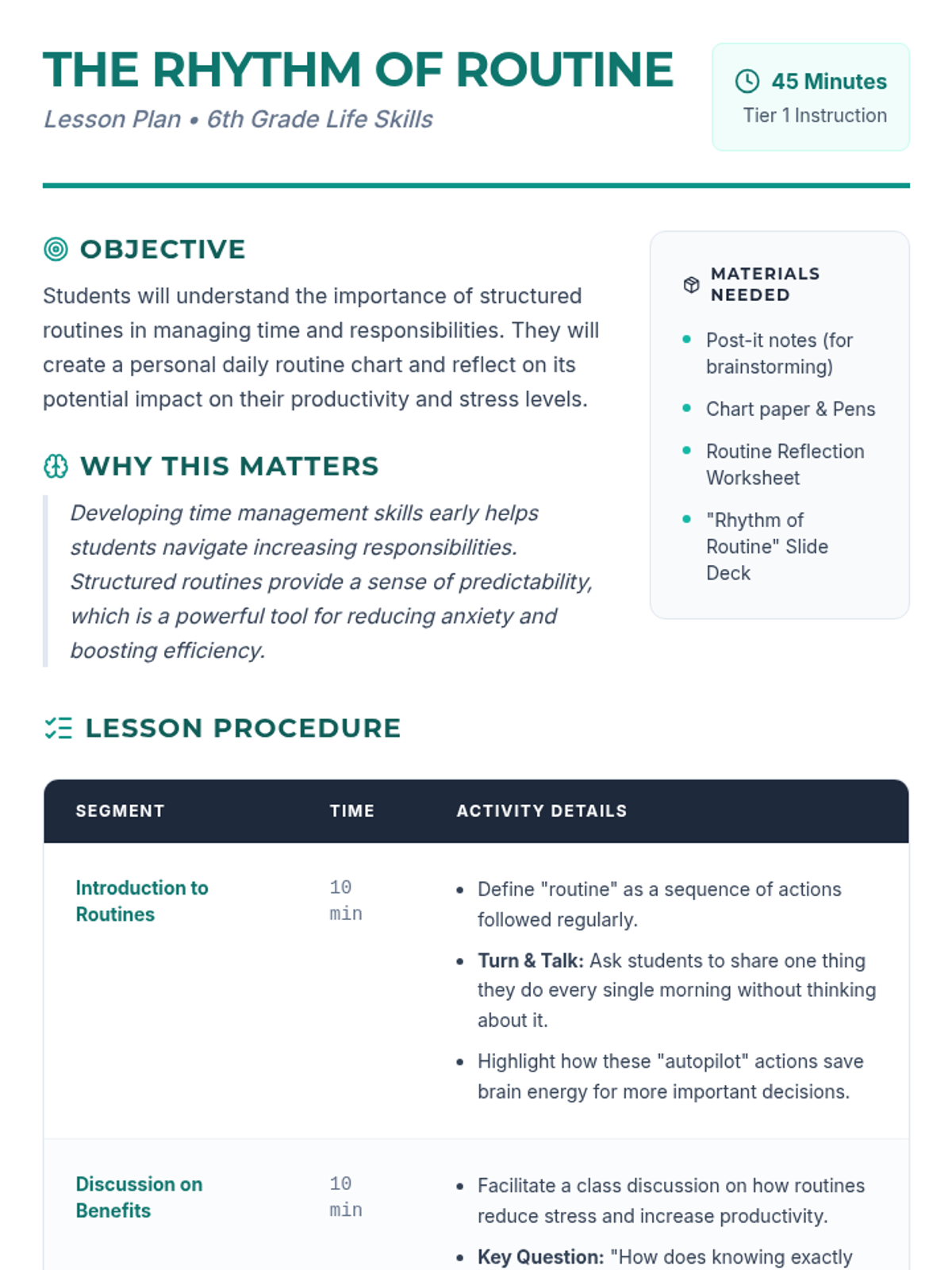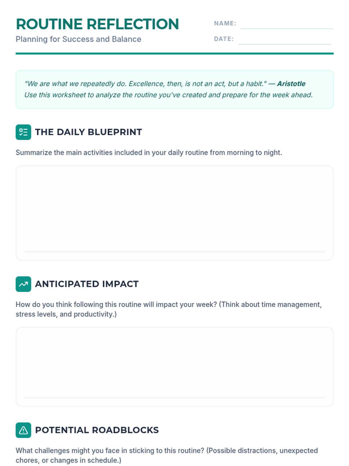 Students explore how structured daily routines improve time management, boost productivity, and reduce stress through discussion and personal planning.
