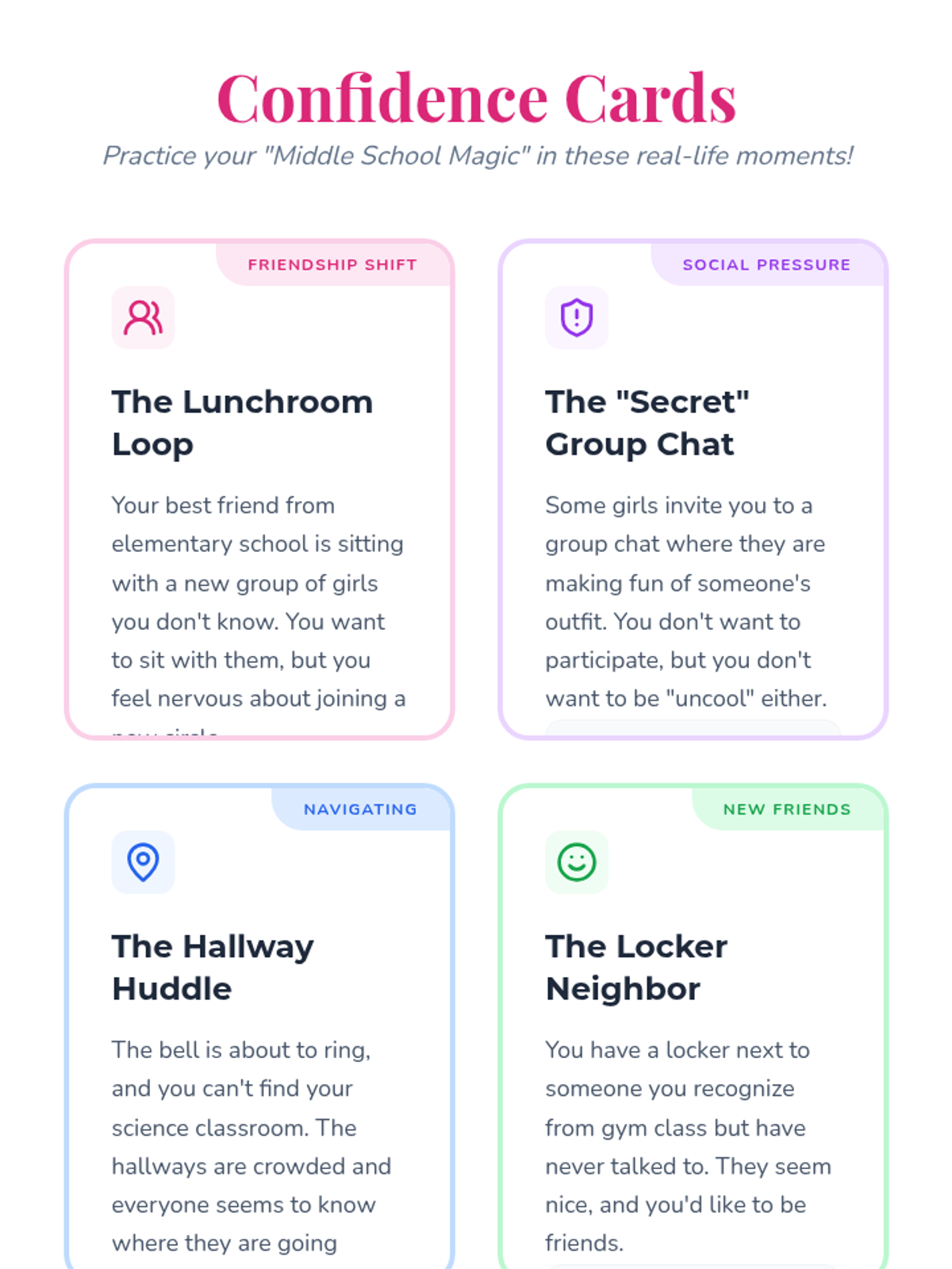 A 30-minute interactive session for 5th-grade girls to build confidence for middle school, focusing on friendship shifts, social pressures, and navigating larger environments.
