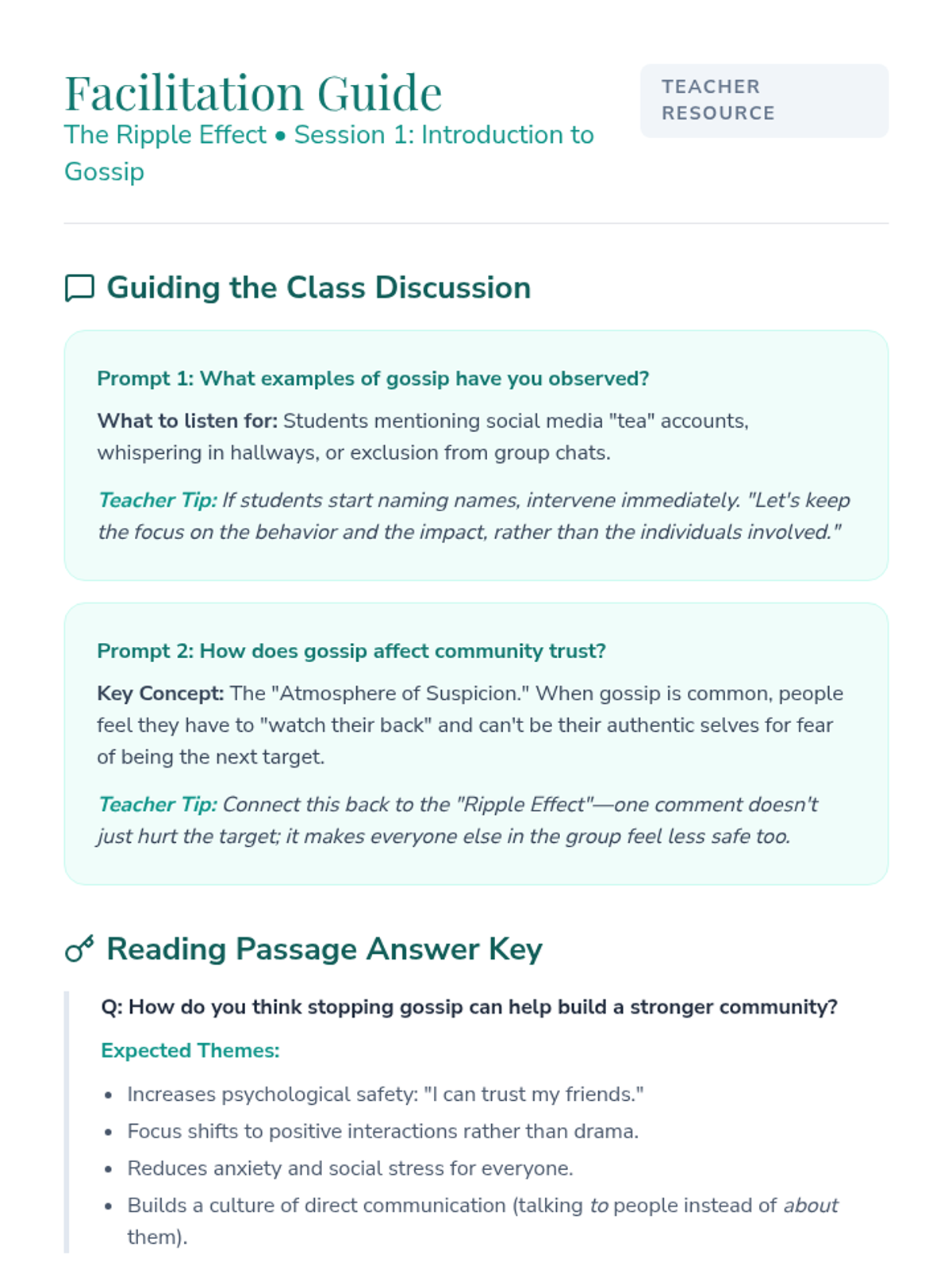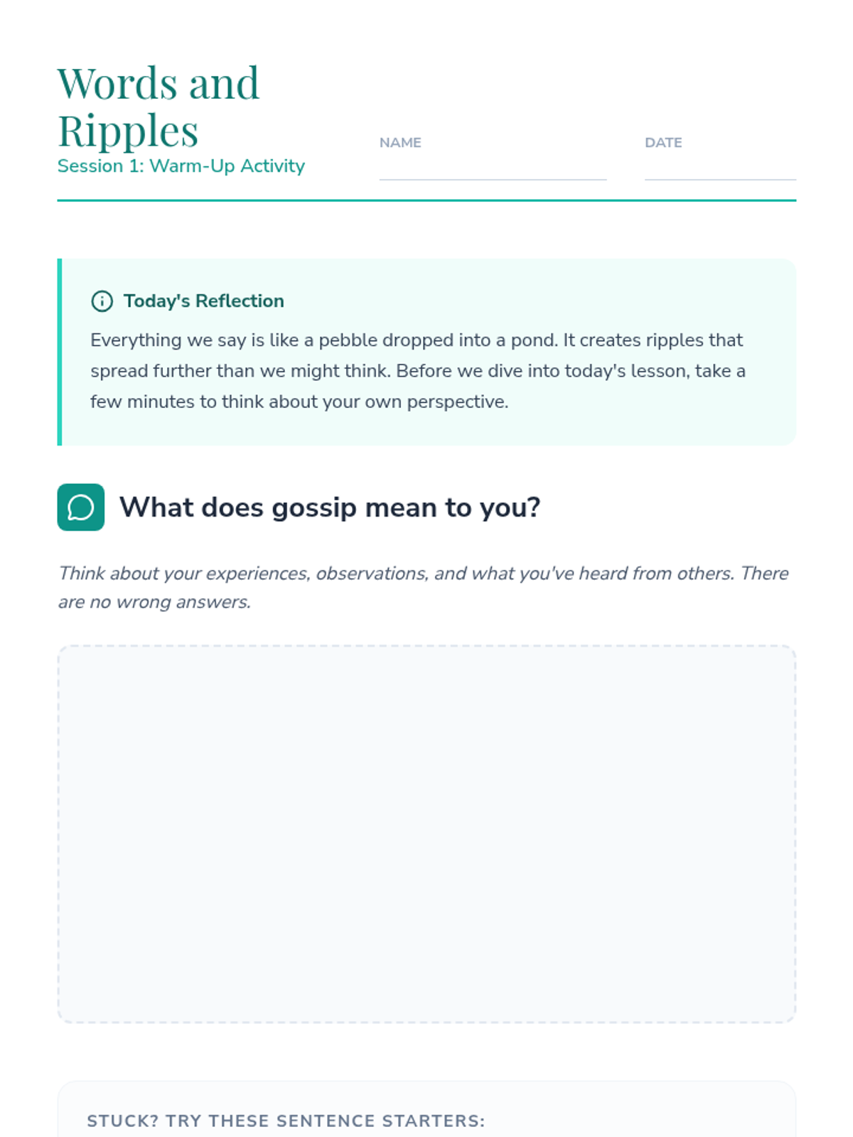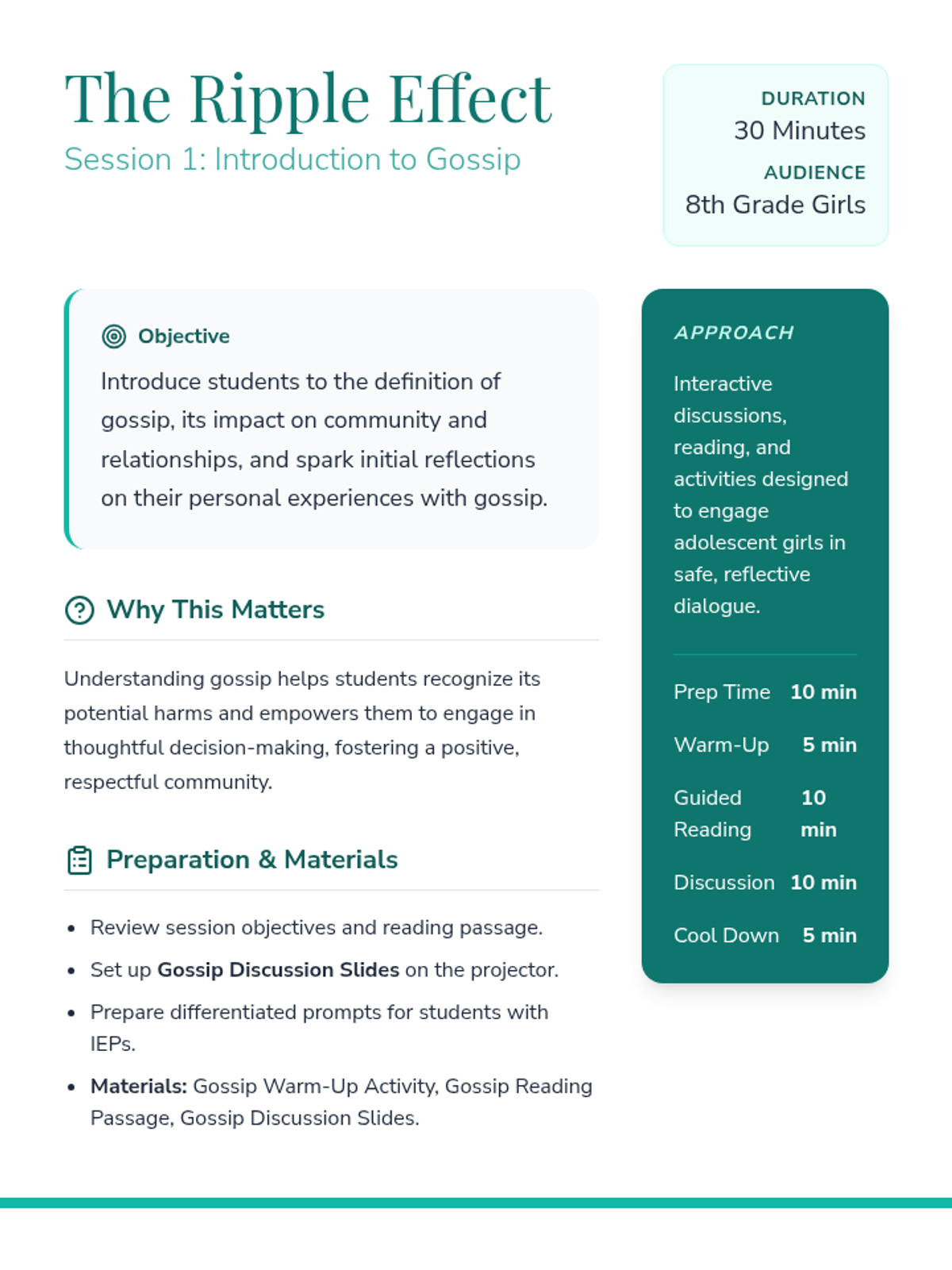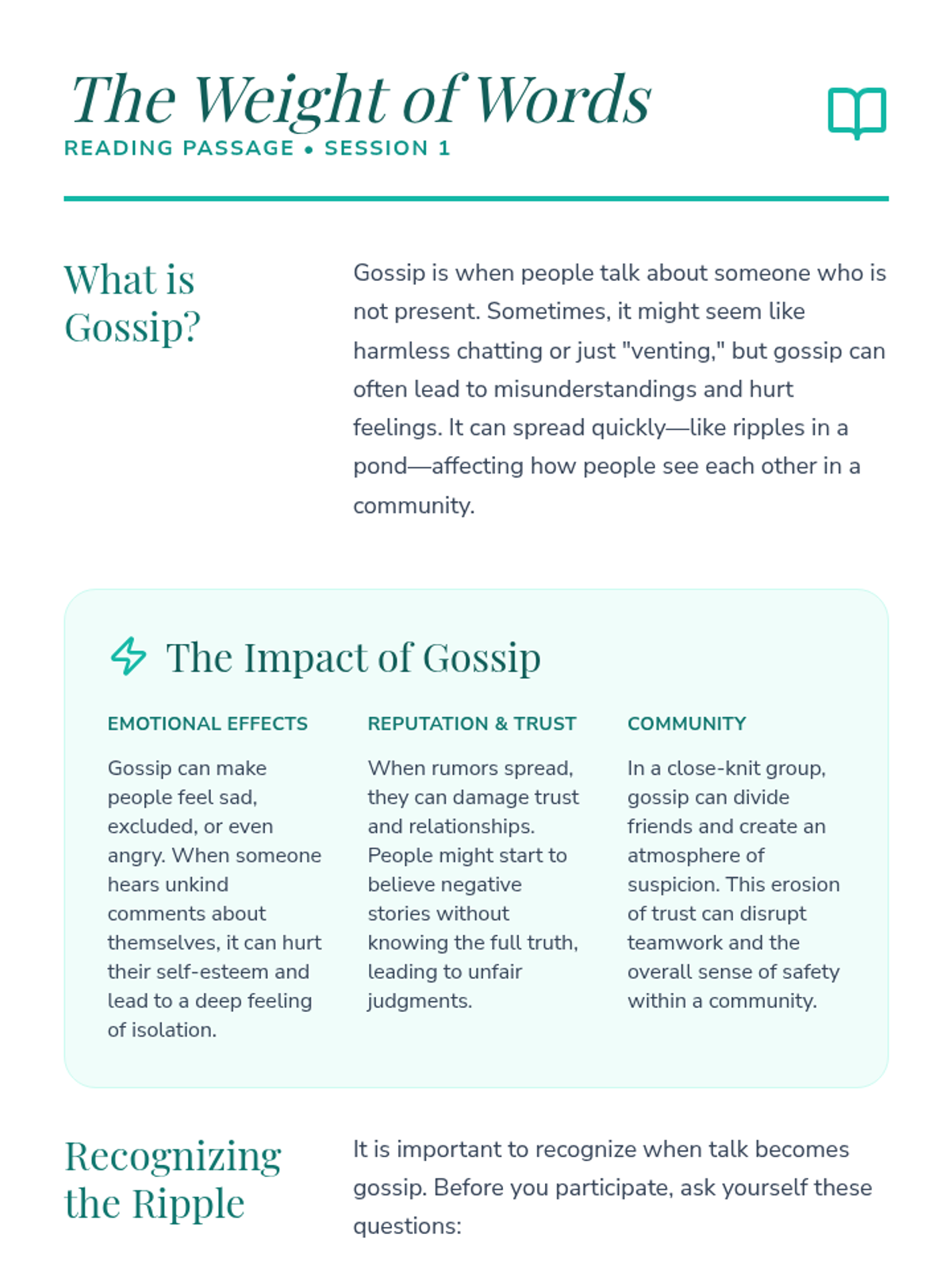 A lesson designed for 8th-grade girls to explore the definition of gossip and its cascading impact on individuals and their community. Students engage in reflection, reading, and guided discussion to understand the 'ripple effect' of their words.