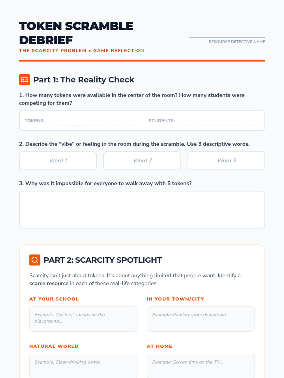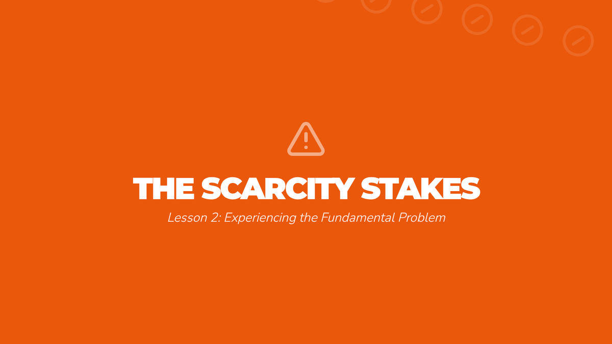 Through an interactive 'Token Scramble' game, students experience the physical and emotional reality of scarcity. They define scarcity as the fundamental economic condition where unlimited wants meet limited resources.