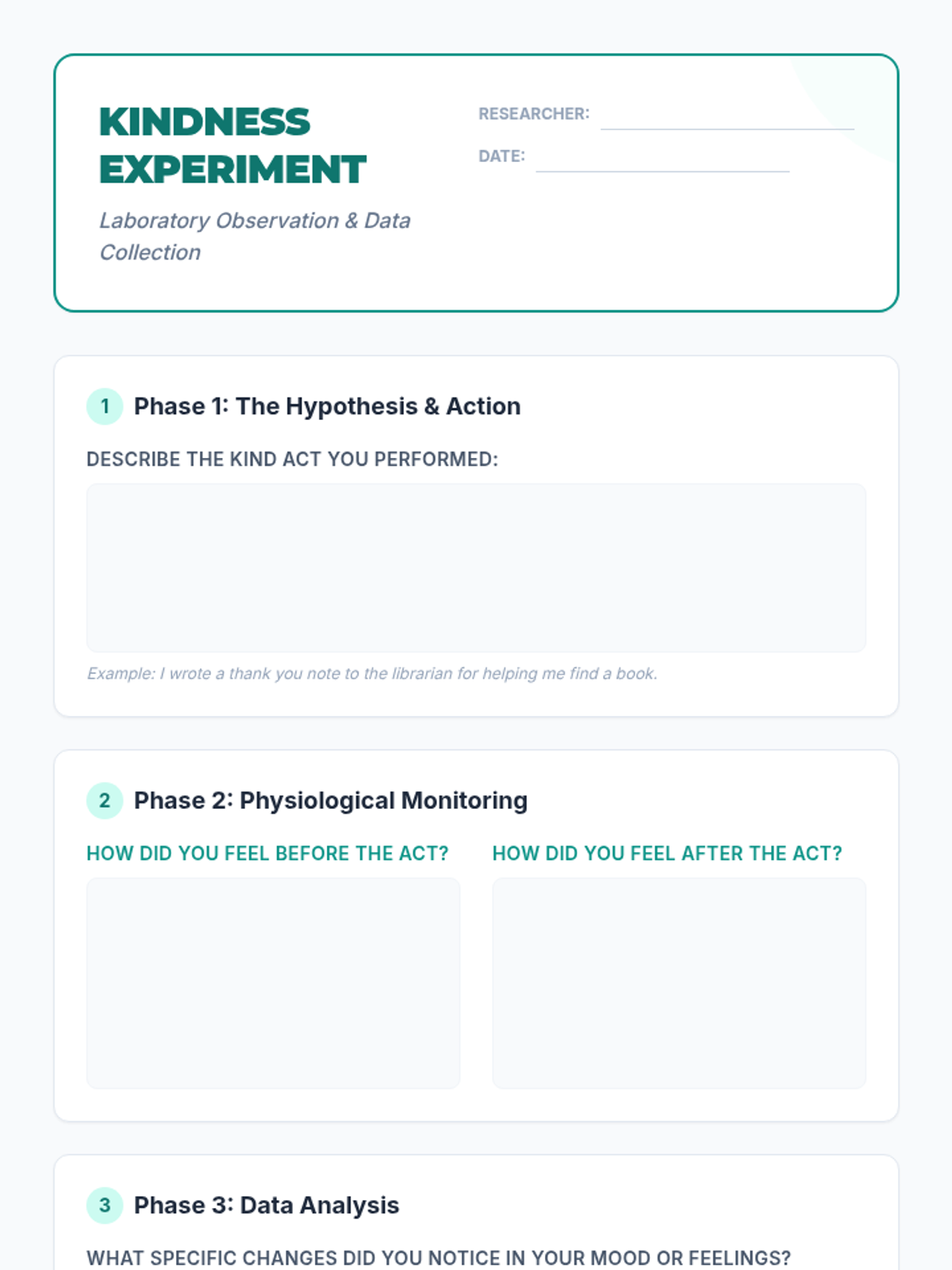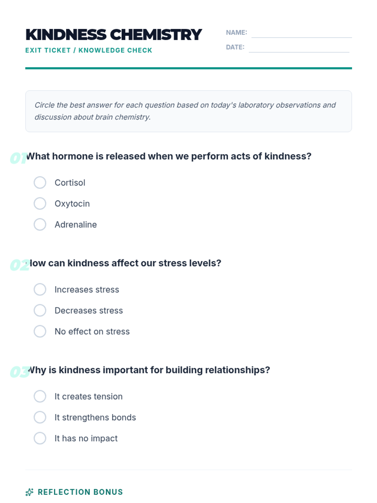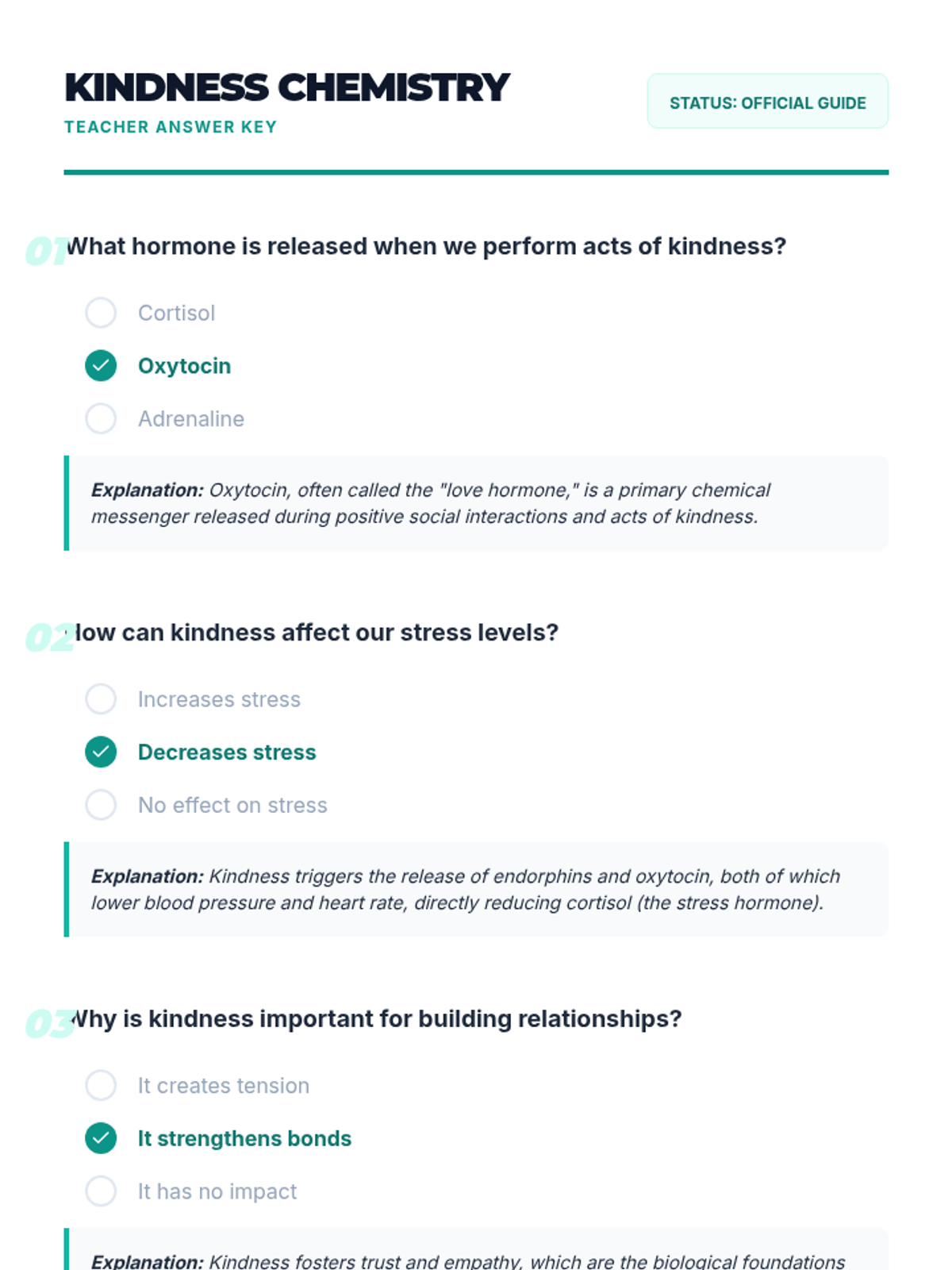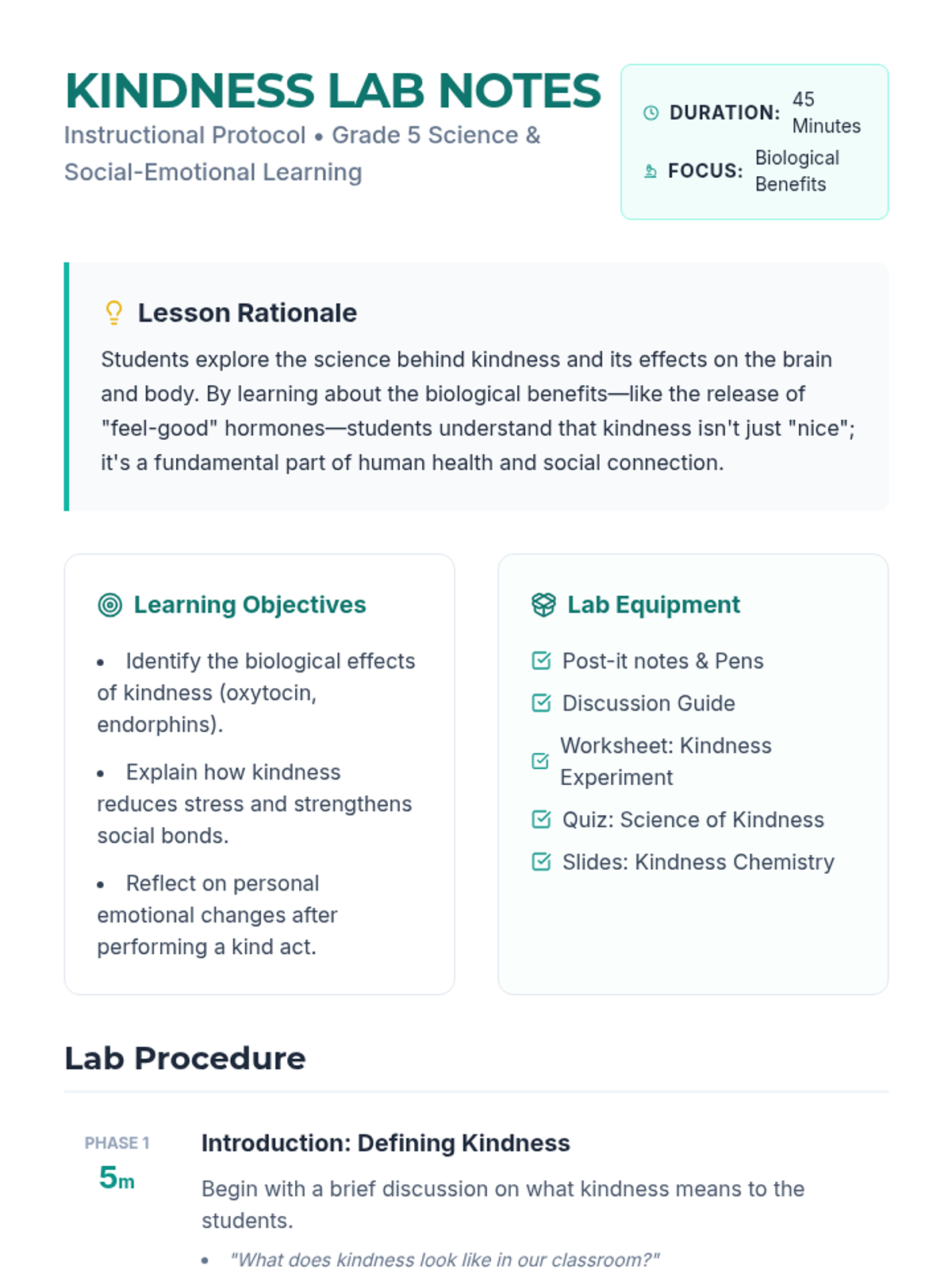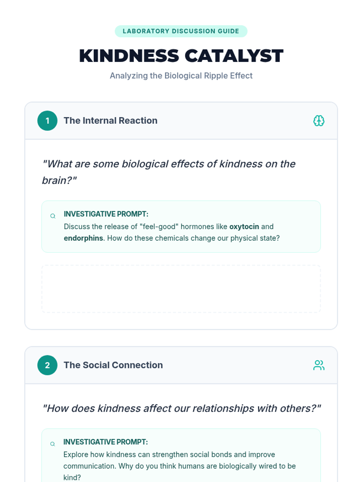 Students explore the biological and psychological effects of kindness on the brain and body, learning about hormones like oxytocin and endorphins while performing a real-world 'kindness experiment'.