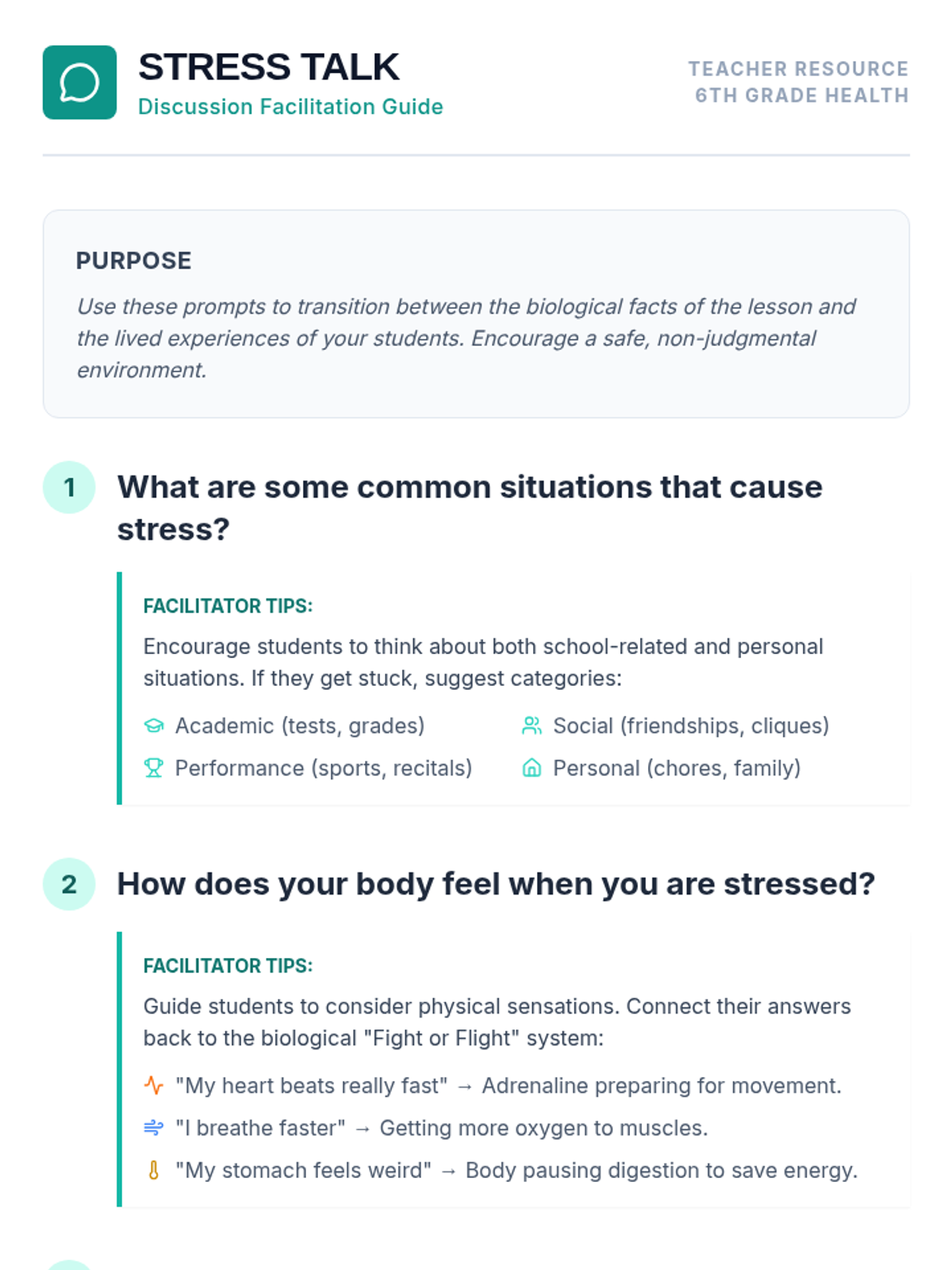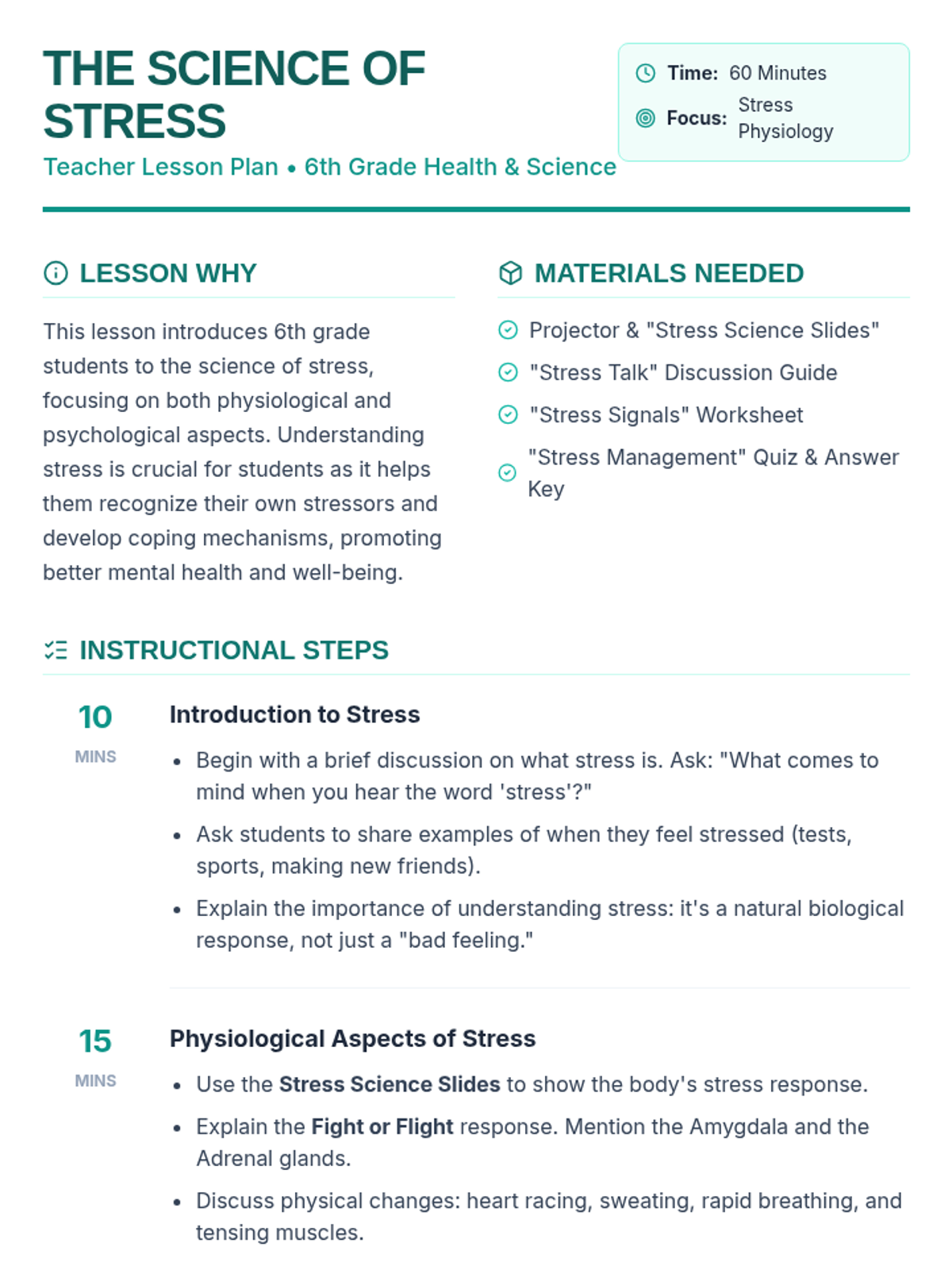 This lesson introduces 6th grade students to the science of stress, focusing on both physiological and psychological aspects. Students will learn how the body responds to stress and explore strategies to manage these responses effectively.