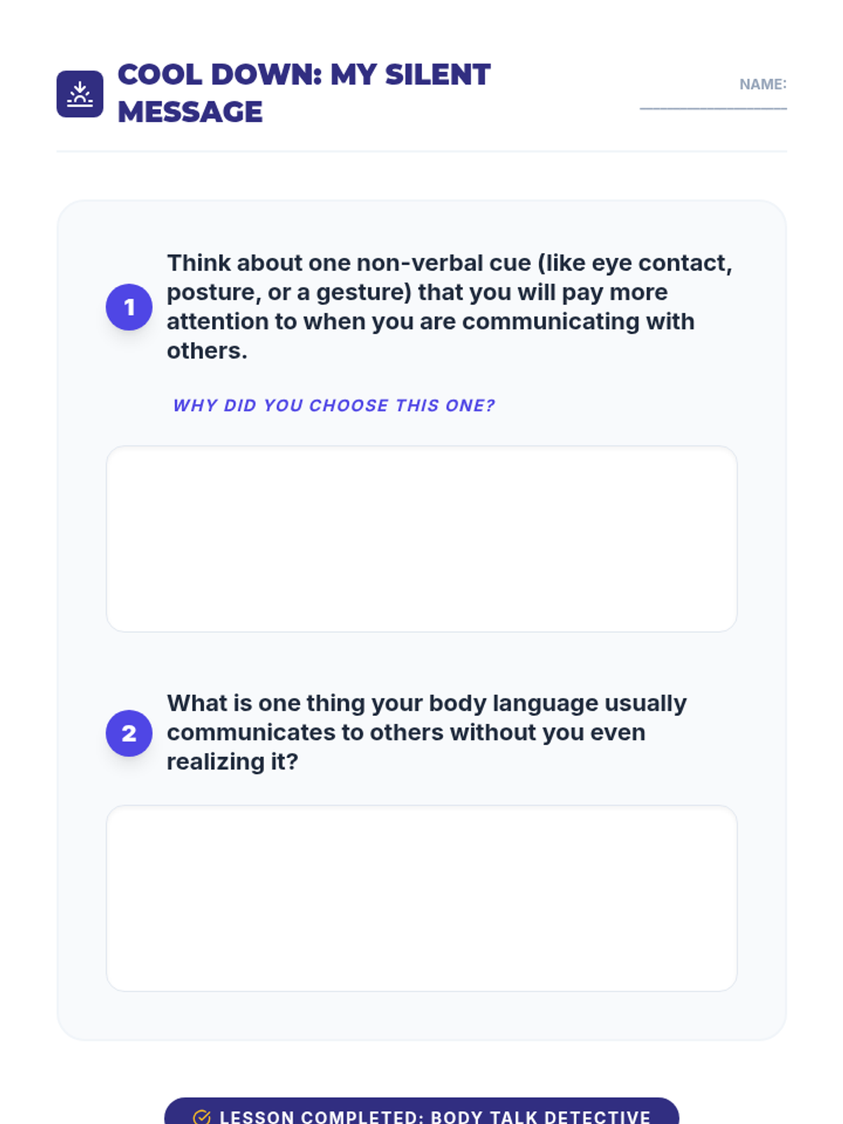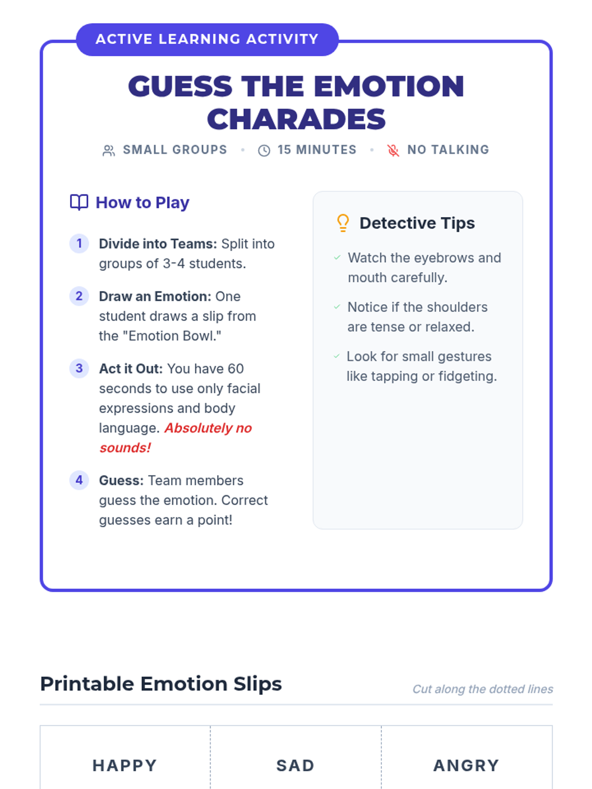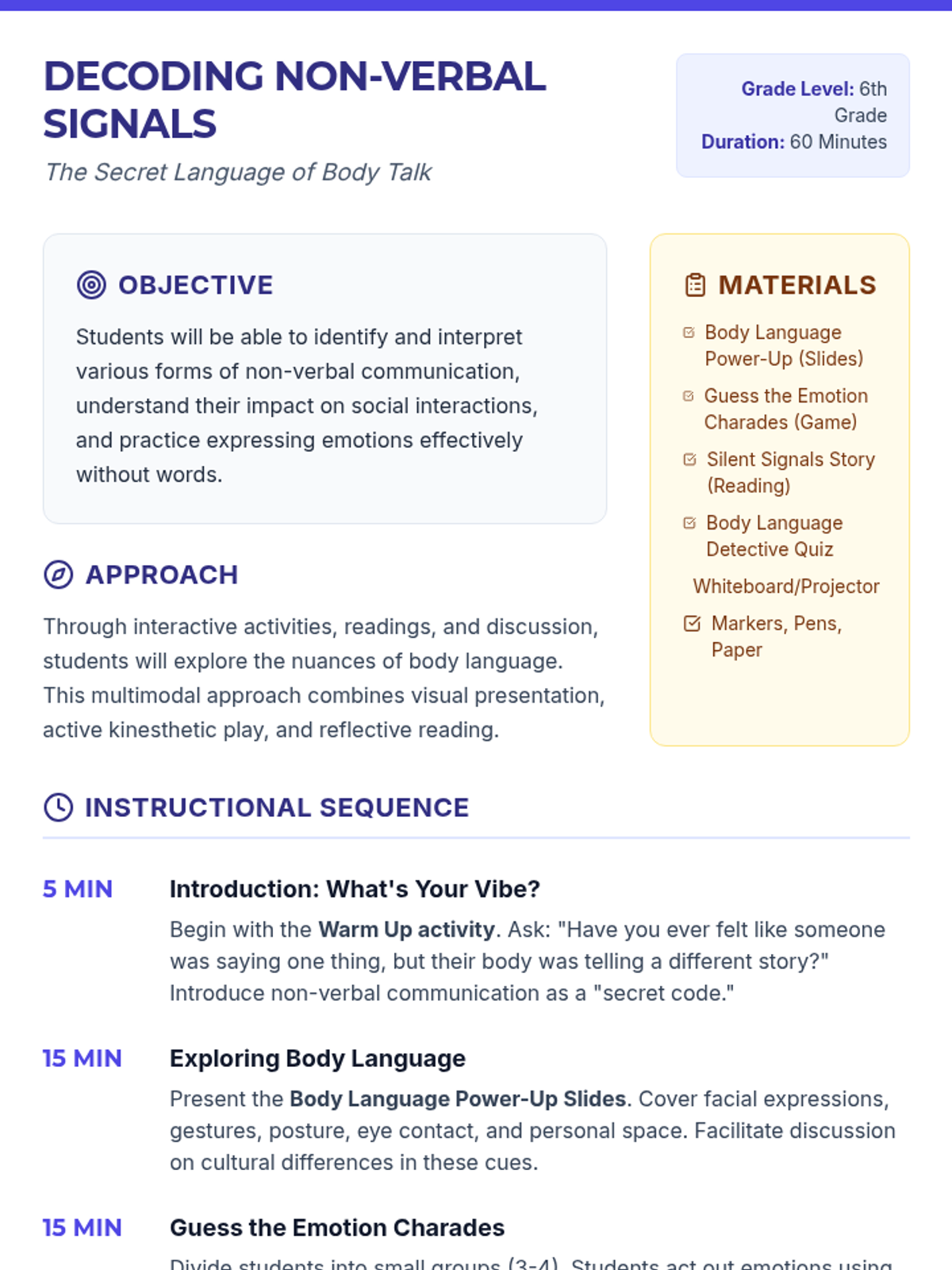 A 60-minute lesson for 6th graders to understand non-verbal communication, 'reading' social cues, and effectively using body language to communicate feelings.