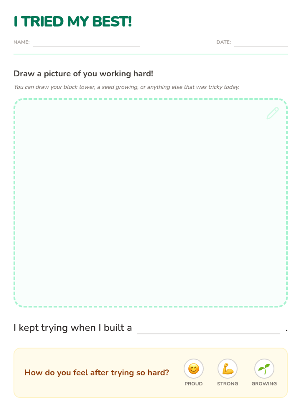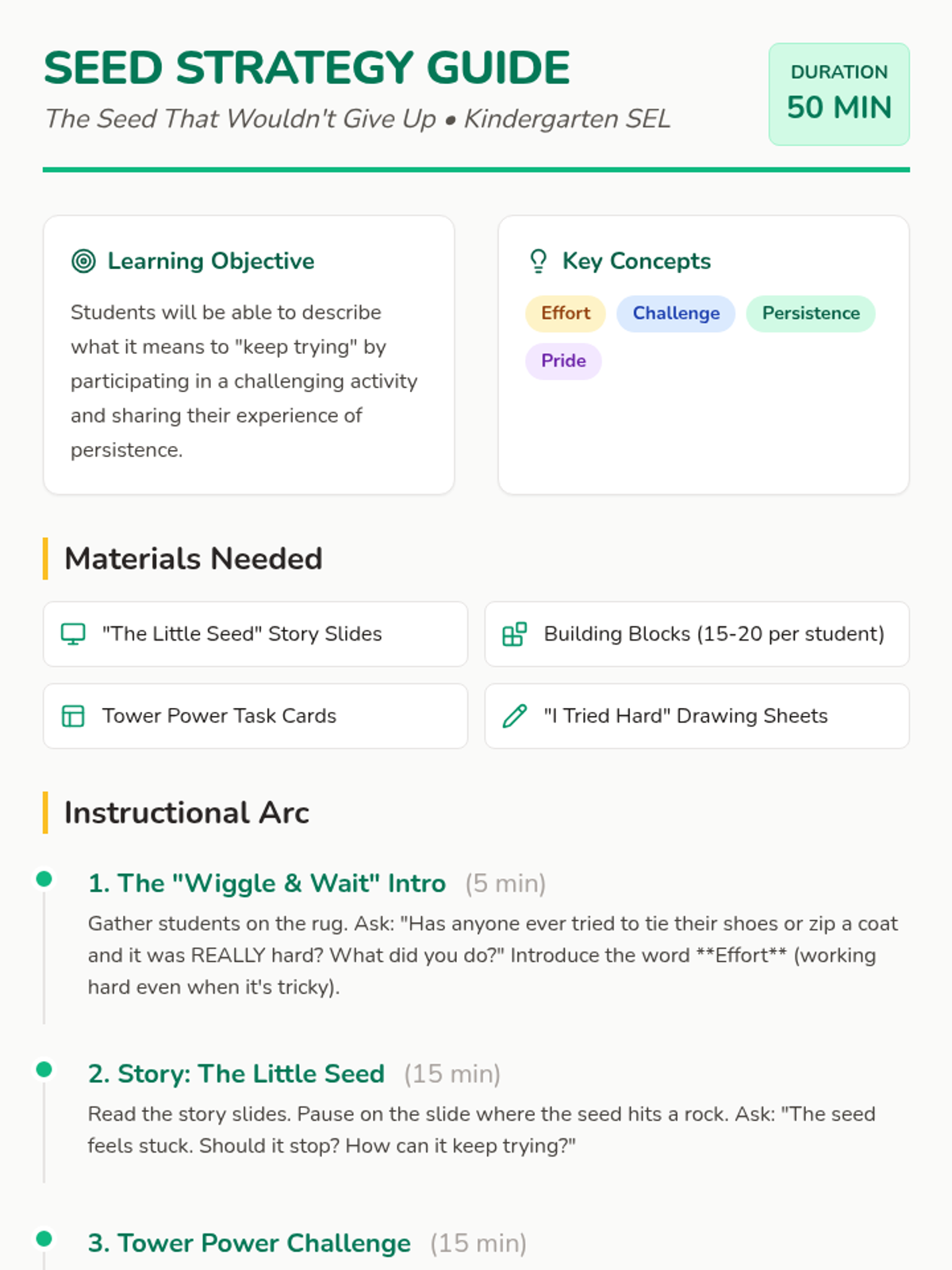 A 50-minute social-emotional learning lesson for Kindergarten focused on perseverance, effort, and the pride of overcoming challenges through the story of a determined little seed.