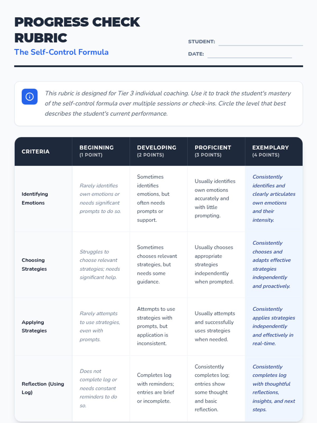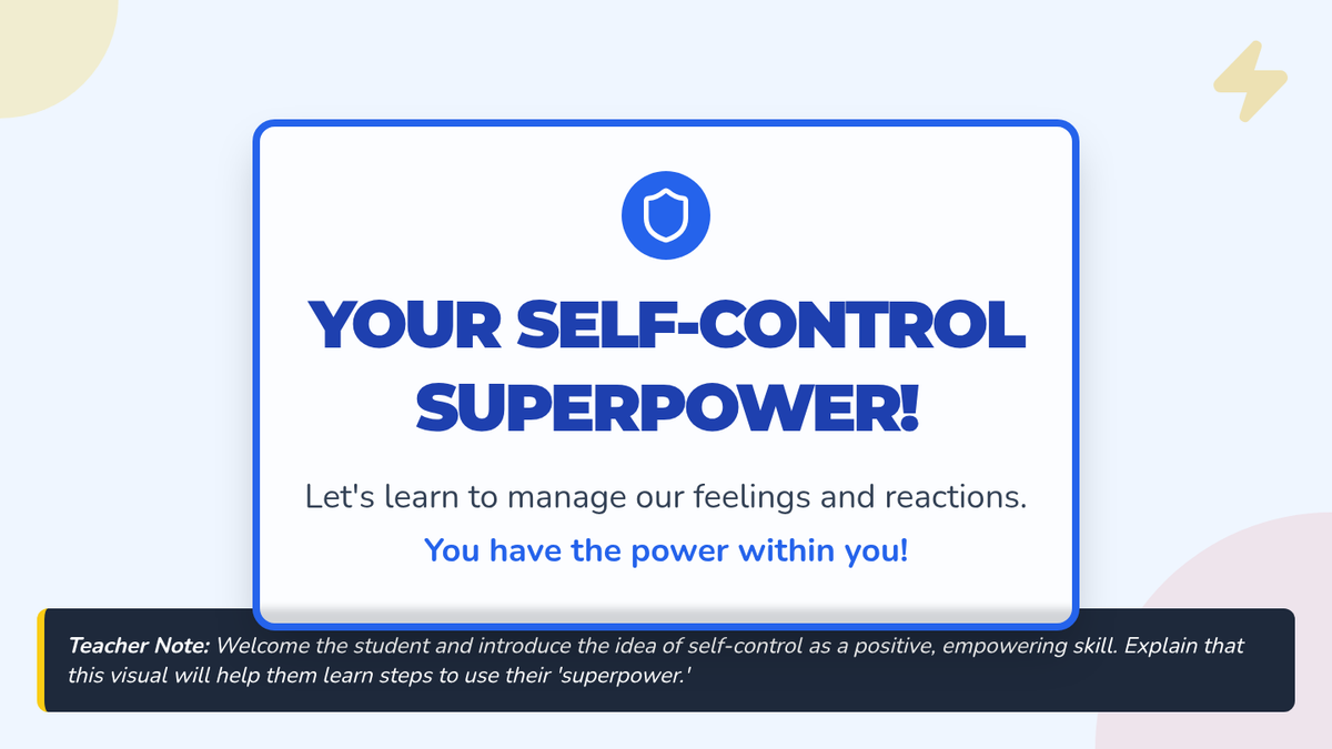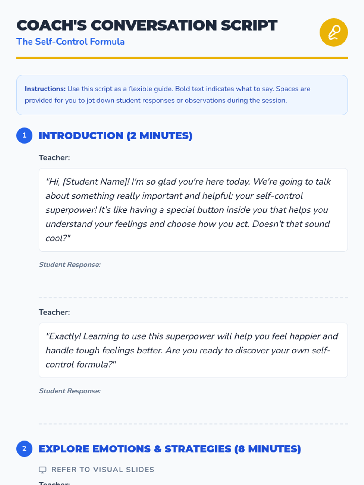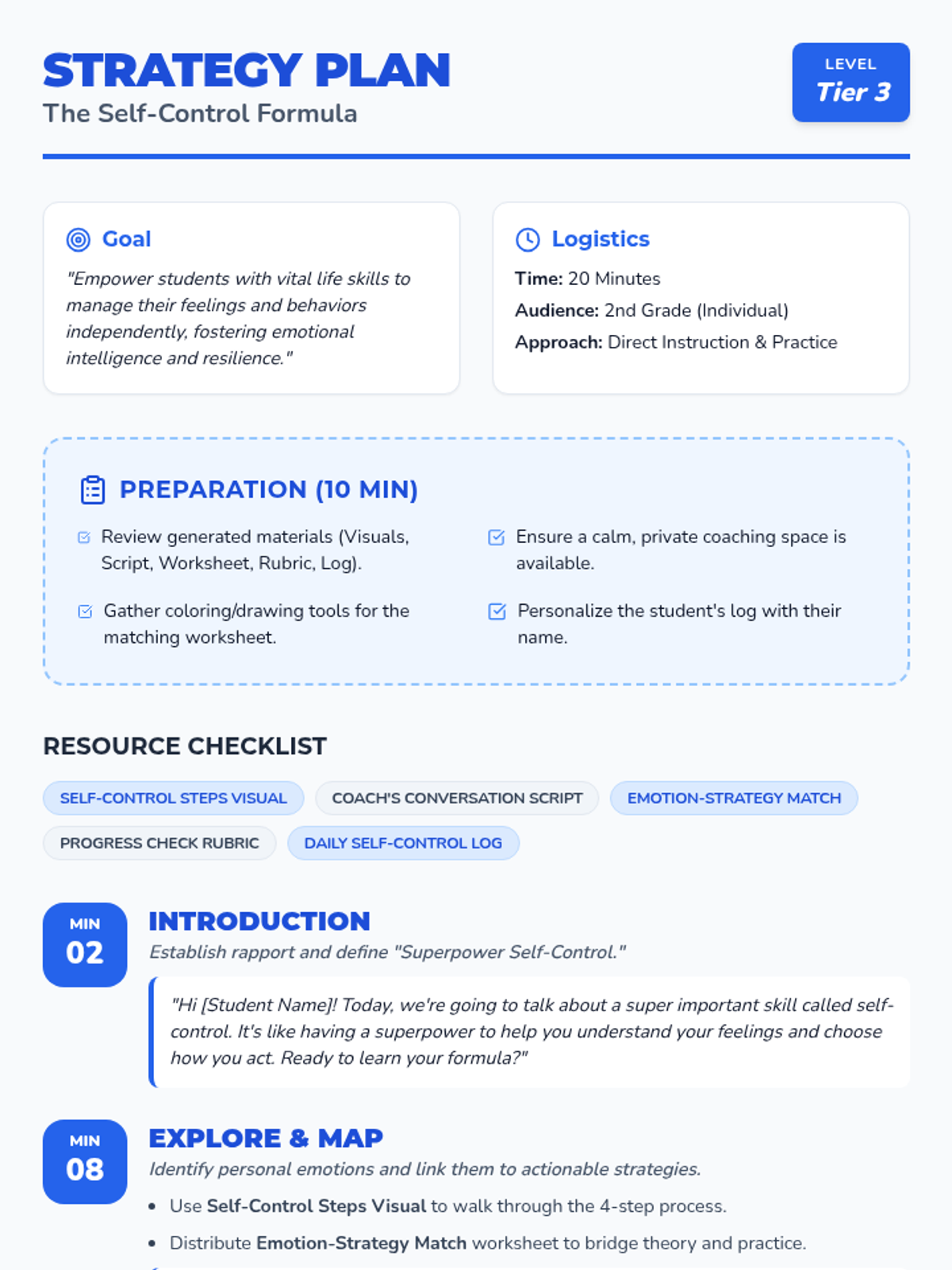 A Tier 3 individual coaching session for 2nd graders to identify emotions and master self-regulation strategies using a 'superpower' framework.