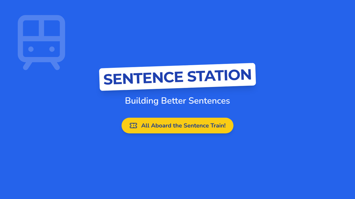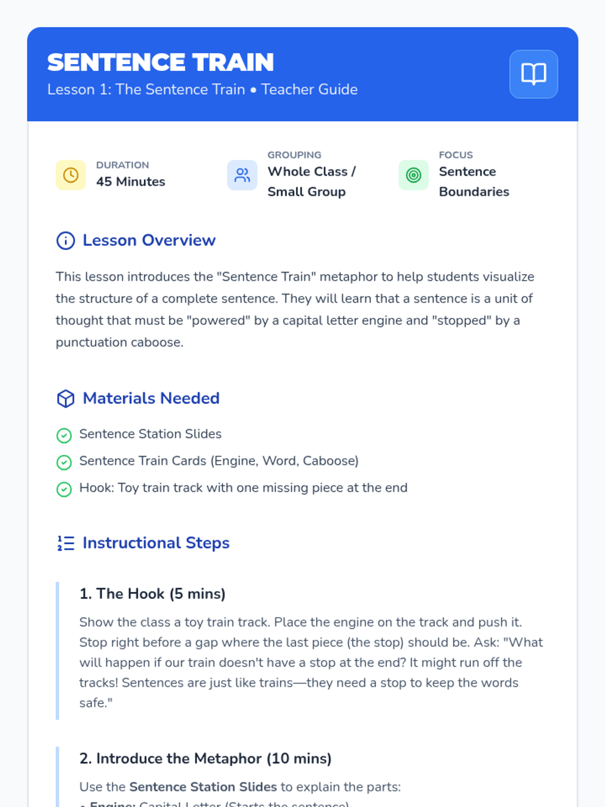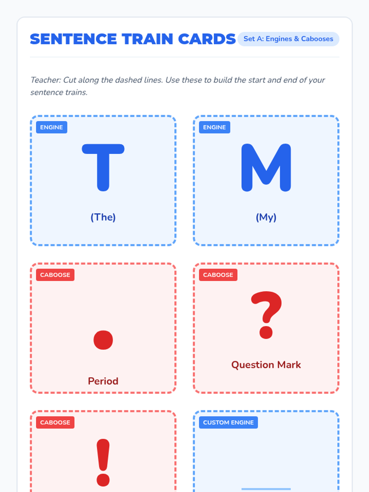 Students visualize sentences as trains, with capital engines and punctuation cabooses, using physical blocks or cards to build complete sentence structures.