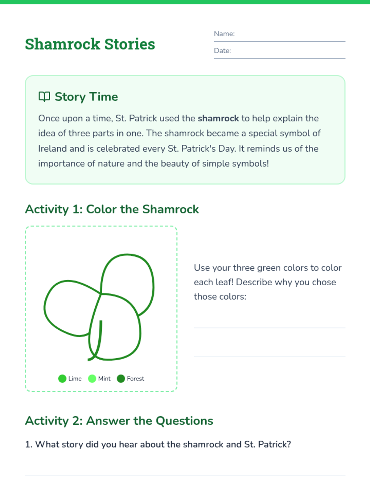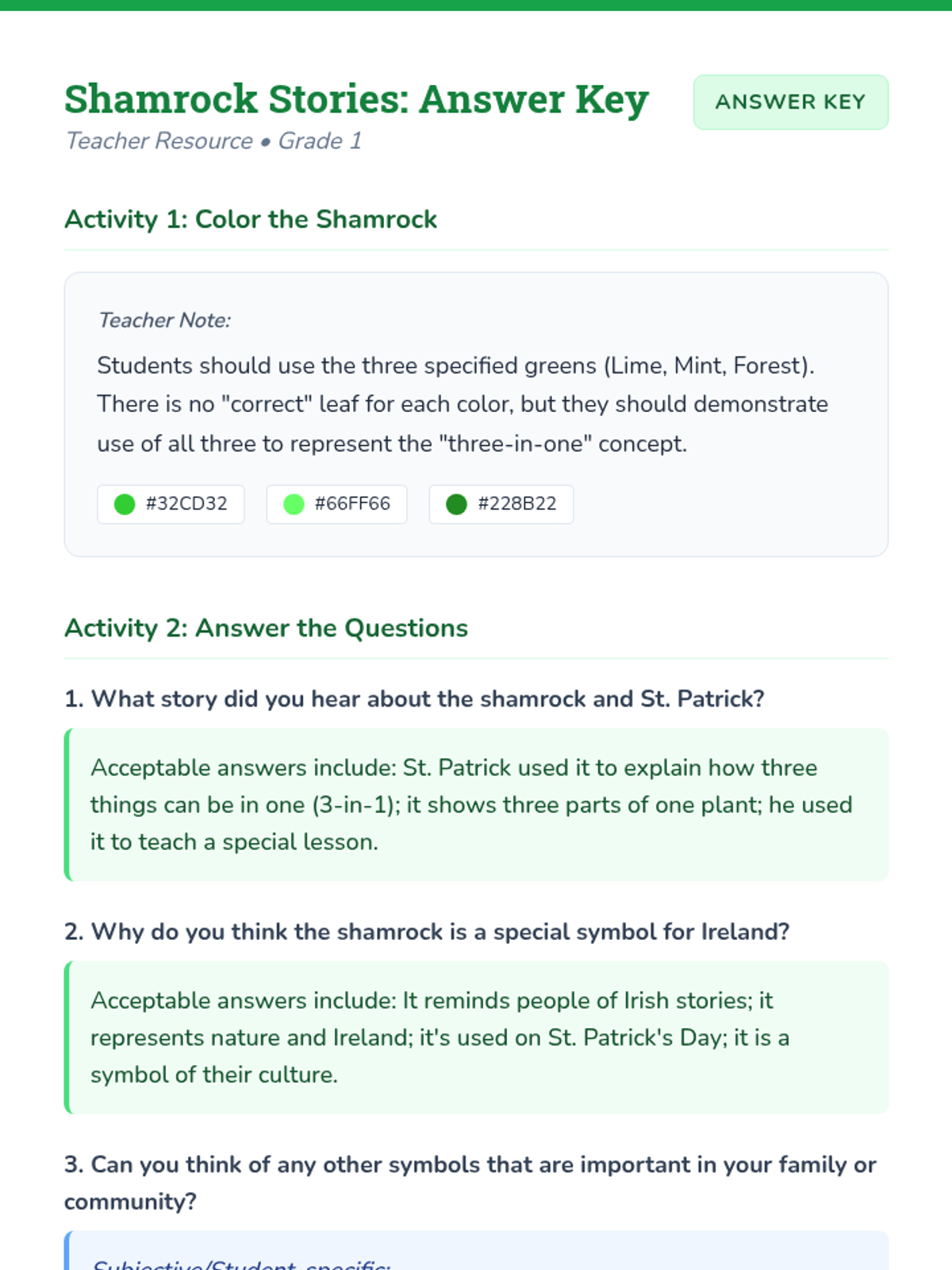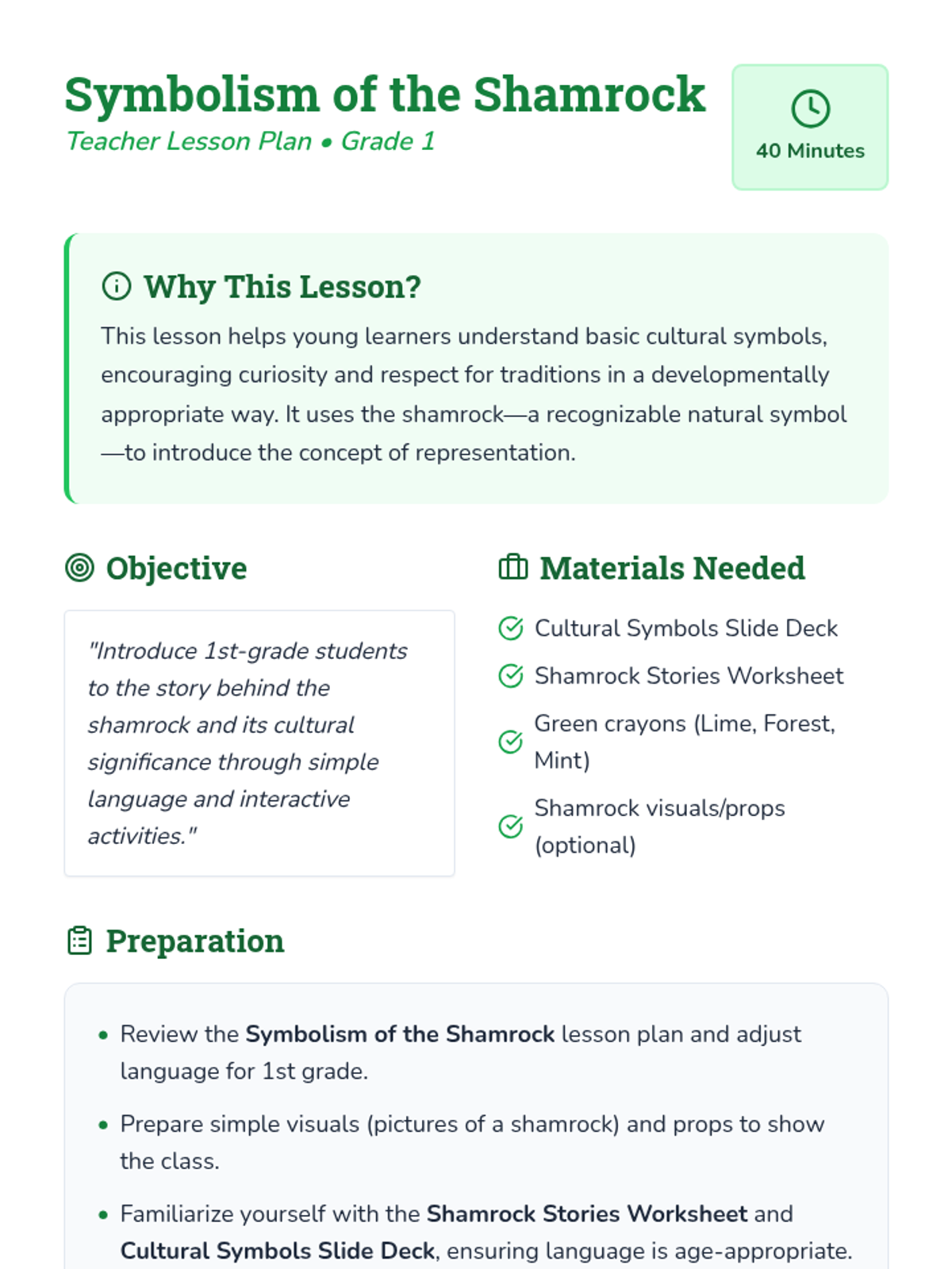 A 40-minute 1st-grade lesson exploring the cultural significance of the shamrock and its association with St. Patrick through storytelling and creative activities.