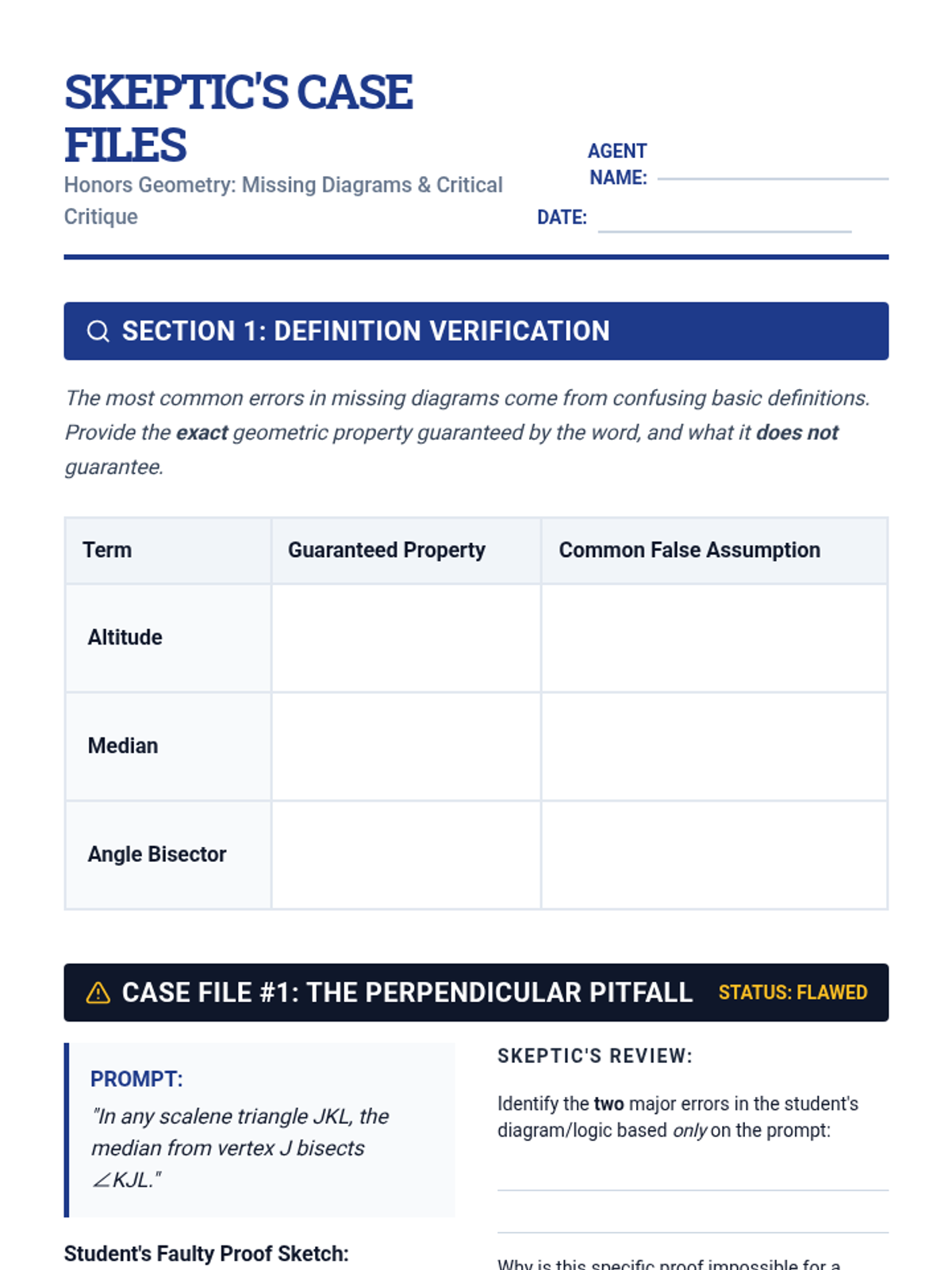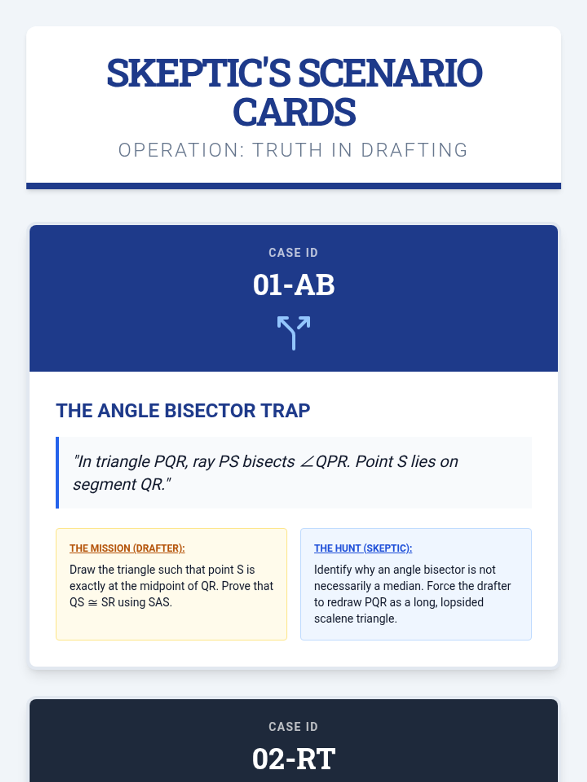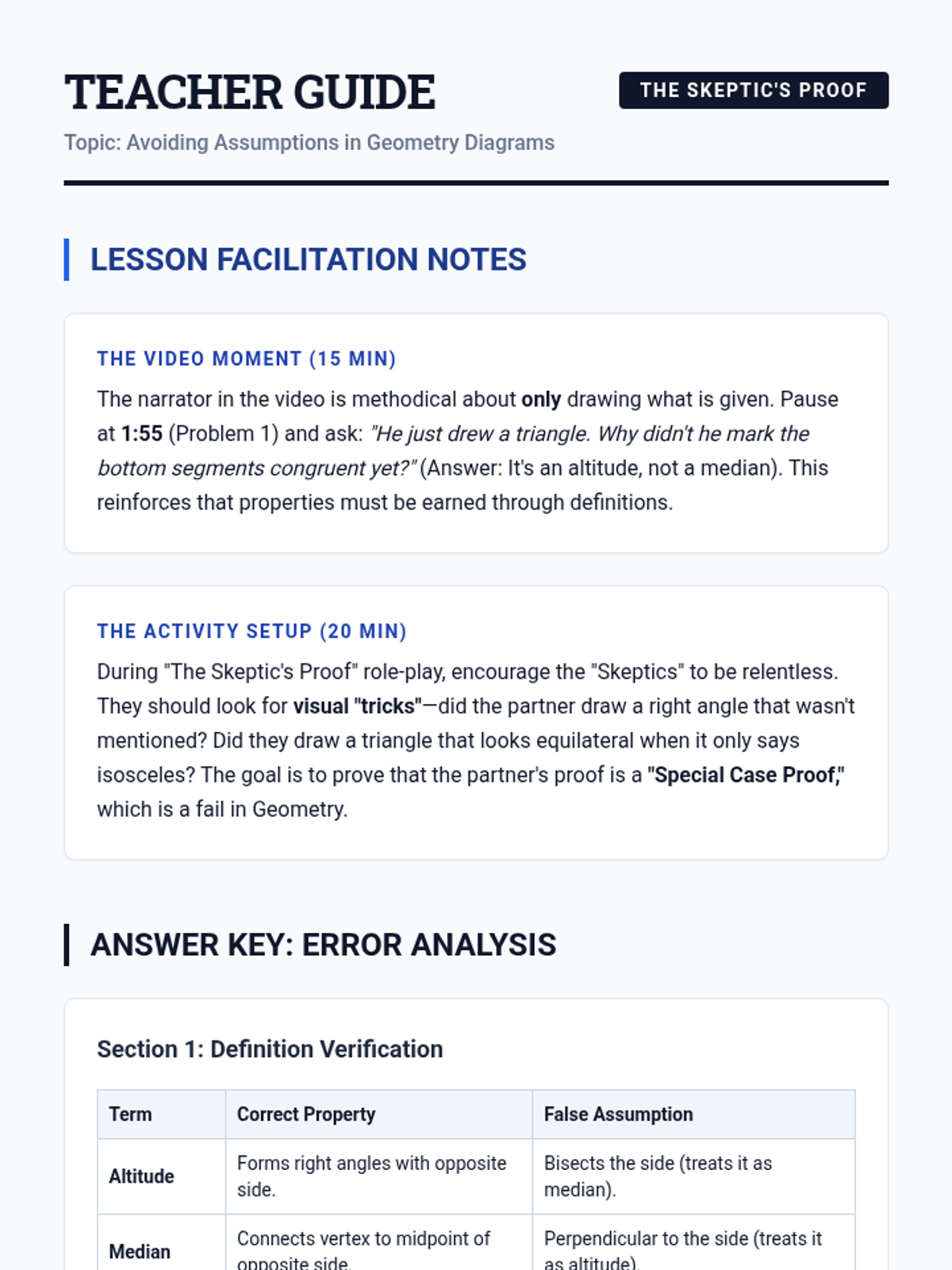 A lesson focused on the dangers of over-assuming in geometric diagrams. Students will analyze proofs from text-only prompts, critique flawed diagrams, and practice drawing accurate representations without projecting unintended properties.