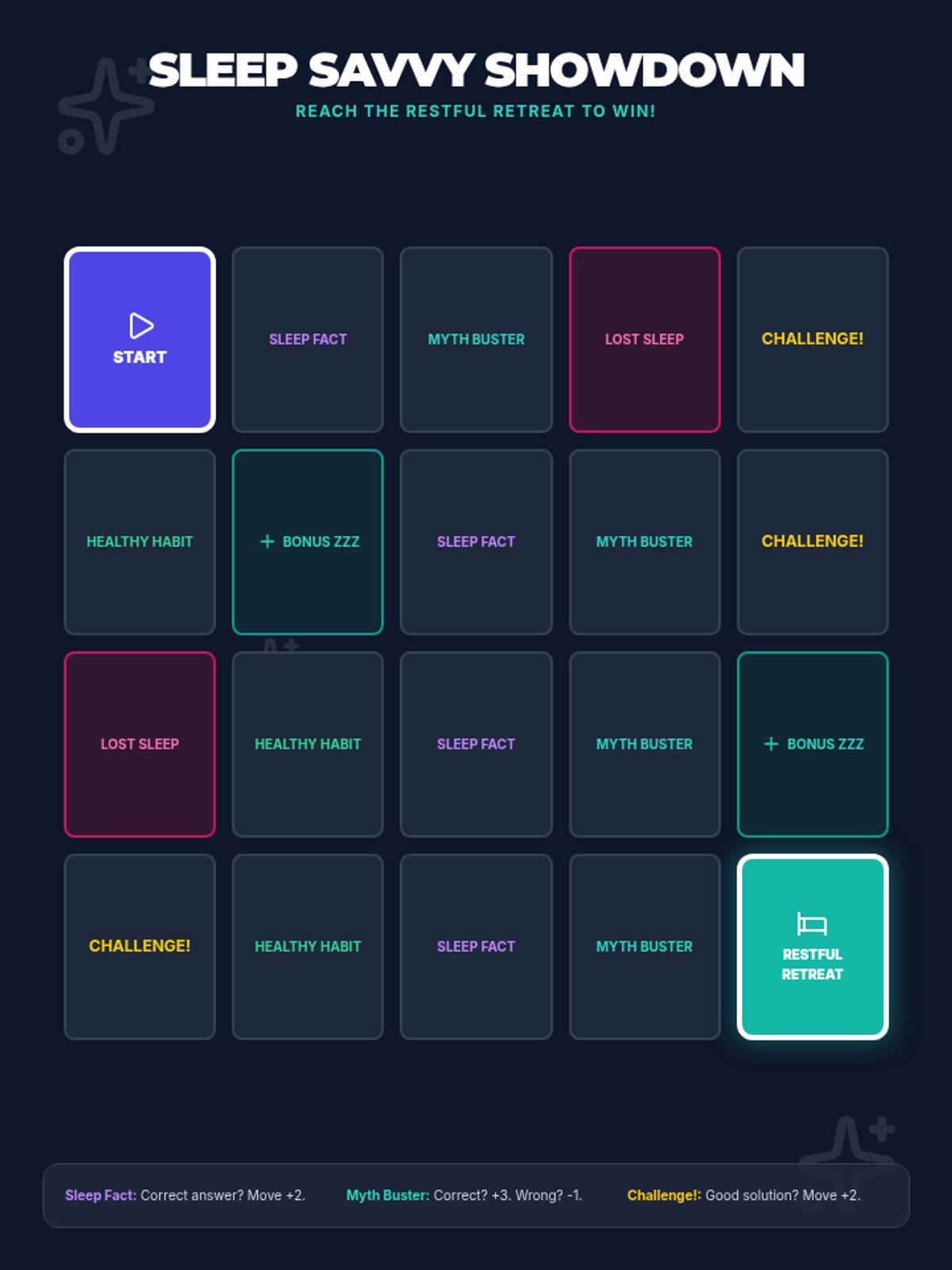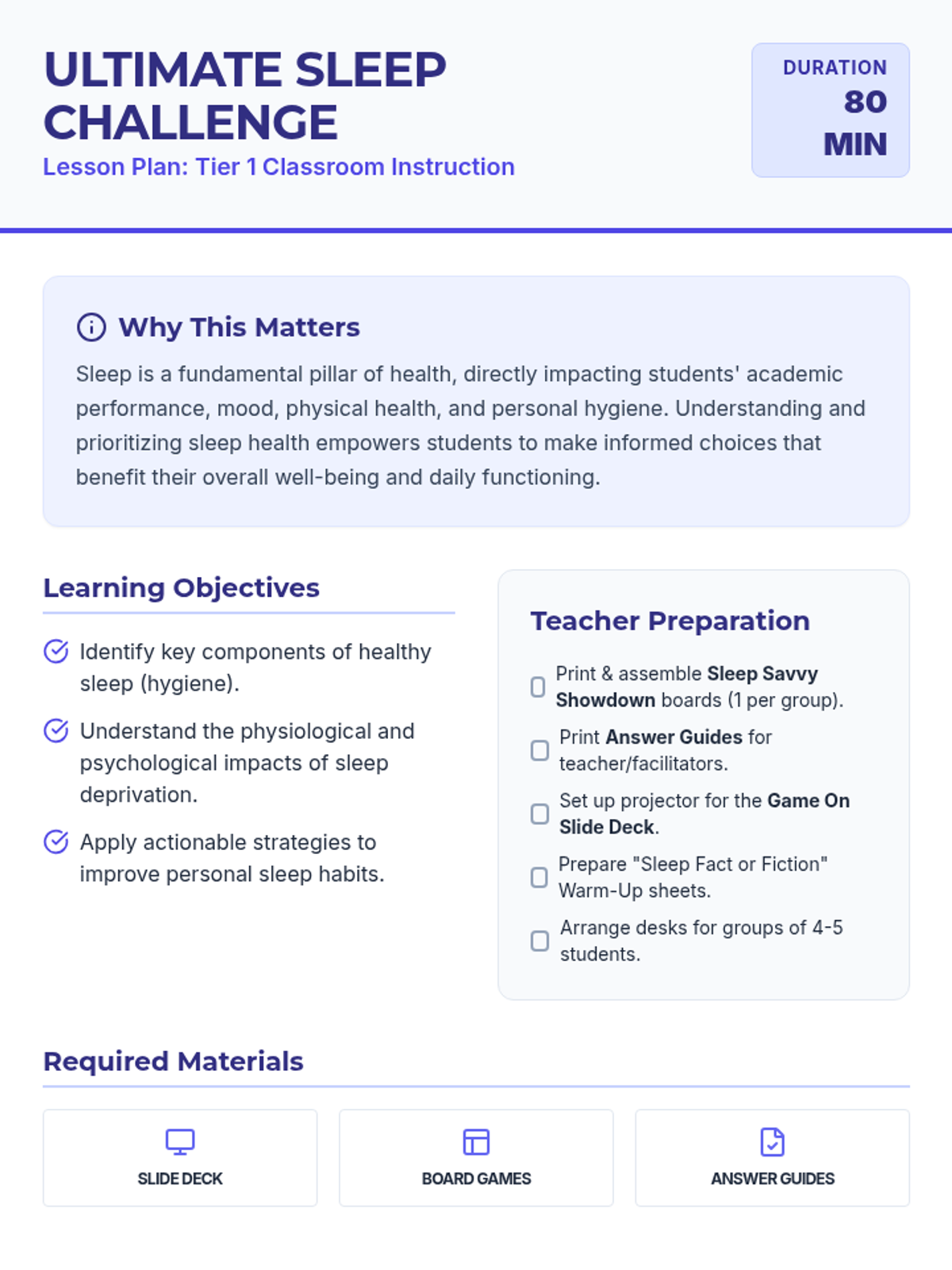 An engaging game-based lesson where 10th-grade students compete to apply sleep health knowledge and build better habits through a board game and interactive discussions.