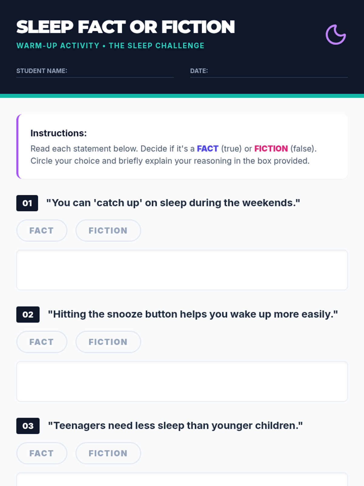 This lesson introduces students to healthy sleep hygiene habits through a personalized self-assessment checklist and teacher-led discussion. It focuses on concrete, actionable steps for improving evening and bedtime routines.