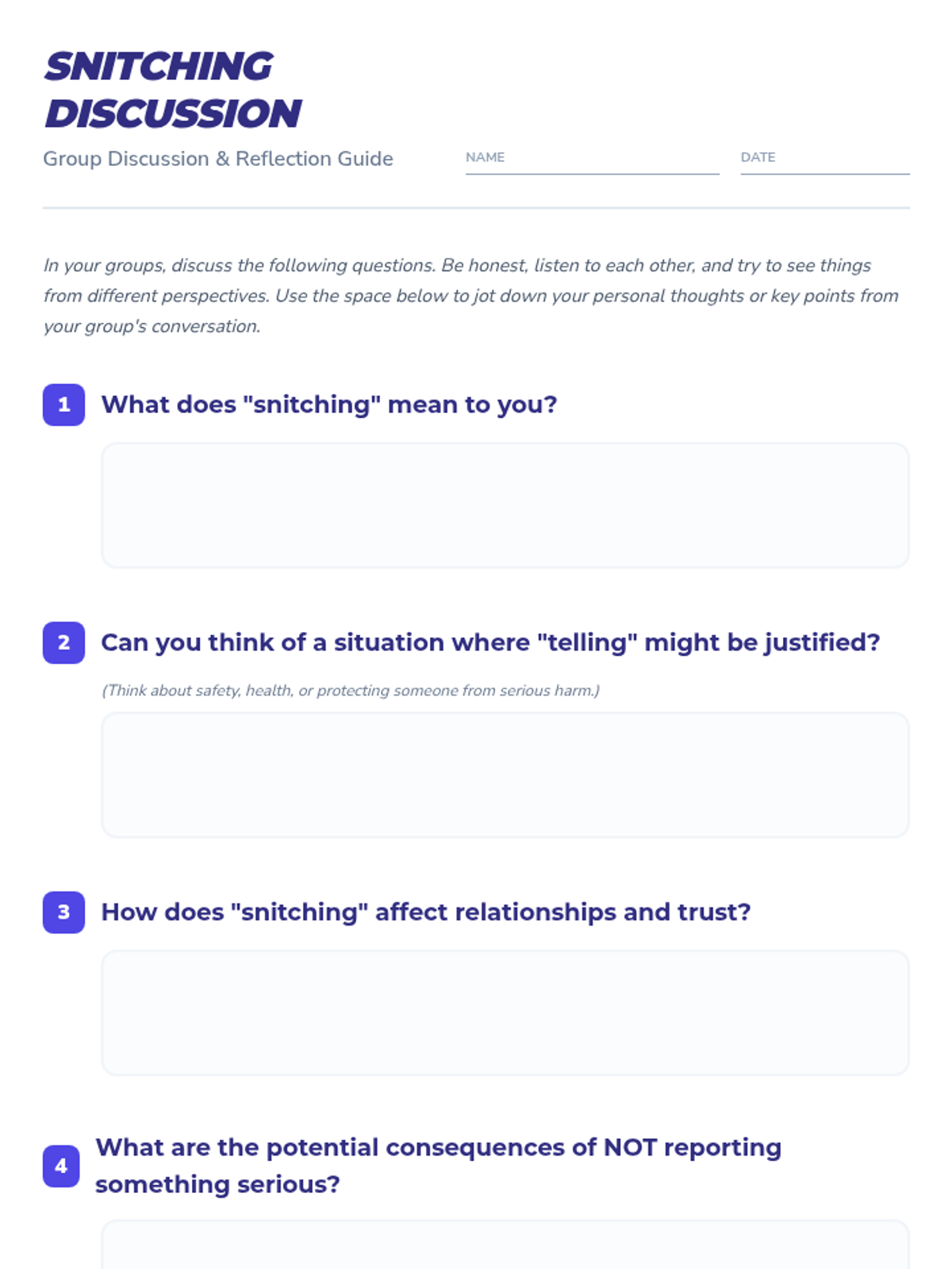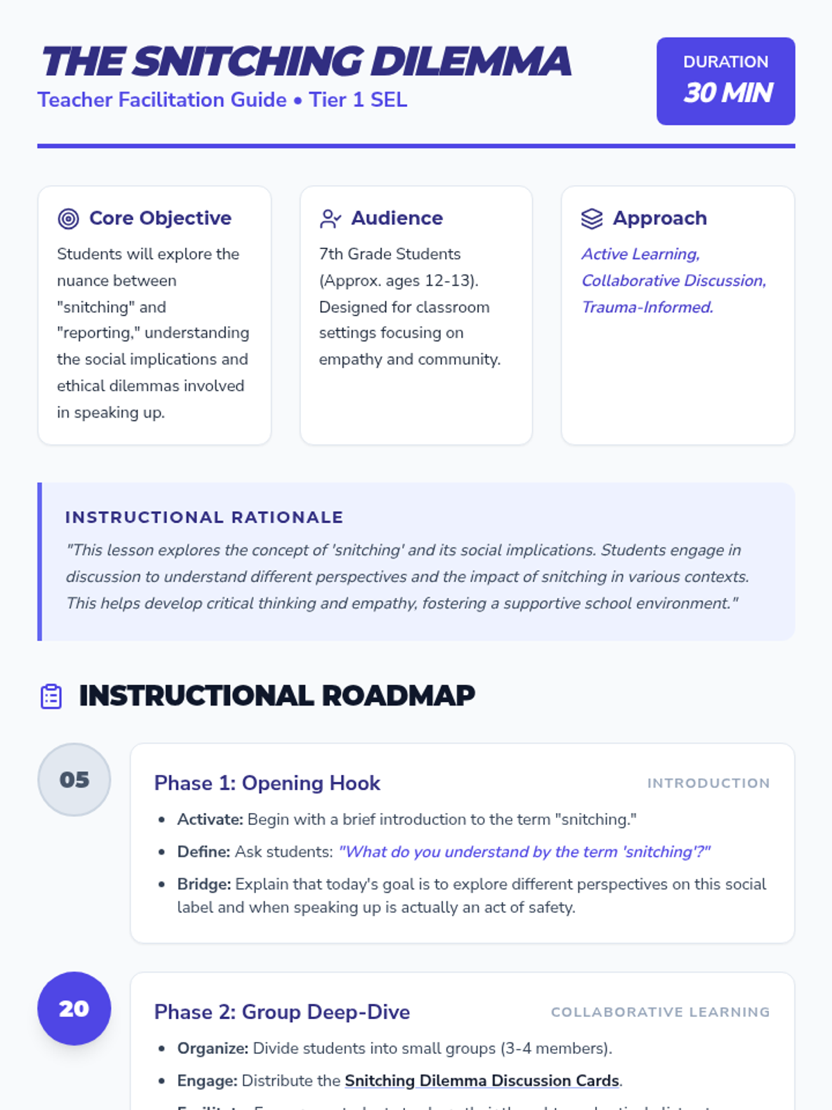 A 30-minute lesson for 7th graders to explore the social implications and ethics of 'snitching' versus 'reporting' to foster empathy and critical thinking.