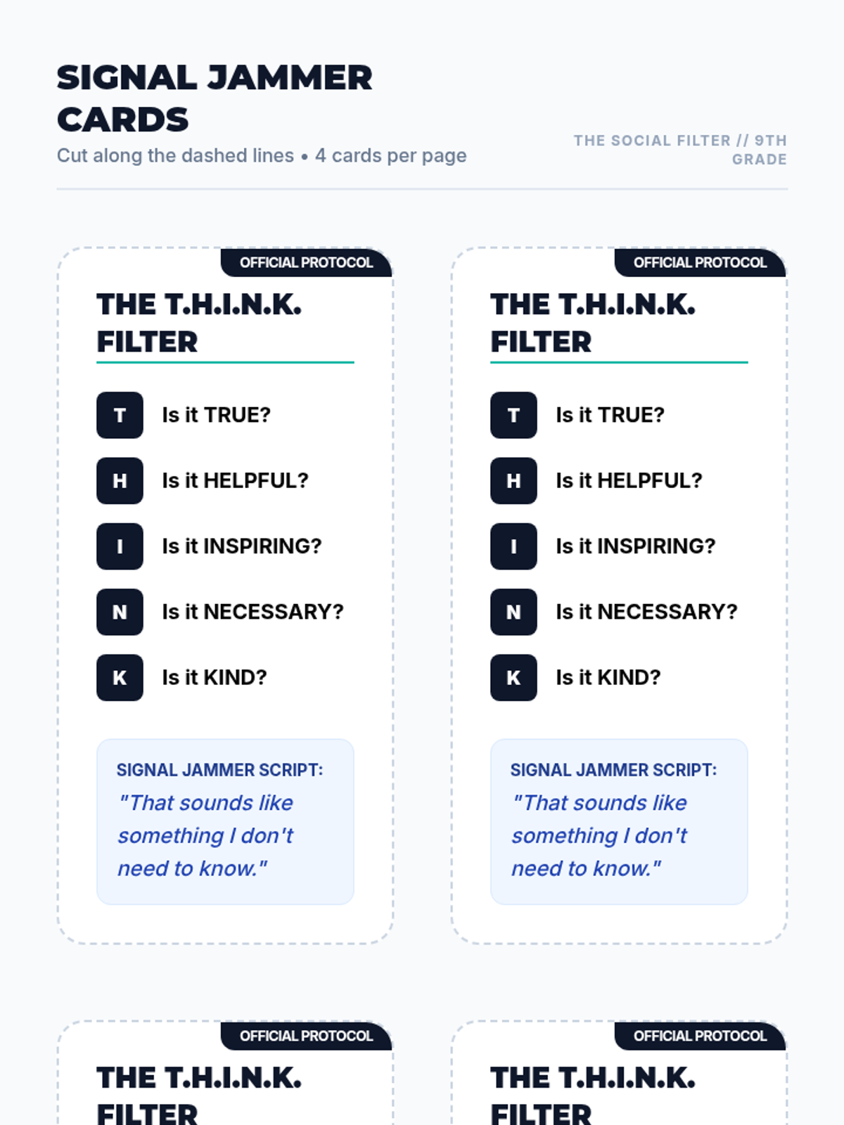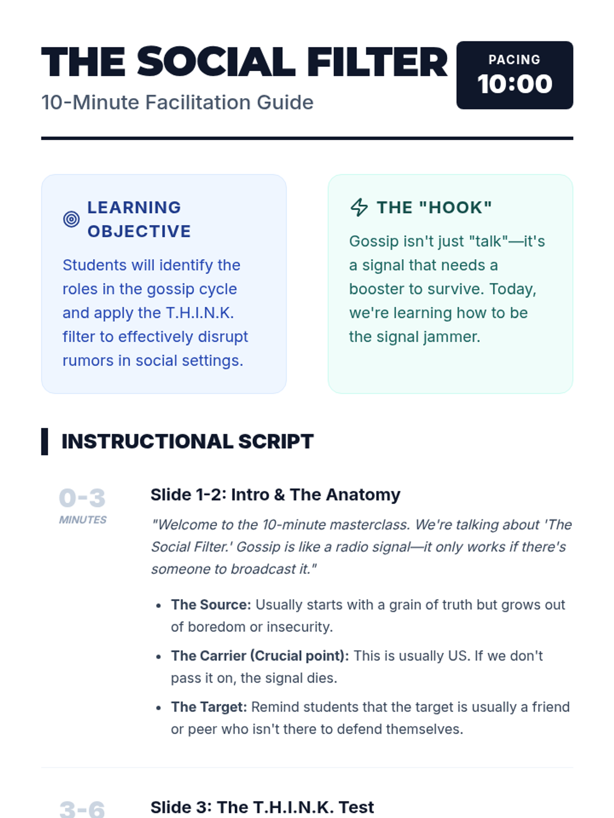 A high-impact, 10-minute workshop for 9th graders on identifying gossip and using the T.H.I.N.K. filter to stop rumors in their tracks.