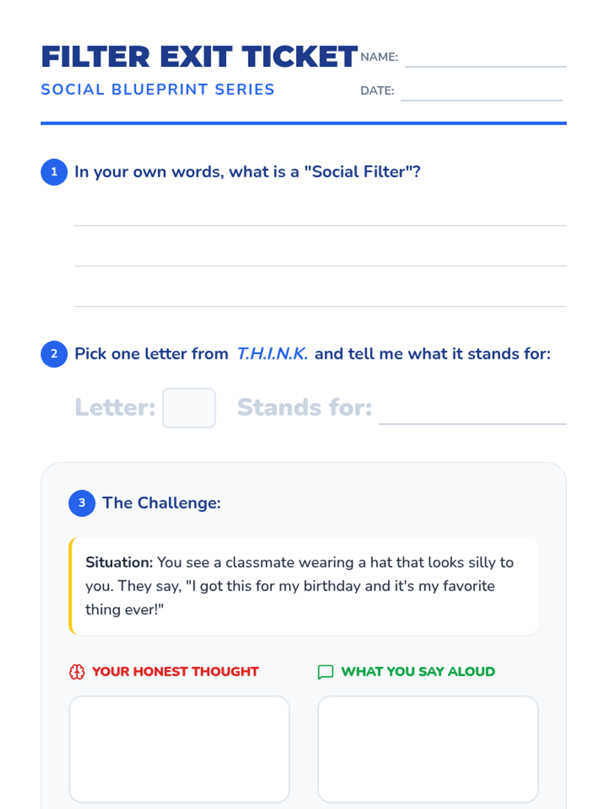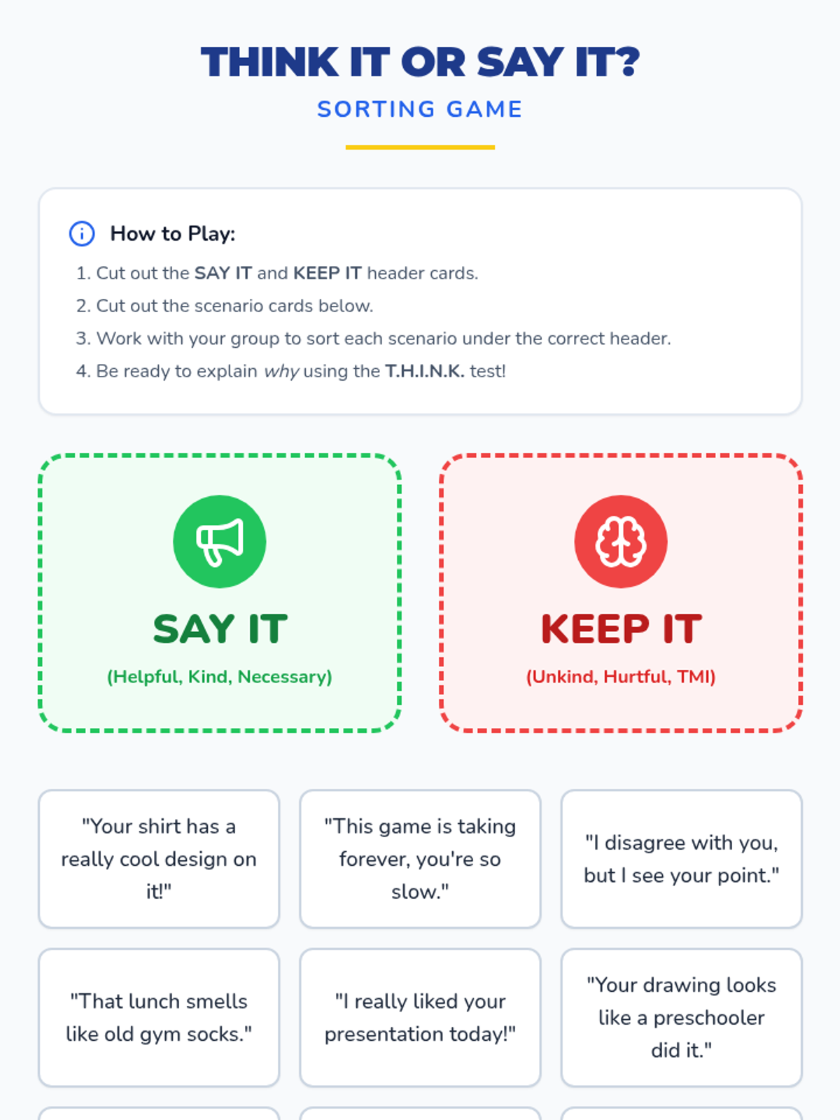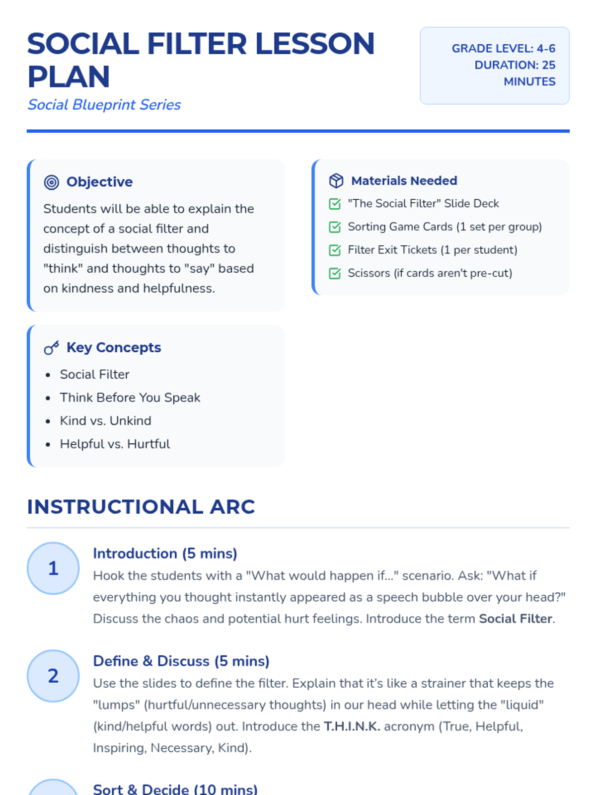 A 25-minute social-emotional learning lesson for grades 4-6 that teaches the concept of a 'social filter'—the internal process of deciding which thoughts to say aloud and which to keep inside. Students will practice identifying kind, helpful, and necessary communication through discussion and a sorting activity.