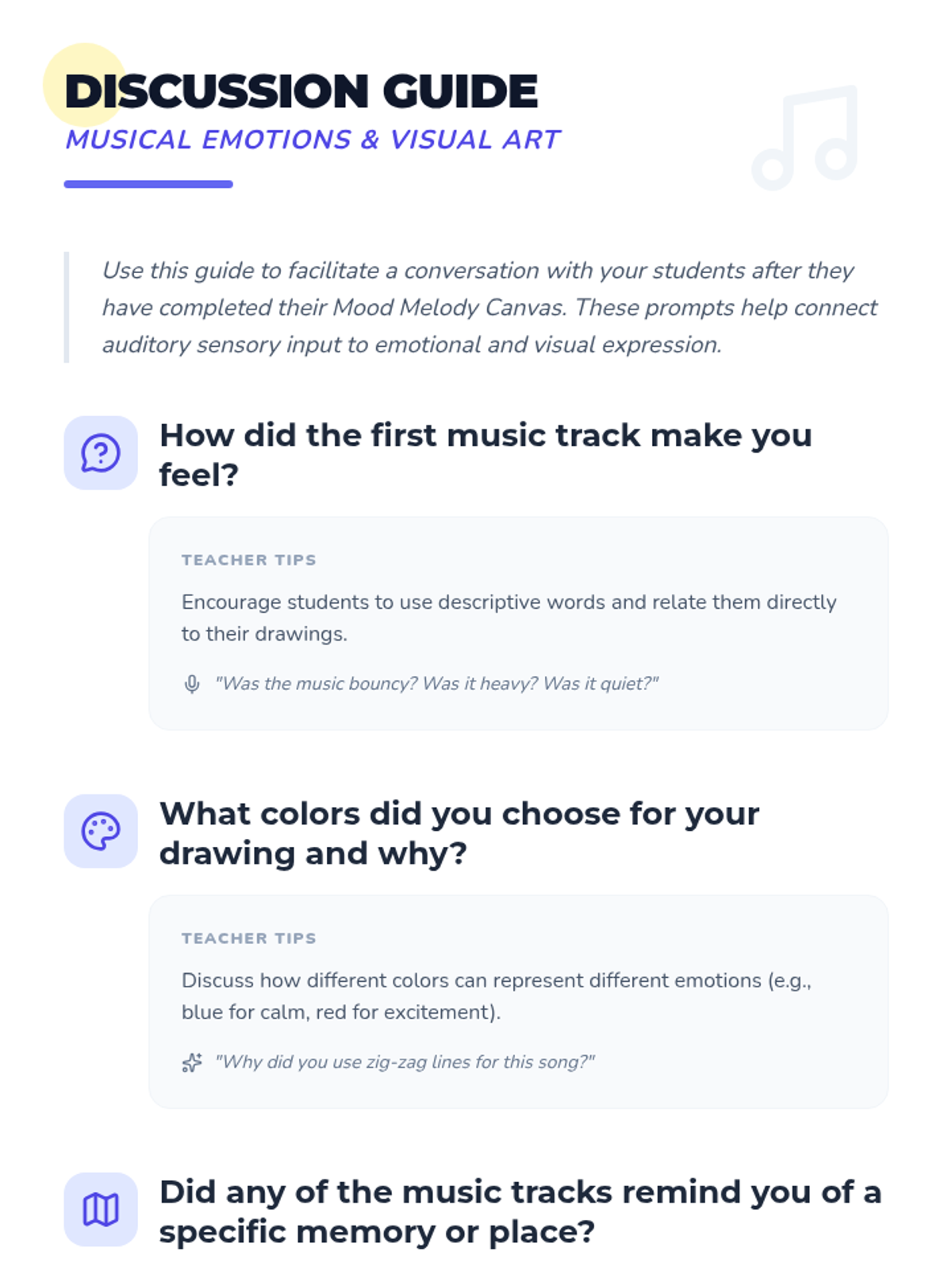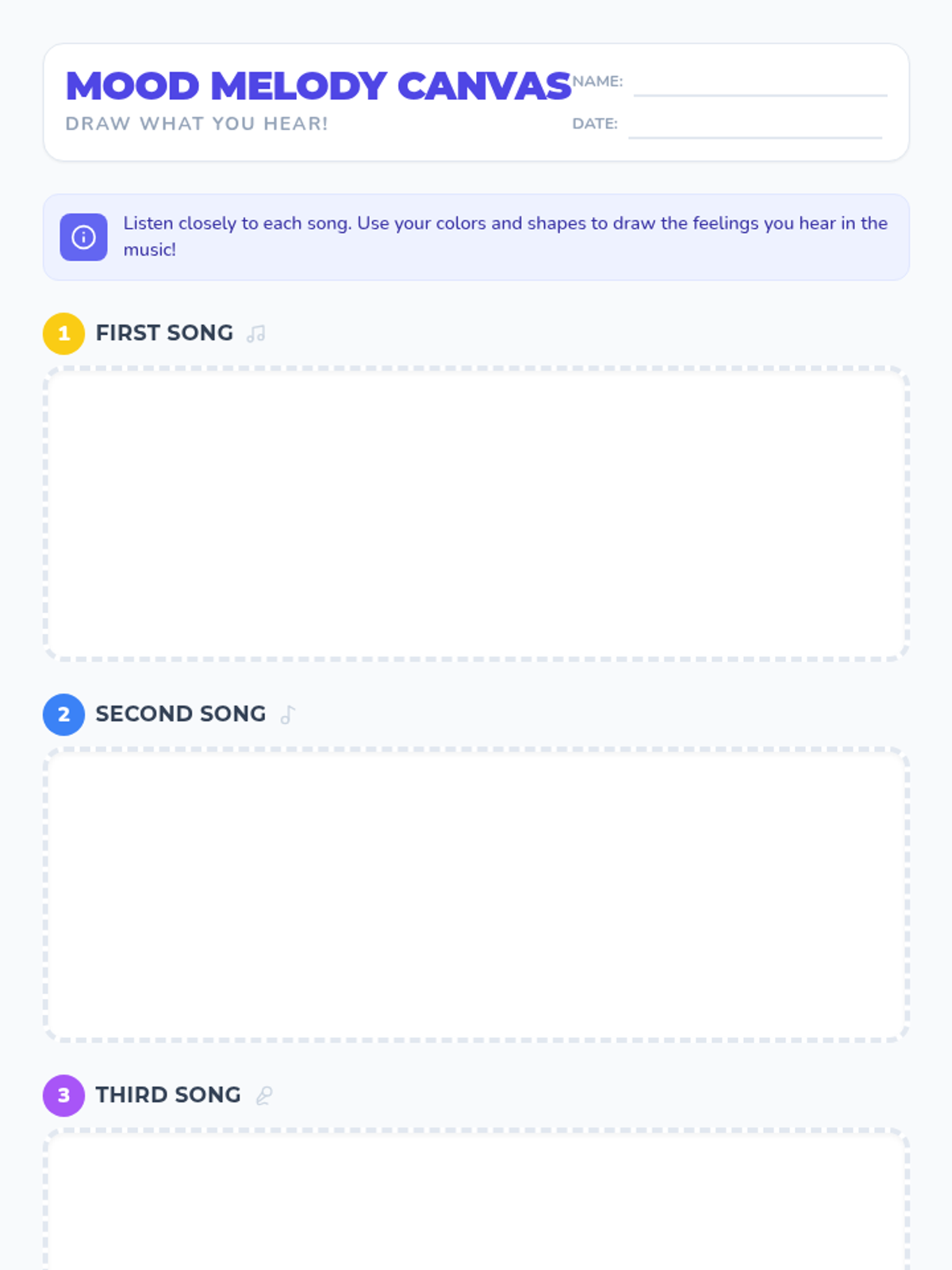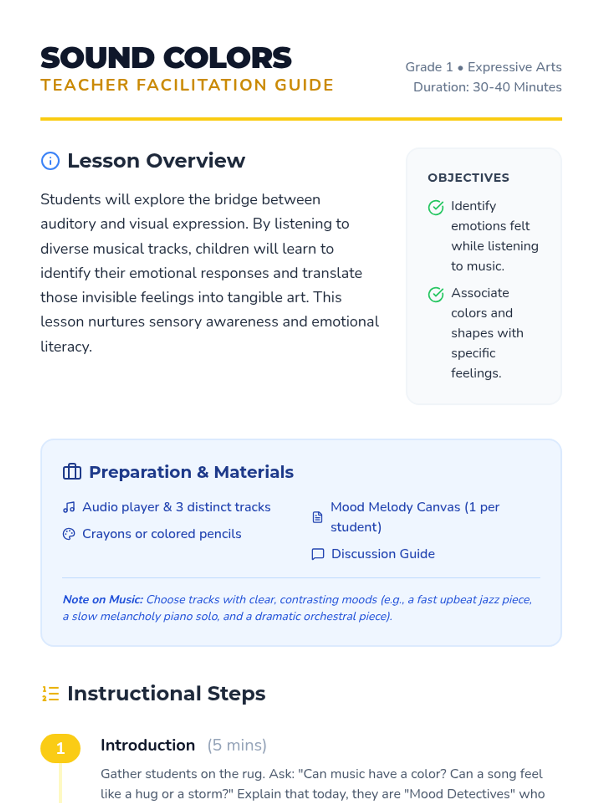 A creative first-grade lesson where students explore the emotional connection between music and art by drawing their feelings while listening to various tracks.