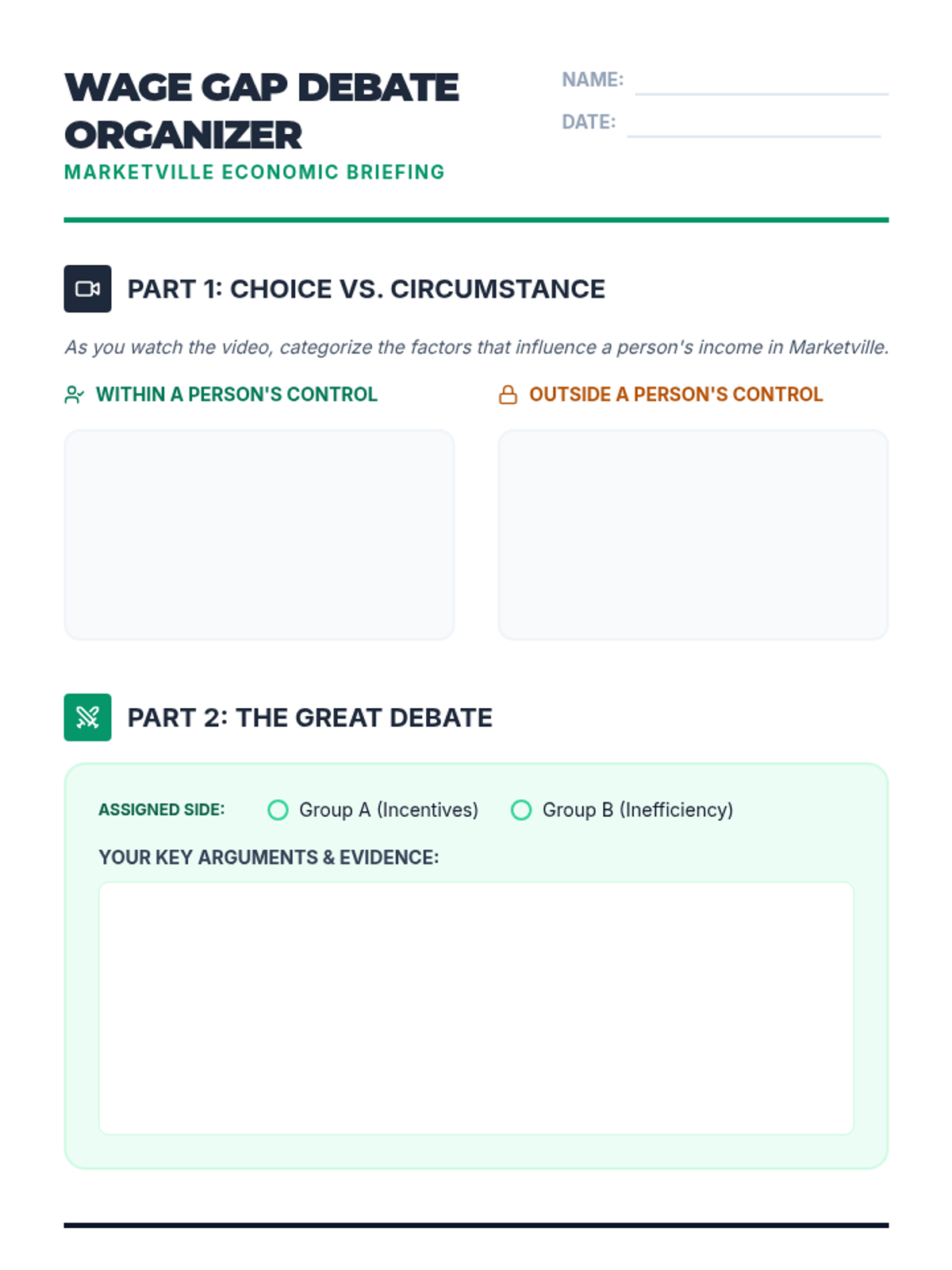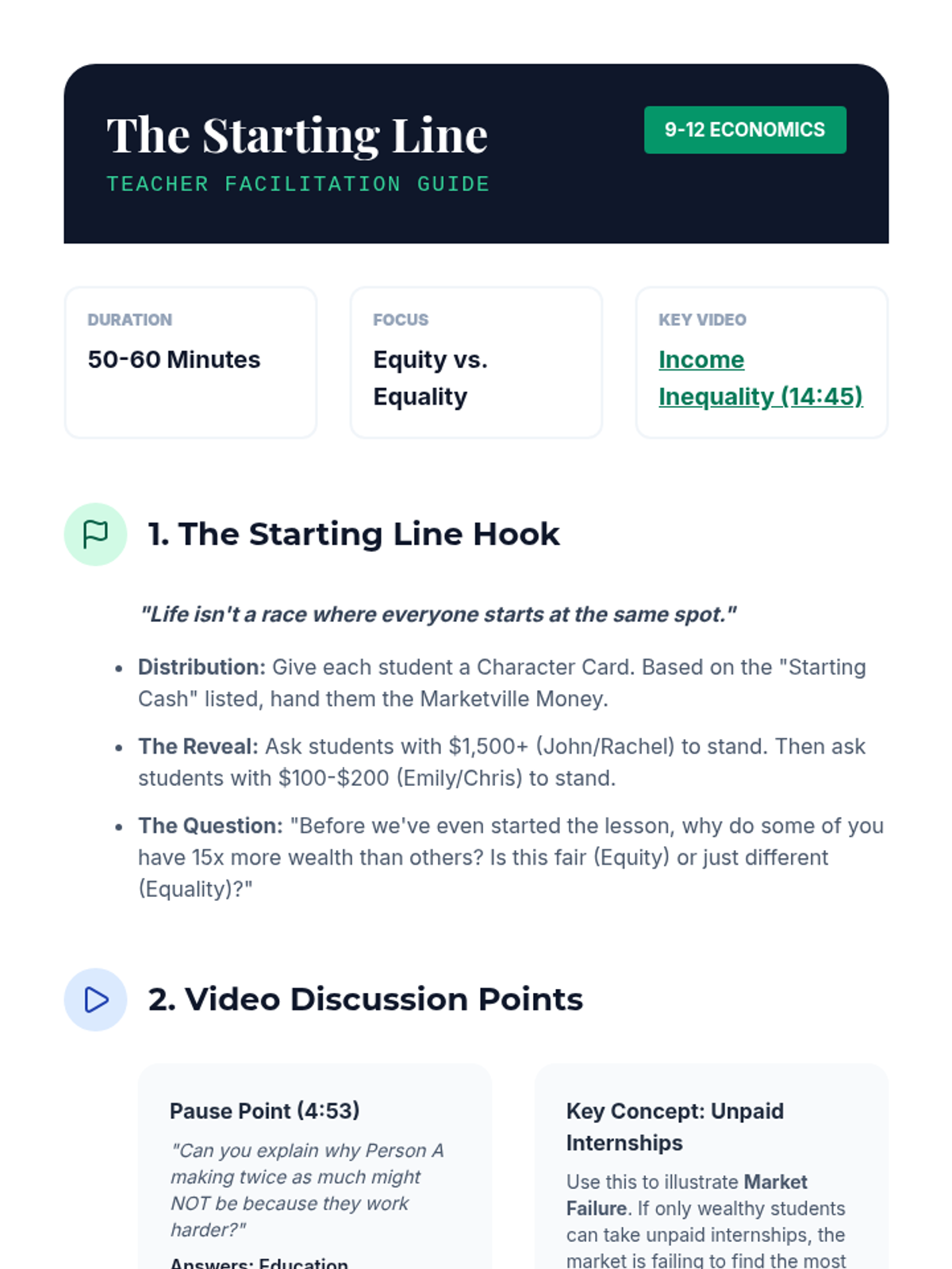A lesson exploring the economic causes and consequences of income inequality, focusing on the distinction between equity and equality and the role of market versus non-market factors.