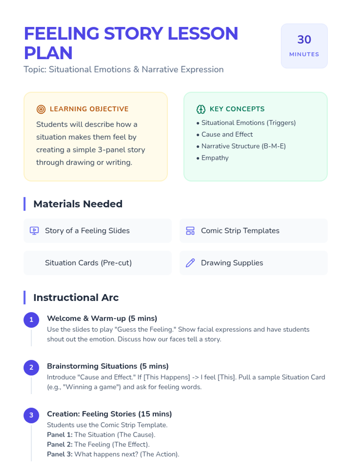 Students explore the connection between events and emotions by creating a three-part narrative comic. This lesson focuses on identifying situational triggers and expressing feelings through drawing and simple writing.