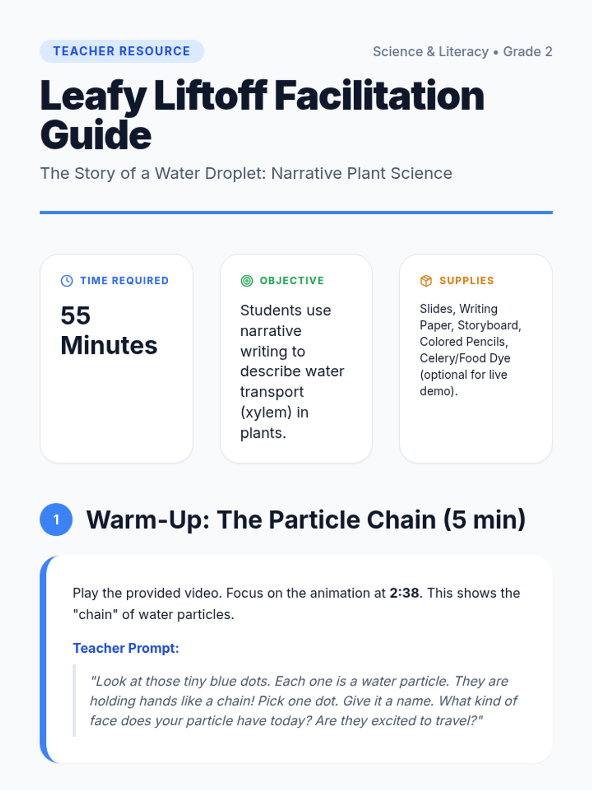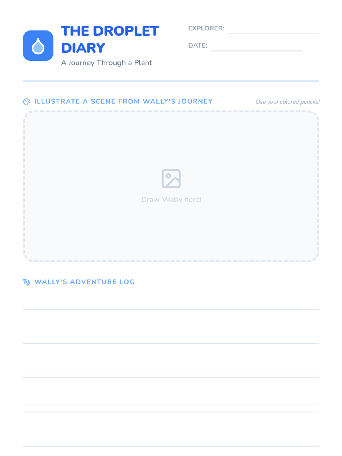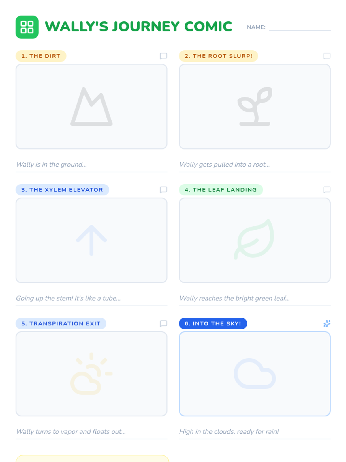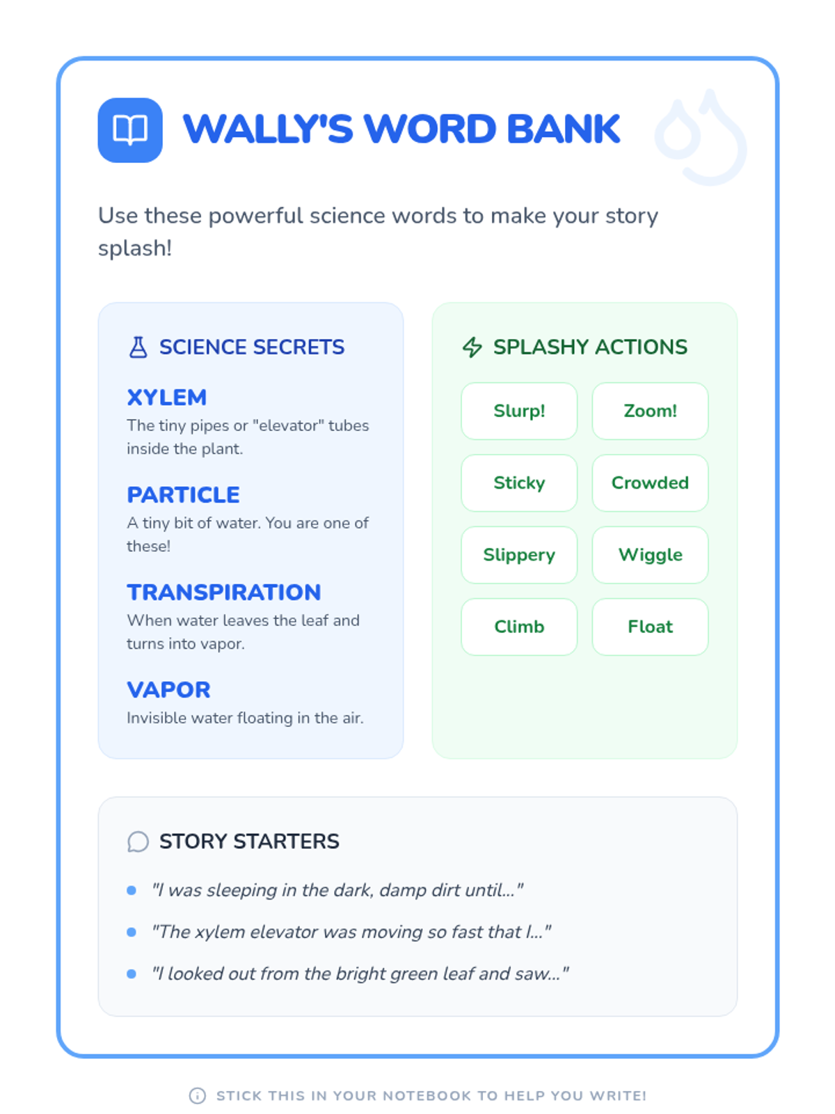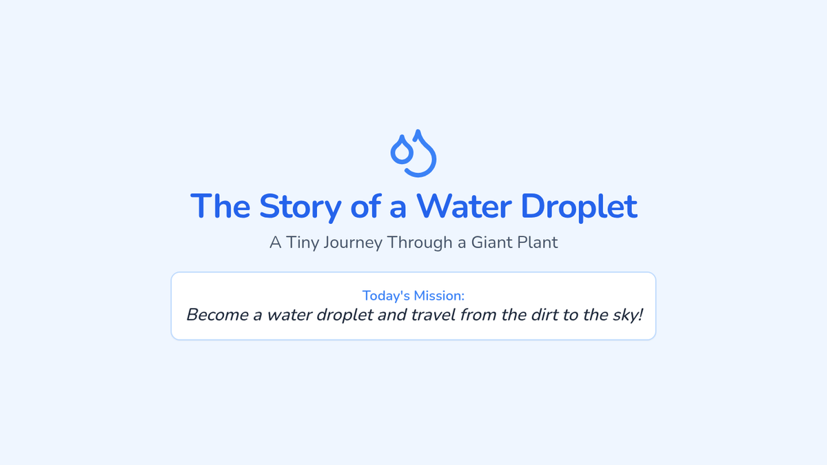 Students explore the movement of water through plants by writing a first-person narrative or comic strip from the perspective of 'Wally' the water droplet, using a celery experiment video to understand the xylem 'elevator'.