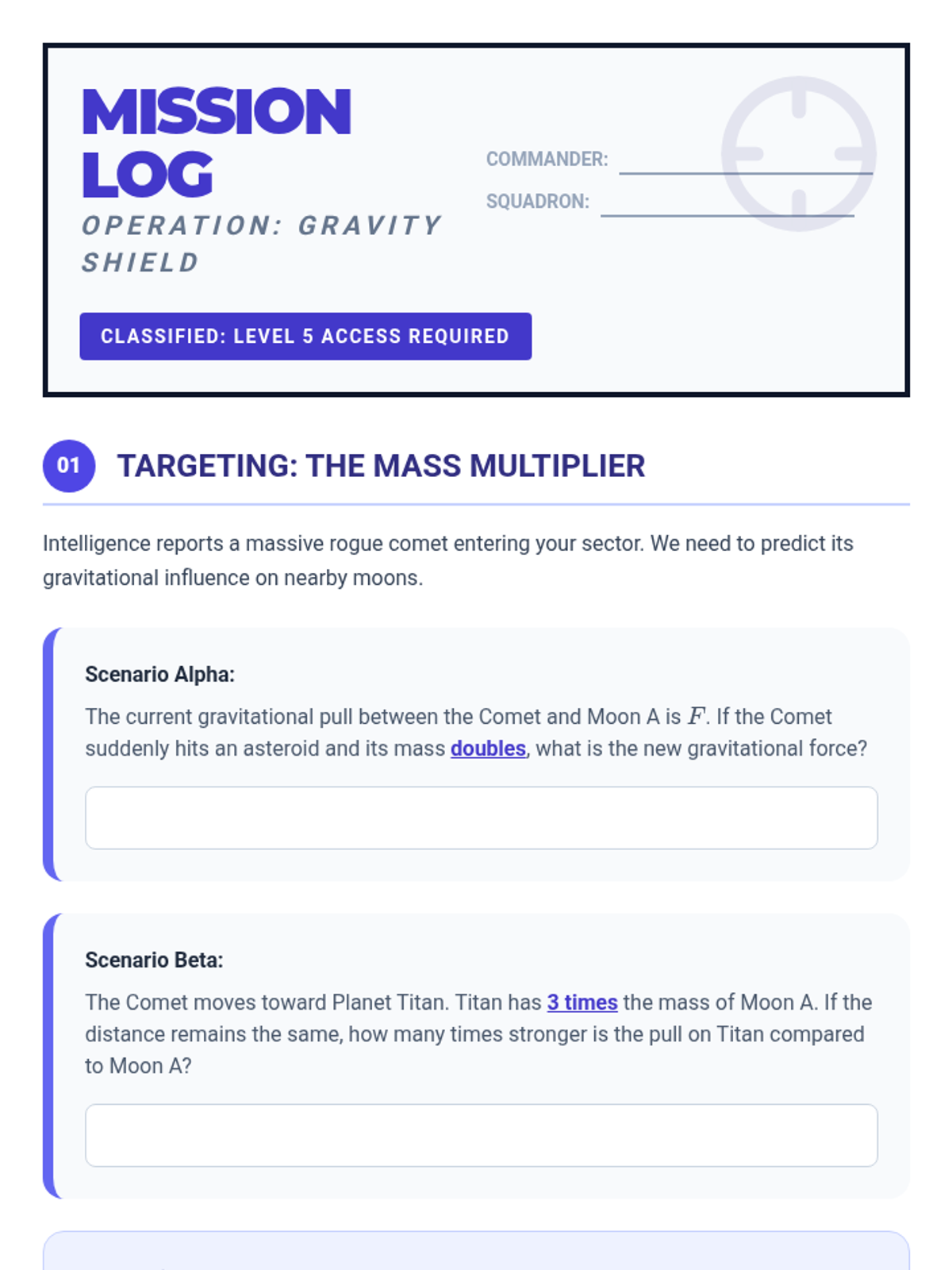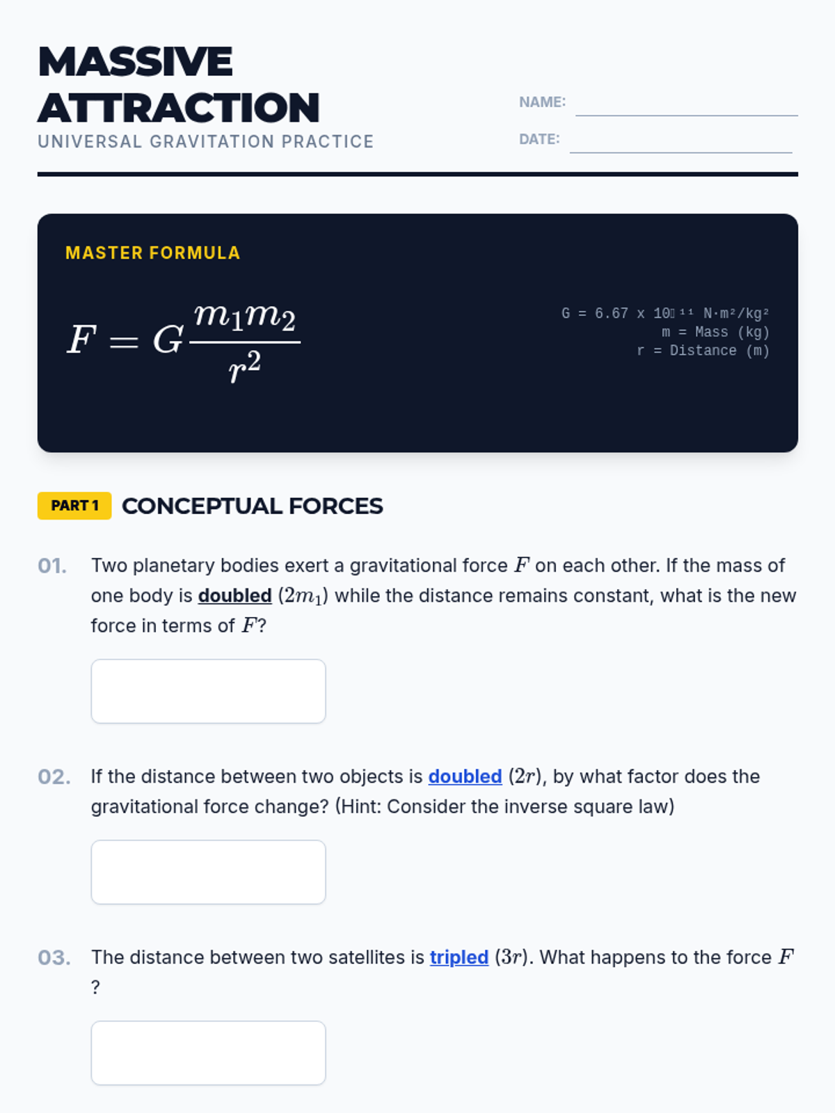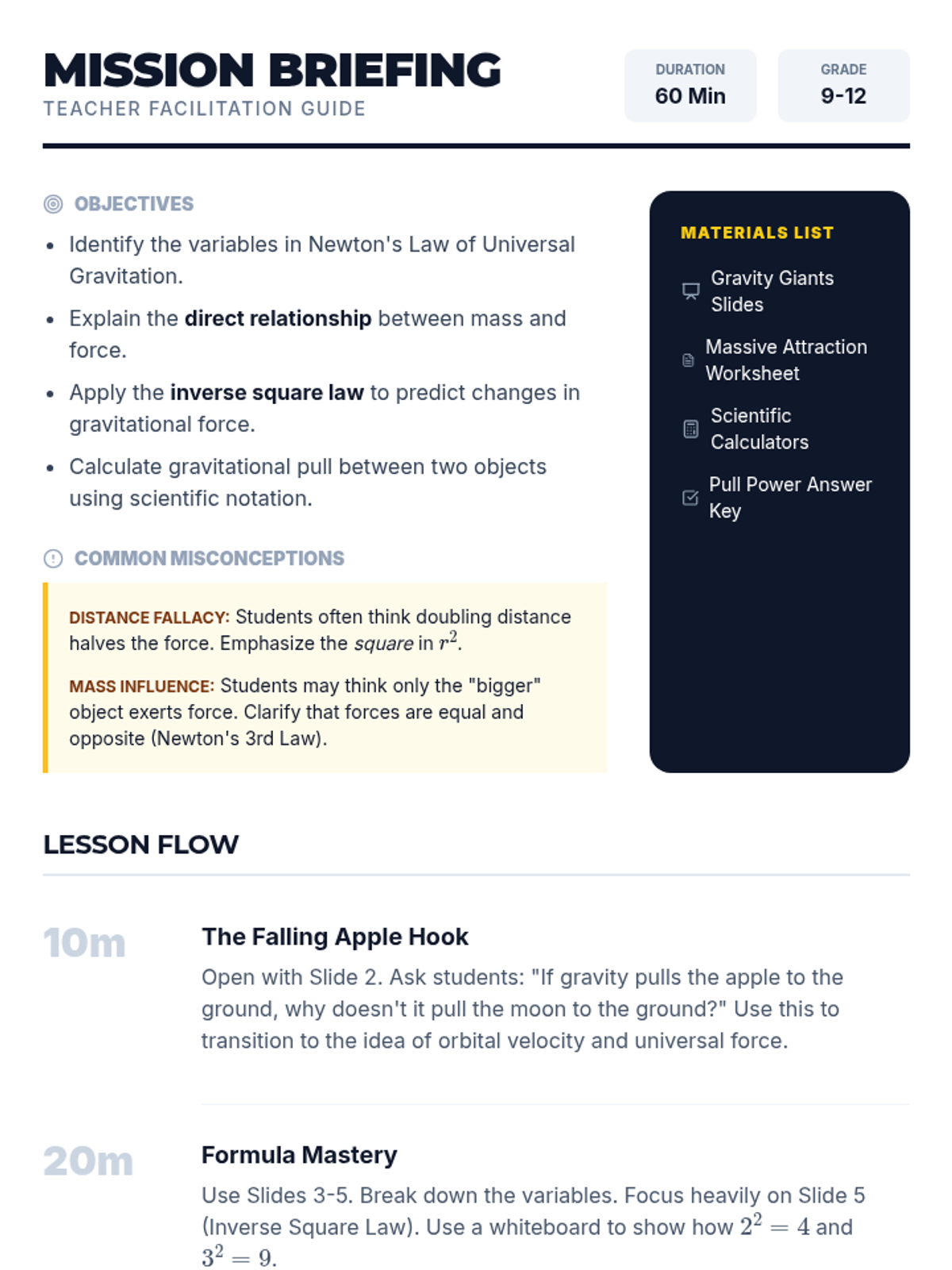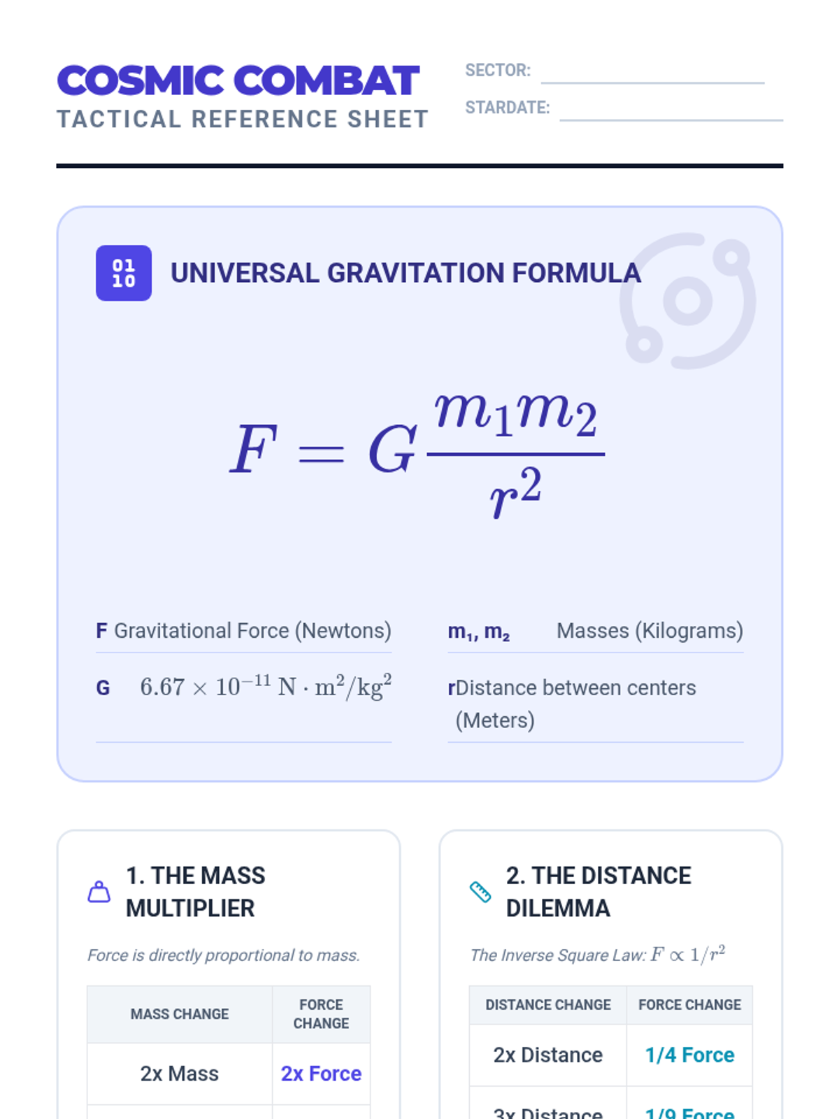 An interactive exploration of Newton's Law of Universal Gravitation through visual models, collaborative problem-solving, and a "Cosmic Combat" calculation challenge. Students will master the inverse-square law and the relationship between mass and force.