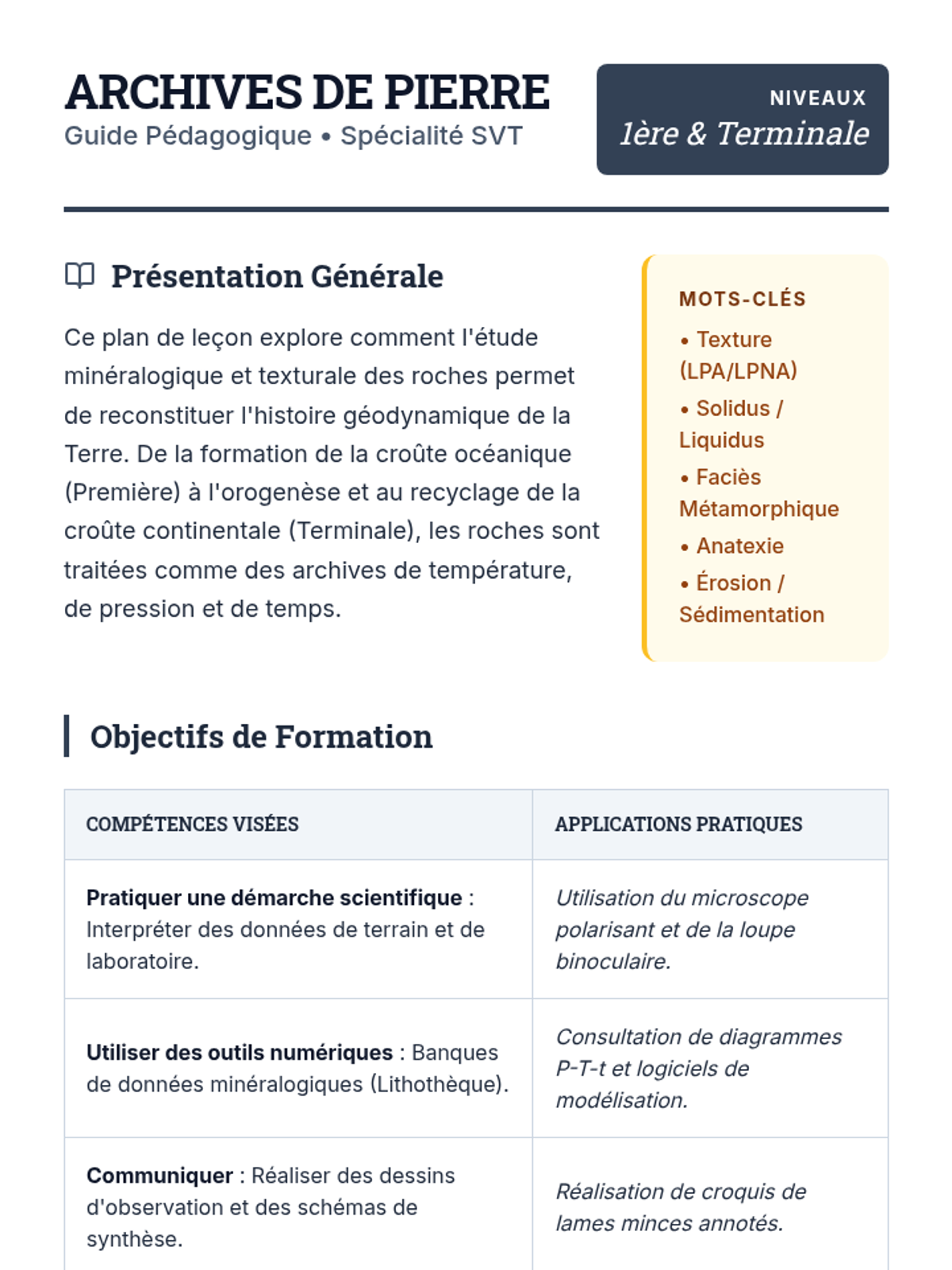 Une séquence complète sur l'identification des roches et leur interprétation géodynamique pour les classes de Première et Terminale Spécialité SVT. Comprend un guide pédagogique, un support visuel et des activités pratiques de minéralogie.